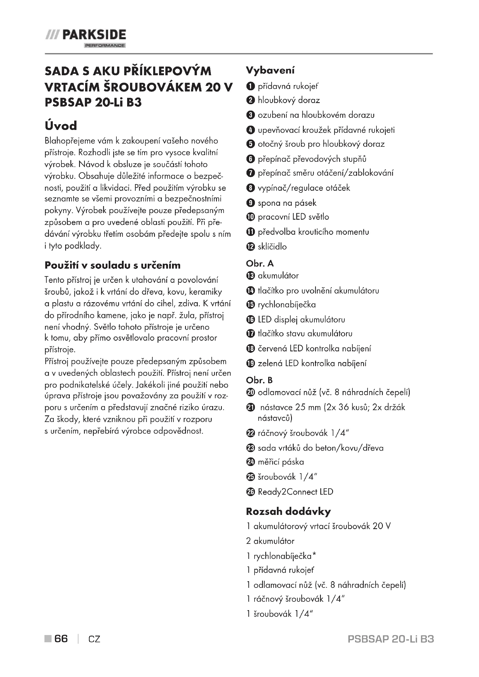 PSBSAP 20-Li B3 Úvod Blahopřejeme vám kzakoupení vašeho nového přístroje. Rozhodli jste se tím pro vysoce kvalitní výrobek. Návod kobsluze je součástí tohoto výrobku. Obsahuje důležité informace obezpeč- nosti, použití a likvidaci. Před použitím výrobku se seznamte se všemi provozními a bezpečnostními pokyny. Výrobek používejte pouze předepsaným způsobem a pro uvedené oblasti použití. Při pře- dávání výrobku třetím osobám předejte spolu sním ityto podklady. Použití vsouladu surčením Tento přístroj je určen kutahování a povolování šroubů, jakož i kvrtání do dřeva, kovu, keramiky a plastu a rázovému vrtání do cihel, zdiva. Kvrtání do přírodního kamene, jako je např. žula, přístroj není vhodný. Světlo tohoto přístroje je určeno ktomu, aby přímo osvětlovalo pracovní prostor přístroje. Přístroj používejte pouze předepsaným způsobem a vuvedených oblastech použití. Přístroj není určen pro podnikatelské účely. Jakékoli jiné použití nebo úprava přístroje jsou považovány za použití vroz- poru surčením a představují značné riziko úrazu. Za škody, které vzniknou při použití vrozporu surčením, nepřebírá výrobce odpovědnost. Vybavení 1přídavná rukojeť 2hloubkový doraz 3 ozubení na hloubkovém dorazu 4 upevňovací kroužek přídavné rukojeti 5 otočný šroub pro hloubkový doraz 6 přepínač převodových stupňů 7 přepínač směru otáčení/zablokování 8 vypínač/regulace otáček 9 spona na pásek 0 pracovní LED světlo q předvolba krouticího momentu w sklíčidlo Obr.A e akumulátor r tlačítko pro uvolnění akumulátoru t rychlonabíječka z LED displej akumulátoru u tlačítko stavu akumulátoru i červená LED kontrolka nabíjení o zelená LED kontrolka nabíjení Obr.B p odlamovací nůž (vč. 8 náhradních čepelí) a nástavce 25 mm (2x 36 kusů; 2x držák nástavců) s ráčnový šroubovák 1/4“ d sada vrtáků do beton/kovu/dřeva f měřicí páska g šroubovák 1/4“ h Ready2Connect LED Rozsah dodávky 1 akumulátorový vrtací šroubovák 20 V 2 akumulátor 1 rychlonabíječka* 1přídavná rukojeť 1 odlamovací nůž (vč. 8 náhradních čepelí) 1 ráčnový šroubovák 1/4“ 1 šroubovák 1/4“PSBSAP 20-Li B3 CZ