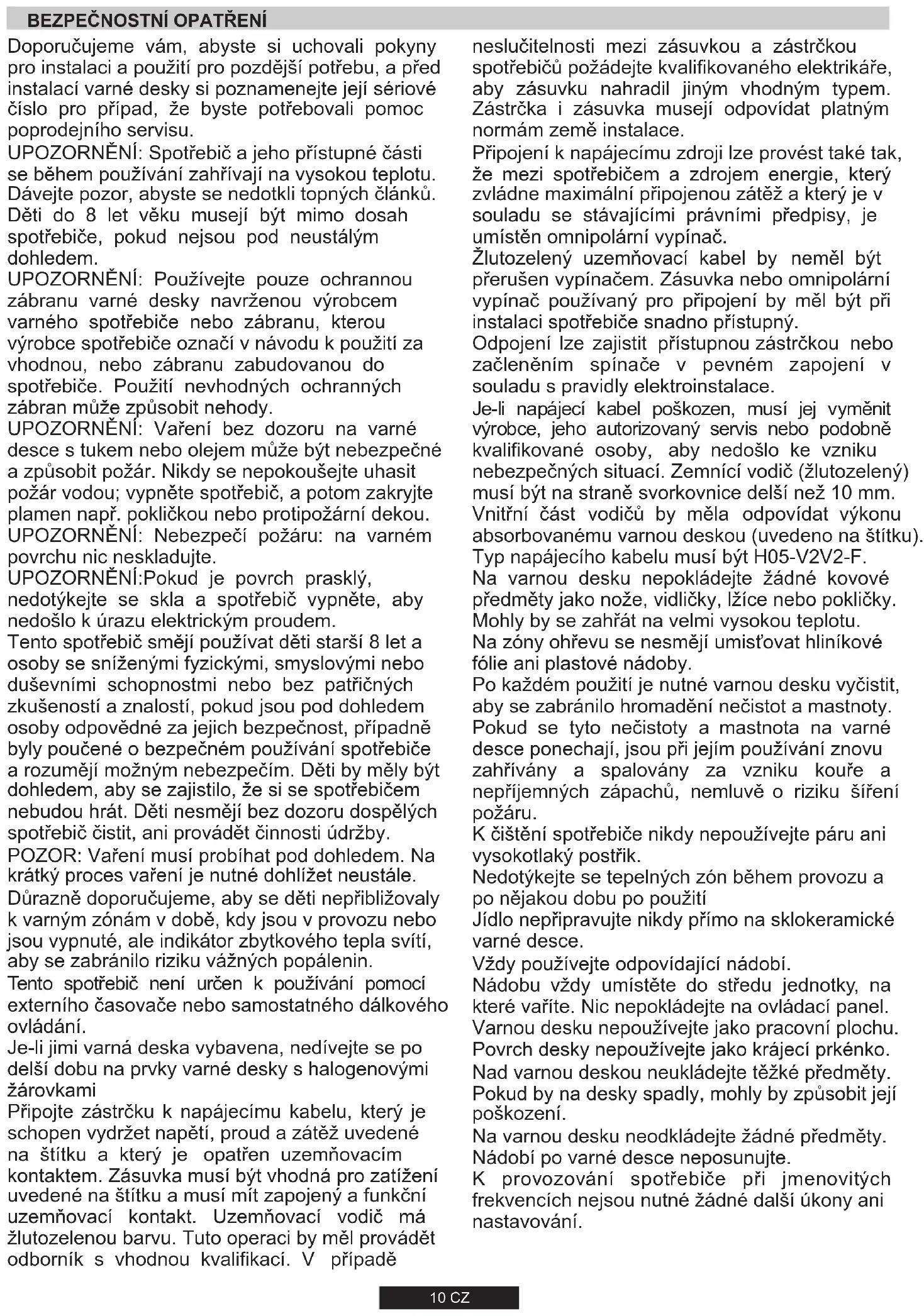 L'appareil est conforme à la Directive européenne 2009/142/CE (GAD) et à partir du 21/04/2018, à la Réglementation sur les appareils à gaz 2016/426 (GAR). En utilisant le symbol sur ce produit, nous déclarons sur notre propre responsabilité que ce produit est conforme à toutes les normes Européennes relatives à la sécurité, la santé et à l’environnement.10 CZ Doporučujeme vám, abyste si uchovali pokyny pro instalaci a použití pro pozdější potřebu, a před instalací varné desky si poznamenejte její sériové číslo pro případ, že byste potřebovali pomoc poprodejního servisu. UPOZORNĚNÍ: Spotřebič a jeho přístupné části se během používání zahřívají na vysokou teplotu. Dávejte pozor, abyste se nedotkli topných článků. Děti do 8 let věku musejí být mimo dosah spotřebiče, pokud nejsou pod neustálým dohledem. UPOZORNĚNÍ: Používejte pouze ochrannou zábranu varné desky navrženou výrobcem varného spotřebiče nebo zábranu, kterou výrobce spotřebiče označí v návodu k použití za vhodnou, nebo zábranu zabudovanou do spotřebiče. Použití nevhodných ochranných zábran může způsobit nehody. UPOZORNĚNÍ: Vaření bez dozoru na varné desce s tukem nebo olejem může být nebezpečné a způsobit požár. Nikdy se nepokoušejte uhasit požár vodou; vypněte spotřebič, a potom zakryjte plamen např. pokličkou nebo protipožární dekou. UPOZORNĚNÍ: Nebezpečí požáru: na varném povrchu nic neskladujte. UPOZORNĚNÍ:Pokud je povrch prasklý, nedotýkejte se skla a spotřebič vypněte, aby nedošlo k úrazu elektrickým proudem. Tento spotřebič smějí používat děti starší 8 let a osoby se sníženými fyzickými, smyslovými nebo duševními schopnostmi nebo bez patřičných zkušeností a znalostí, pokud jsou pod dohledem osoby odpovědné za jejich bezpečnost, případně byly poučené o bezpečném používání spotřebiče a rozumějí možným nebezpečím. Děti by měly být dohledem, aby se zajistilo, že si se spotřebičem nebudou hrát. Děti nesmějí bez dozoru dospělých spotřebič čistit, ani provádět činnosti údržby. POZOR: Vaření musí probíhat pod dohledem. Na krátký proces vaření je nutné dohlížet neustále. Důrazně doporučujeme, aby se děti nepřibližovaly k varným zónám v době, kdy jsou v provozu nebo jsou vypnuté, ale indikátor zbytkového tepla svítí, aby se zabránilo riziku vážných popálenin. Tento spotřebič není určen k používání pomocí externího časovače nebo samostatného dálkového ovládání. Je-li jimi varná deska vybavena, nedívejte se po delší dobu na prvky varné desky s halogenovými žárovkami Připojte zástrčku k napájecímu kabelu, který je schopen vydržet napětí, proud a zátěž uvedené na štítku a který je opatřen uzemňovacím kontaktem. Zásuvka musí být vhodná pro zatížení uvedené na štítku a musí mít zapojený a funkční uzemňovací kontakt. Uzemňovací vodič má žlutozelenou barvu. Tuto operaci by měl provádět odborník s vhodnou kvalifikací. V případě