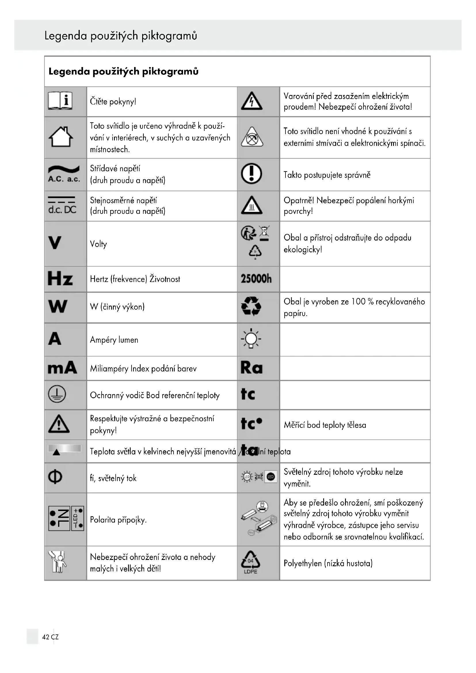 Záruka.............................................................................................................................................Strana 45 Adresa servisu................................................................................................................................Strana 46 Prohlášení o shodě.........................................................................................................................Strana 46 Výrobce.......................................................................................................................................... Strana 46 Obsah CZ 41Legenda použitých piktogramů Čtěte pokyny! Varování před zasažením elektrickým proudem! Nebezpečí ohrožení života! Toto svítidlo je určeno výhradně k použí vání v interiérech, v suchých a uzavřených místnostech. Toto svítidlo není vhodné k používání s externími stmívači a elektronickými spínači. Střídavé napětí (druh proudu a napětí) Takto postupujete správně Stejnosměrné napětí (druh proudu a napětí) Opatrně! Nebezpečí popálení horkými povrchy! Volty Obal a přístroj odstraňujte do odpadu ekologicky! Hertz (frekvence) Životnost W (činný výkon) Obal je vyroben ze 100 % recyklovaného papíru. Ampéry lumen Miliampéry Index podání barev Ochranný vodič Bod referenční teploty Respektujte výstražné a bezpečnostní pokyny! Měřící bod teploty tělesa Teplota světla v kelvinech nejvyšší jmenovitá / okolní teplota fí, světelný tok Světelný zdroj tohoto výrobku nelze vyměnit.