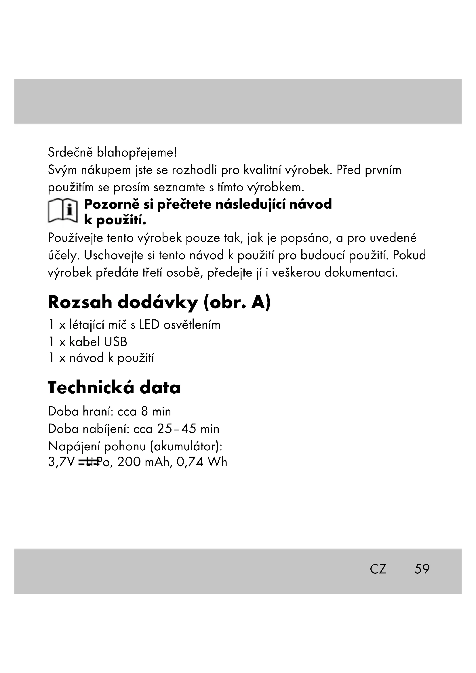 světelná lišta LED (1c) po krátkém bliknutí zhasne. Výrobek se nyní nachází v pohotovostním režimu. Upozornění: Poté, co se listy rotoru přestanou otáčet, můžete také stisknout tlačítko (1b). Předmět neházejte na zem. Uskladnění, čištění Pokud výrobek nepoužíváte, skladujte jej vždy suchý a čistý při pokojové teplotě. Čistěte pouze vlhkým hadříkem a následně otřete do sucha. DŮLEŽITÉ! K čištění nikdy nepoužívejte agresivní čisticí prostředky. Pokyny k likvidaci Tento doprovodný symbol označuje, že toto zařízení podléhá směrnici 2012/19/EU. Tato směrnice uvádí, že toto zařízení nesmíte po skončení jeho životnosti likvidovat s běžným domovním odpadem, ale musíte jej odevzdat na speciálně zřízených sběrných místech, v recyklačních střediscích nebo ve společnostech pro likvidaci odpadu. Chraňte životní prostředí a provádějte řádnou likvidaci.65CZ Poškození životního prostředí v důsledku nesprávné likvidace baterií/ akumulátorů! Baterie/akumulátory nesmějí být likvidovány spolu s komunálním odpadem. Mohou obsahovat toxické těžké kovy a podléhají zpracování nebezpečného odpadu. Chemické symboly těžkých kovů jsou následující: Cd = kadmium, Hg = rtuť, Pb = olovo. Použité baterie/akumulátory proto likvidujte v místním sběrném místě. O možnostech likvidace vysloužilého výrobku se informujte u Vaší obecní nebo městské správy. Výrobek a obaly likvidujte ekologicky. Uchovávejte obalové materiály (jako např. fóliové sáčky) nedostupné pro děti. Při třídění odpadu dodržujte označení balicích materiálů, které jsou označeny zkratkami (a) a čísly (b) s následujícím významem: 1–7: plasty / 20–22: papír a karton / 80– 98: smíšený odpad. Výrobek a balicí materiály jsou recyklovatelné, likvidujte je odděleně pro lepší zpracování odpadu. Logo Triman platí pouze pro Francii.66 CZ Pokyny k záruce a průběhu služby Výrobek byl vyroben s velkou péčí a za stálé kontroly. DELTA-SPORT HANDELSKONTOR GmbH poskytuje koncovým privátním zákazní- kům na tento výrobek tři roky záruky od data nákupu (záruční lhůta) podle následující ustanovení. Záruka se týká pouze vad materiálu a závad ve zpracování. Záruka se nevztahuje na díly, které podléhají normálnímu opotřebení, a proto je nutné na ně pohlížet jako na rych- le opotřebitelné díly (např. baterie), a na křehké díly, např. vypínače, akumulátory nebo díly vyrobené ze skla. Nároky z této záruky jsou vyloučeny, pokud výrobek byl používán neodborně nebo nedovoleným způsobem nebo nikoli v rámci stanoveného účelu určení nebo předpokládaného rozsahu používání nebo nebyla dodržena zadání v návodu k obsluze, ledaže by konco- vý zákazník prokázal, že existuje vada materiálu nebo došlo k chybě ve zpracování, které nevyplývají z některé výše uvedených okolností. Nároky ze záruky lze uplatnit pouze v rámci záruční lhůty po předlo- žení originálního pokladního dokladu. Proto si prosím uschovejte ori- ginál pokladního dokladu. Doba záruky se neprodlužuje případnými opravami na základě záruky, zákonné záruky nebo kulance. Totéž platí také pro vyměněné a opravené díly.67CZ Při reklamacích se prosím obracejte na níže uvedenou horkou linku servisu nebo se s námi spojte e-mailem. Pokud se vyskytne případ reklamace, výrobek Vám – dle naší volby – bezplatně opravíme, vyměníme nebo Vám vrátíme kupní cenu. Další práva ze záruky nevznikají. Vaše zákonná práva, zejména nároky na zajištění záruky vůči kon- krétnímu prodejci, nejsou touto zárukou omezena. IAN: 419744_2201 Servis Česko Tel.: 800 143 873 E-Mail: deltasport@lidl.cz68 SK Blahoželáme! Svojím nákupom ste sa rozhodli pre kvalitný výrobok. Pred prvým použitím sa s výrobkom dôkladne oboznámte. Pozorne si prečítajte tento návod na použivanie. Výrobok používajte len uvedeným spôsobom a na uvedený účel. Tento návod na použivanie si dobre uschovajte. Pri odovzdávaní výrobku tretej osobe odovzdajte s výrobkom aj všetky podklady. Obsah balenia (obr. A) 1 x lietajúca guľa s LED-osvetlením 1 x USB-kábel 1 x návod na používanie Technické údaje Hracia doba: cca 8 min. Doba nabíjania: cca 25–45 min Zásobovanie energiou pohon (akumulátor): 3,7V Li-Po, 200 mAh, 0,74 Wh69SK USB-kábel (typ C): Vstup: 5V