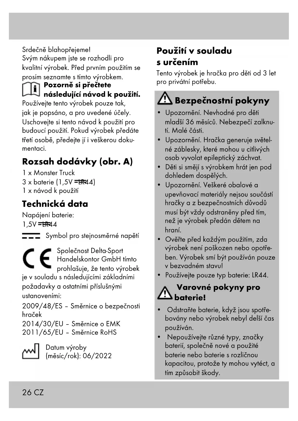 - Svorky přípoje se nesmí spojovat nakrátko. Vkládání/výměna baterií (obr. A) UPOZORNĚNÍ! Dodržujte násle- dující pokyny, abyste se vyhnuli mechanickým a elektrickým poškozením. Před prvním použitím výrobku odstraňte ochrannou fólii (1a) (obr. A). Při vkládání a výměně baterií (2) postu- pujte podle obrázku A. Upozornění: Potřebujete vhodný šroubovák (není obsahem dodávky). Upozornění: Dejte pozor na plus/ minus póly baterií a na správné vložení. Baterie se musí kompletně nacházet v držáku baterie. Používání (obr. B) Stisknutím střechy (1b) aktivujte světla a zvuky. Uskladnění, čistění Pokud výrobek nepoužíváte, skladujte jej vždy suchý, čistý, bez baterií a při pokojové teplotě. Utírejte pouze suchým hadříkem. DŮLEŽITÉ! K čištění nikdy nepoužívejte agresivní čisticí prostředky.28 CZ Pokyny k likvidaci Tento doprovodný symbol označuje, že toto zařízení podléhá směrnici 2012/19/EU. Tato směrnice uvádí, že toto zařízení nesmíte po skončení jeho životnosti likvidovat s běžným domovním odpadem, ale musíte jej odevzdat na speciálně zřízených sběrných místech, v recyklačních střediscích nebo ve společnostech pro likvidaci odpadu. Chraňte životní prostředí a provádějte řádnou likvidaci. Poškození životního prostředí v důsledku nesprávné likvidace baterií/akumulátorů! Baterie/akumulátory nesmějí být likvidovány spolu s komunálním odpadem. Mohou obsahovat toxické těžké kovy a podléhají zpracování nebezpečného odpadu. Chemické symboly těžkých kovů jsou následující: Cd = kadmium, Hg = rtuť, Pb = olovo. Použité baterie/akumulátory proto likvidujte v místním sběrném místě. O možnostech likvidace vysloužilého výrobku se informujte u Vaší obecní nebo městské správy. Výrobek a obaly likvidujte ekologicky. Uchovávejte obalové materiály (jako např. fóliové sáčky) nedostupné pro děti. Při třídění odpadu dodržujte označení balicích materiálů, které jsou označeny zkratkami (a) a čísly (b) s následujícím významem: 1–7: plasty / 20–22: papír a karton / 80–98: smíšený odpad. Výrobek a balicí materiály jsou recyklovatelné, likvidujte je odděleně pro lepší zpracování odpadu. Logo Triman platí pouze pro Francii. Pokyny k záruce a průběhu služby Výrobek byl vyroben s velkou péčí a za stálé kontroly. DELTA-SPORT HANDELS- KONTOR GmbH poskytuje koncovým privátním zákazníkům na tento výrobek tři roky záruky od data nákupu (záruční lhůta) podle následující ustanovení. Záruka se týká pouze vad materiálu a závad ve zpracování. Záruka se nevzta- huje na díly, které podléhají normálnímu opotřebení, a proto je nutné na ně pohlížet jako na rychle opotřebitelné díly (např. baterie), a na křehké díly, např. vypínače, akumulátory nebo díly vyrobené ze skla. Nároky z této záruky jsou vyloučeny, pokud výrobek byl používán neod- borně nebo nedovoleným způsobem nebo nikoli v rámci stanoveného účelu určení nebo předpokládaného rozsahu používání nebo nebyla dodržena zadání v návodu k obsluze, ledaže by koncový zákazník prokázal, že existuje vada materiálu nebo došlo k chybě ve zpracování, které nevyplývají z některé výše uvedených okolností.29CZ Nároky ze záruky lze uplatnit pouze v rámci záruční lhůty po předložení originálního pokladního dokladu. Proto si prosím uschovejte originál pokladního dokladu. Doba záruky se neprodlužuje případnými opravami na základě záru- ky, zákonné záruky nebo kulance. Totéž platí také pro vyměněné a opravené díly. Při reklamacích se prosím obracejte na níže uvedenou horkou linku servisu nebo se s námi spojte e-mailem. Pokud se vyskytne případ reklamace, výrobek Vám – dle naší volby – bezplatně opra- víme, vyměníme nebo Vám vrátíme kupní cenu. Další práva ze záruky nevznikají. Vaše zákonná práva, zejména nároky na zajištění záruky vůči konkrétnímu pro- dejci, nejsou touto zárukou omezena. IAN: 420984_2201 Servis Česko Tel.: 800143873 E-Mail: deltasport@lidl.cz30 SK Blahoželáme! Svojím nákupom ste sa rozhodli pre kvalitný výrobok. Pred prvým použitím sa s výrobkom dôkladne oboznámte. Pozorne si prečítajte tento návod na použivanie. Výrobok používajte len uvedeným spô- sobom a na uvedený účel. Tento návod na použivanie si dobre uschovajte. Pri odovzdávaní výrobku tretej osobe odo- vzdajte s výrobkom aj všetky podklady. Obsah balenia (obr. A) 1 x Monster Truck 3 x batéria (1,5V LR44) 1 x návod na používanie Technické údaje Zásobovanie energiou batéria: 1,5V LR44 Symbol pre jednosmerné napätie Spoločnosť Delta-Sport Handelskontor GmbH týmto vyhlasuje, že tento výrobok je v súlade s nasledujúcimi základnými požiadavkami a ostatnými príslušnými ustanoveniami: 2009/48/ES – Smernica o bezpečnosti hračiek 2014/30/EU – Smernica o elektromag- netickej Kompatibilite 2011/65/EÚ – Smernica RoHS Dátum výroby (mesiac/rok): 06/2022 Použitie podľa určenia Tento výrobok je hračka pre deti od 3 rokov pre súkromné použitie. Bezpečnostné pokyny