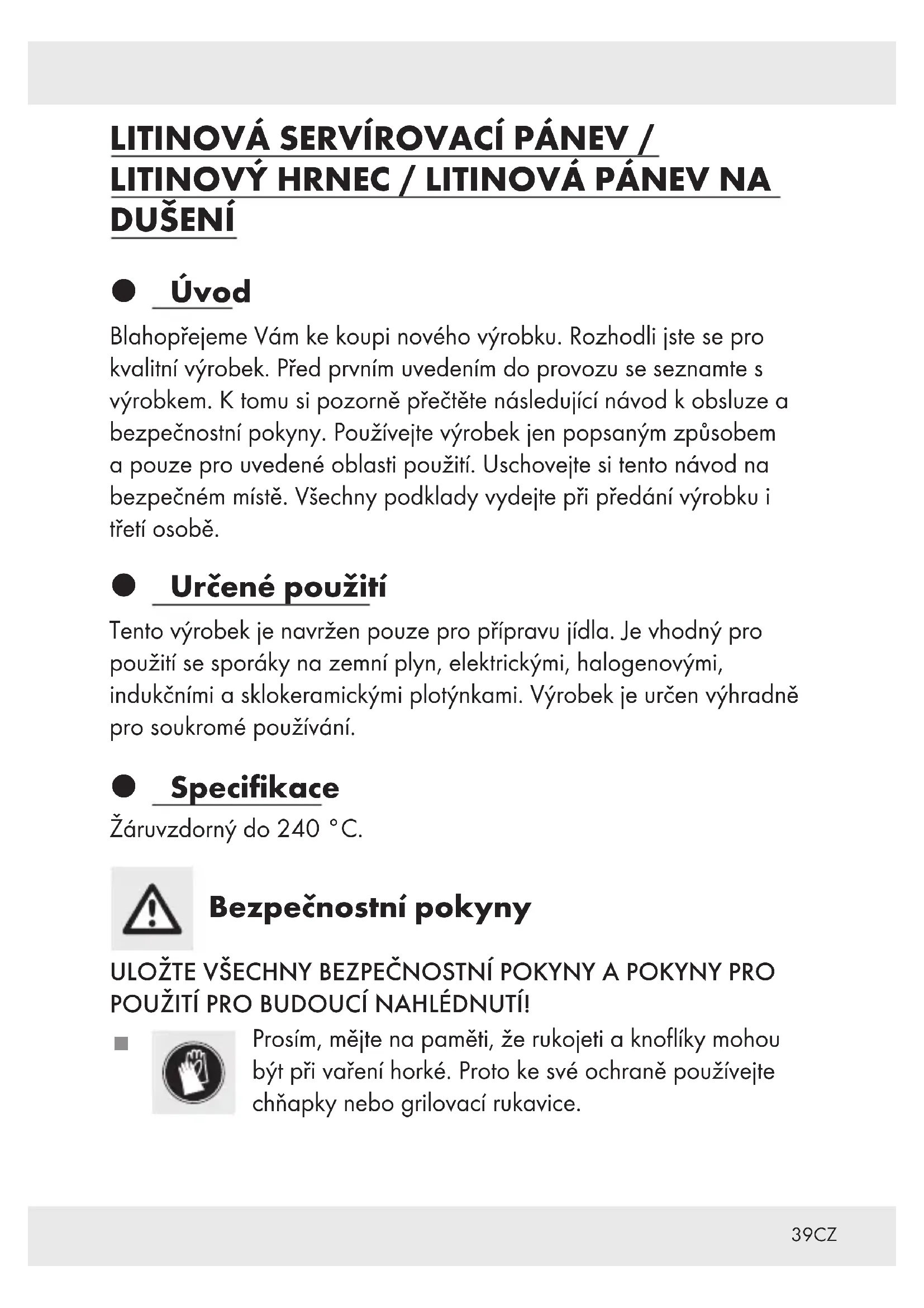BEZPEČNÉ PRO POTRAVINY! Chuť a aroma vašich potravin nejsou tímto výrobkem ovlivněny. OPATRNĚ! NEBEZPEČÍ POPÁLENIN! Buďte zvlášť opatrný, když vyléváte horké kapaliny. Kapaliny vylévejte pomalu a rovnoměrně. Při vylévání se ujistěte, že v bezprostřední blízkosti nejsou žádné další osoby, zejména děti. OPATRNĚ! NEBEZPEČÍ POPÁLENIN! Při manipulaci s výrobkem nebo při vylévání kapalin použijte hadr na hrnec. OPATRNĚ! NEBEZPEČÍ POŽÁRU! Ihned vhodnou látkou otřete horký olej nebo jiné tekutiny, které stékají po hrnci nebo kapají na varný povrch. Používání Před prvním použitím vyvařte výrobek 2 - 3 krát vodou a odstraňte všechny zbytky vzniklé při výrobě. Pak výrobek vyčistěte teplou mýdlovou vodou, opláchněte čistou vodou a důkladně osušte. Vetřete trochu oleje nebo másla do vnitřní strany výrobku. Pomalu výrobek zahřejte při nízké teplotě. Snižte teplotu, jakmile se tuk vsákne. Počkejte přibližně 2 - 3 minuty, až se výrobek se ochladí a odstraňte přebytečný tuk. Nevařte nebo nepečte při vysoké teplotě. Litina je vynikající držák tepla, takže je střední teplota plně dostačující. Příliš vysoké teploty mohou vést k neuspokojivé výsledkům vaření nebo mohou způsobit, že se potraviny připečou, např. omeleta. Spotřebič neohřívejte příliš rychle. V opačném případě může dojít k prasknutí smaltového povrchu, pokud se litina roztahuje rychleji než smalt. Povšimnete si, prosím: Světlý smalt na vnitřní části výrobku je speciálně navržen pro pomalou přípravu pokrmů při nízké teplotě nebo na střední teplotu v troubě.42 CZ Výstupky na spodní straně pokličky způsobují cirkulaci uvnitř nádoby během vaření. Stoupající pára se sráží na víku a je rovnoměrně rozdělována do jídla, které připravujete, prostřednictvím výstupků. To znamená, že vaše jídlo zůstane během vaření šťavnaté a tím si zachovává své přirozené chuti. Smaltový povrch není vhodný pro vaření nasucho. Vždy použijte trochu másla nebo oleje na vaření a ujistěte se, že je spodní část výrobku před ohřevem plně zakryta. Informace pro použití s indukčními plotýnkami Vyberte velikost plotýnky, která odpovídá velikosti spodní strany výrobku, aby se zabránilo ztrátám tepla. Povšimnete si, prosím: Za určitých okolností mohou elektromagnetické vlastnosti plotýnky a výrobku způsobit vznik zápachu. To je normální a neznamená to poškození vaší indukční plotýnky nebo varné nádoby. Dejte výrobek na střed indukční varné plotýnky. UPOZORNĚNÍ! Vysoká rychlost ohřevu! Když předehříváte varnou nádobu, dejte pozor, aby nedošlo k přehřátí. V případě přehřátí, důkladně místnost vyvětrejte. Čištění a péče Před čištěním nechte spotřebič trochu vychladnout. Nikdy neponořujte výrobek do studené vody, dokud je horký. Teplotní šok může poškodit smalt. Rovněž nikdy neplňte produkt studenou vodou. Oplachujte výrobek horkou vodou a běžným čisticím prostředkem. Nejdříve odmočte zbytky potravin a odstraňte je pomocí dřevěné stěrky houby nebo kartáče.43CZ Nikdy nepoužívejte žádné tvrdé předměty, ocelovou vlnu a / nebo abrazivní nebo agresivní čisticí prostředky jako chlórové běliče - v opačném případě může dojít k poškození smaltu. Po čištění výrobek důkladně vysušte. Čas od času, vetřete trochou oleje na vaření do ráfku výrobku, abyste zabránili případnému tvoření náletu rzi. Výrobek uskladněte v suchém, dobře větraném prostředí