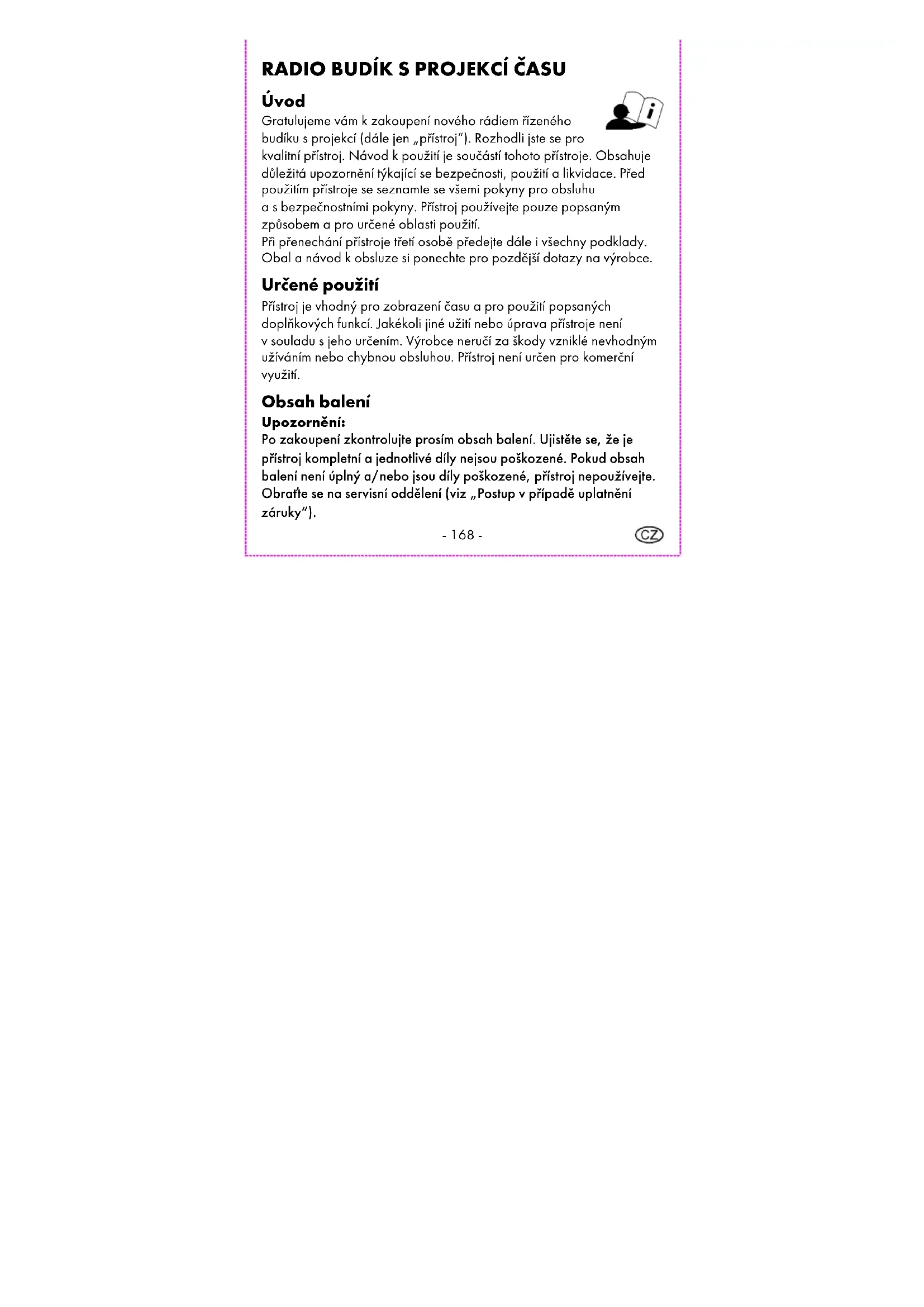Úvod Gratulujeme vám k zakoupení nového rádiem řízeného budíku s projekcí (dále jen „přístroj“). Rozhodli jste se pro kvalitní přístroj. Návod k použití je součástí tohoto přístroje. Obsahuje důležitá upozornění týkající se bezpečnosti, použití a likvidace. Před použitím přístroje se seznamte se všemi pokyny pro obsluhu a s bezpečnostními pokyny. Přístroj používejte pouze popsaným způsobem a pro určené oblasti použití. Při přenechání přístroje třetí osobě předejte dále i všechny podklady. Obal a návod k obsluze si ponechte pro pozdější dotazy na výrobce. Určené použití Přístroj je vhodný pro zobrazení času a pro použití popsaných doplňkových funkcí. Jakékoli jiné užití nebo úprava přístroje není v souladu s jeho určením. Výrobce neručí za škody vzniklé nevhodným užíváním nebo chybnou obsluhou. Přístroj není určen pro komerční využití. Obsah balení Upozornění: Po zakoupení zkontrolujte prosím obsah balení. Ujistěte se, že je přístroj kompletní a jednotlivé díly nejsou poškozené. Pokud obsah balení není úplný a/nebo jsou díly poškozené, přístroj nepoužívejte. Obraťte se na servisní oddělení (viz „Postup v případě uplatnění záruky“).- 169 -
