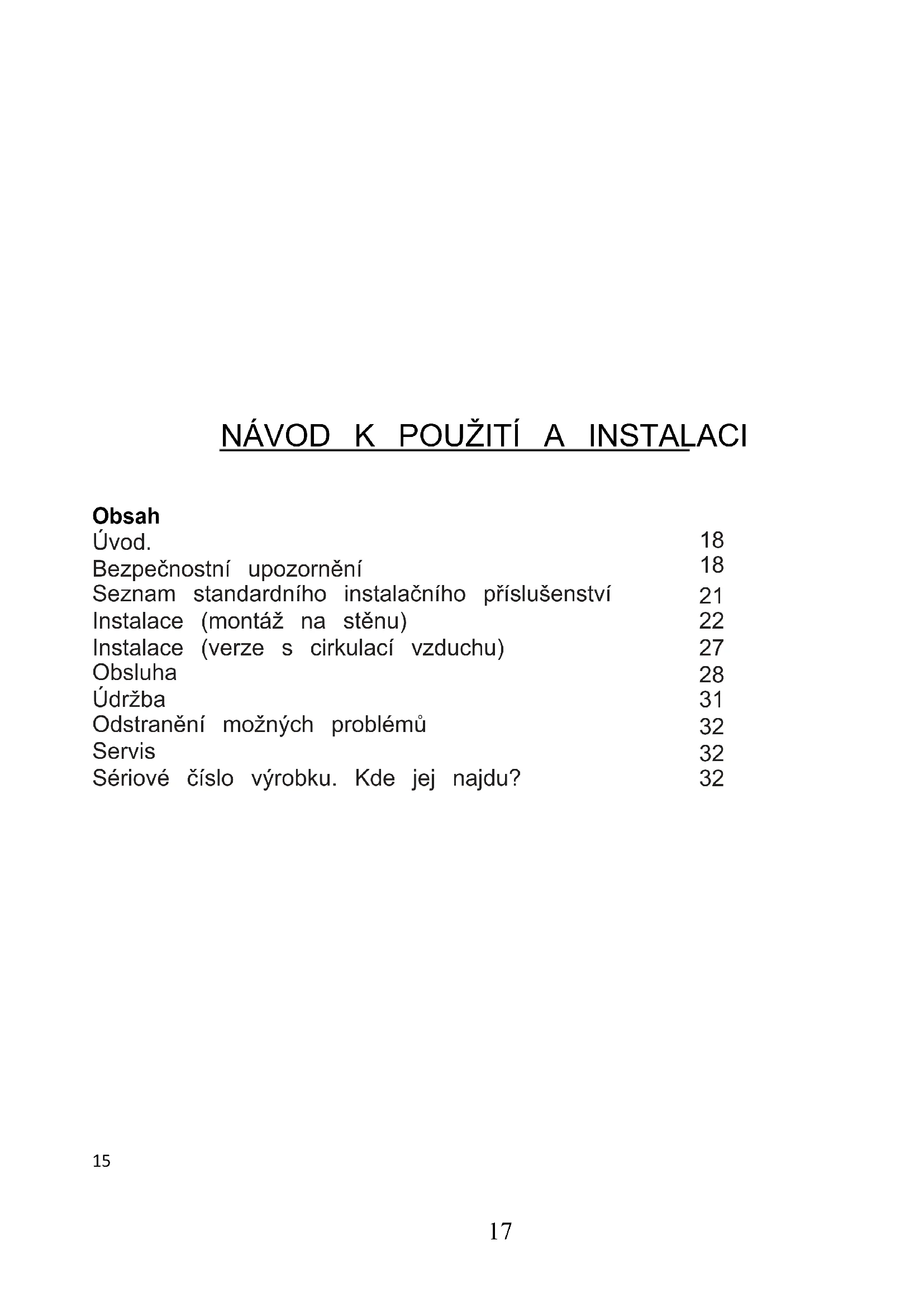 NÁVOD K POUŽITÍ A INSTALACI Obsah Úvod. Bezpečnostní upozornění Seznam standardního instalačního příslušenství Instalace (montáž na stěnu) Instalace (verze s cirkulací vzduchu) Obsluha Údržba Odstranění možných problémů Servis Sériové číslo výrobku. Kde jej najdu?