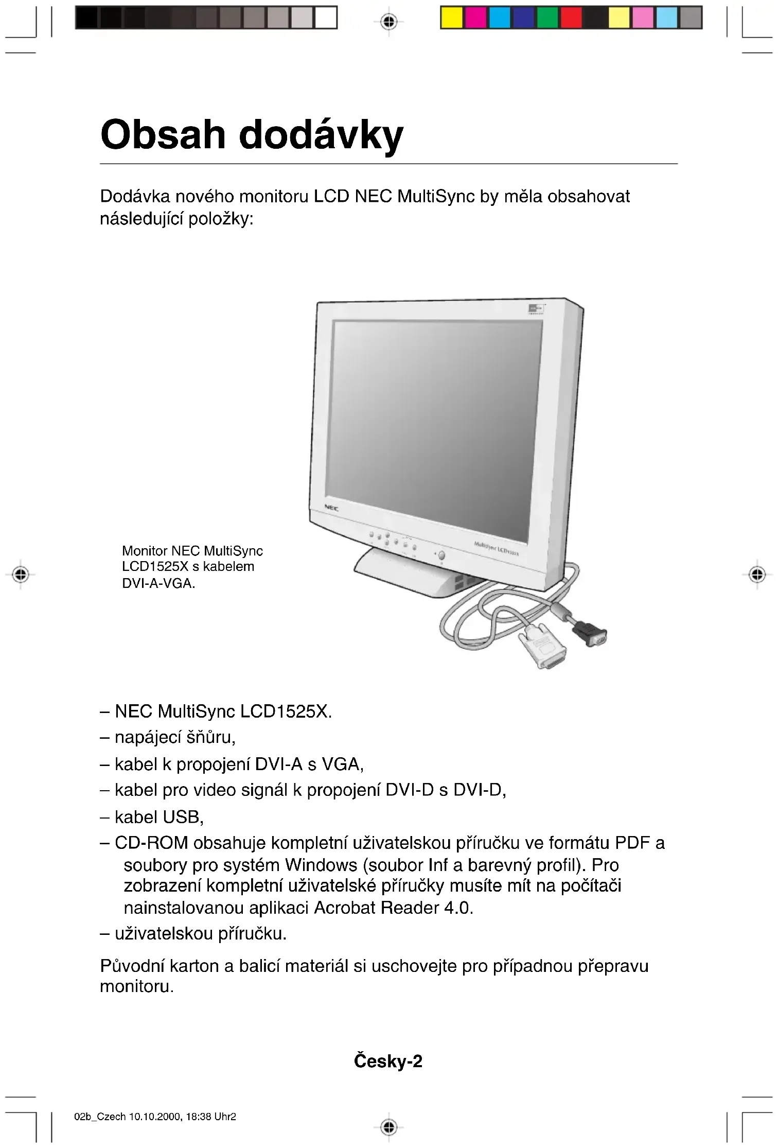 02b_Czech 10.10.2000, 18:38 Uhr1âesky-2 Obsah dodávky Dodávka nového monitoru LCD NEC MultiSync by mûla obsahovat následující poloÏky: – NEC MultiSync LCD1525X. – napájecí ‰ÀÛru, – kabel k propojení DVI-A s VGA, – kabel pro video signál k propojení DVI-D s DVI-D, – kabel USB, – CD-ROM obsahuje kompletní uÏivatelskou pfiíruãku ve formátu PDF a soubory pro systém Windows (soubor Inf a barevn˘ profil). Pro zobrazení kompletní uÏivatelské pfiíruãky musíte mít na poãítaãi nainstalovanou aplikaci Acrobat Reader 4.0. – uÏivatelskou pfiíruãku. PÛvodní karton a balicí materiál si uschovejte pro pfiípadnou pfiepravu monitoru.