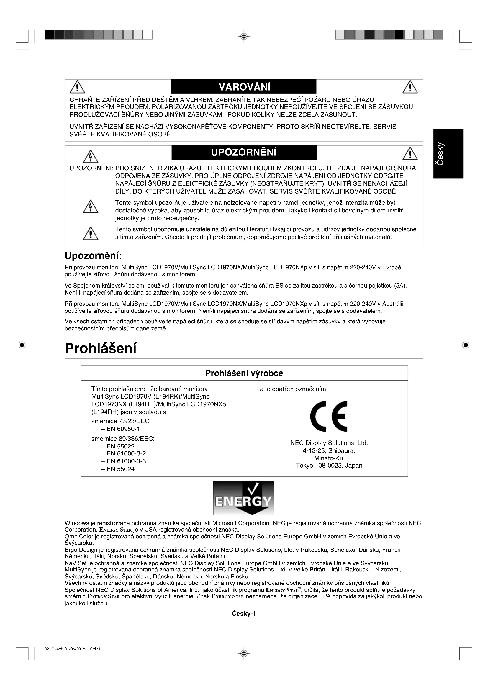 NÁVOD K OBSLUZE MultiSync LCD1970NXp NEC