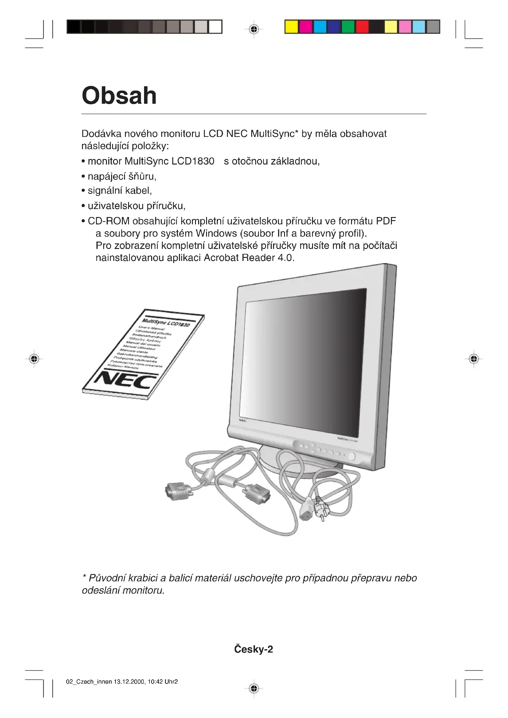 Spotfieba energie monitoru v úsporném reÏimu je ménû neÏ 3 W. MultiSync LCD1830 white Model (LA-18S02) MultiSync LCD1830 Black Model (LA-18S02-BK) 02_Czech_innen 13.12.2000, 10:42 Uhr1âesky-2 Obsah Dodávka nového monitoru LCD NEC MultiSync* by mûla obsahovat následující poloÏky: