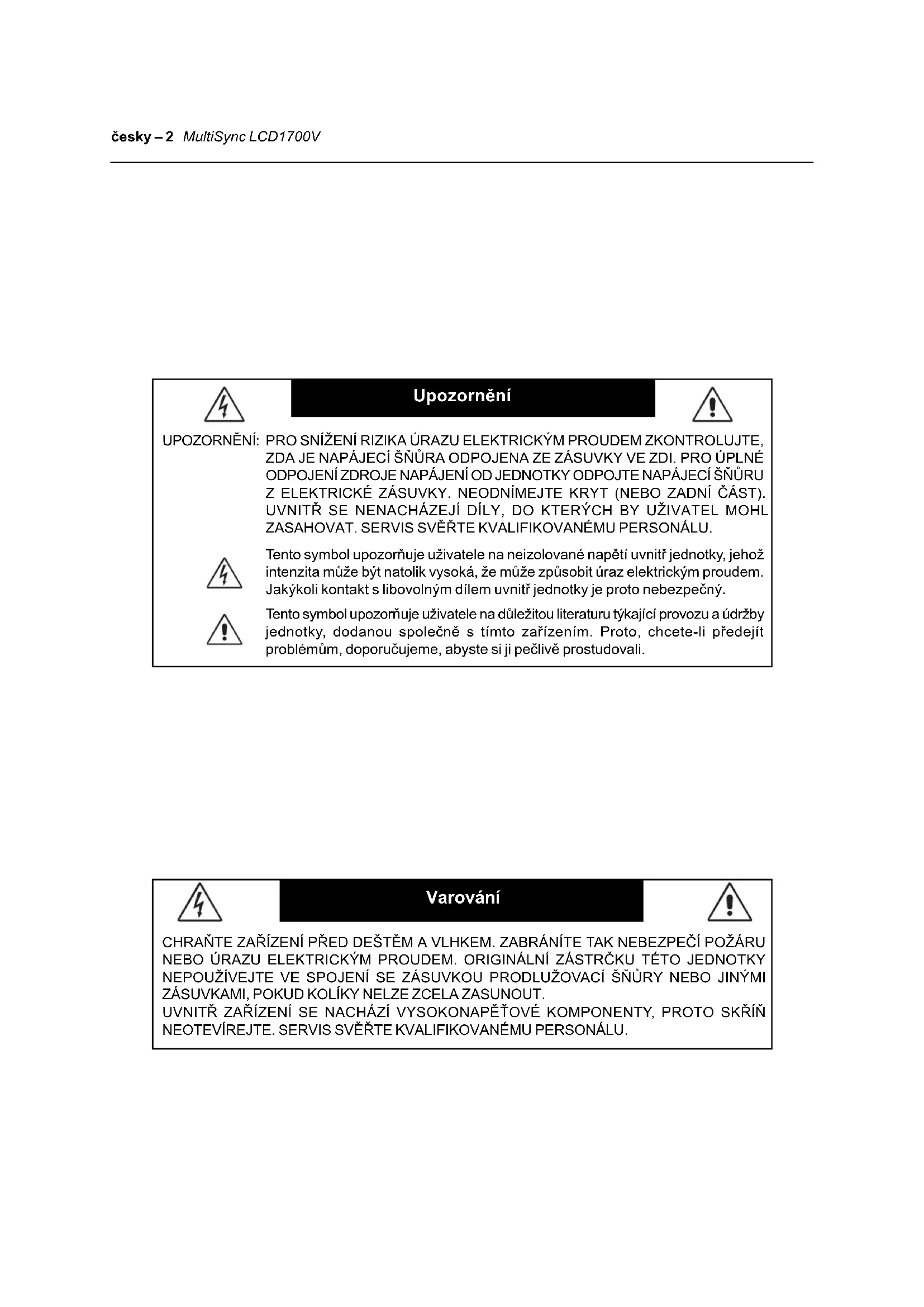 - Při dopravě a manipulaci zacházejte se zařízením opatrně. Obal uschovejte pro případnou přepravu. Uživatelská příručka česky – 9 UPOZORNĚNÍčesky – 10 MultiSync LCD1700V Doporučené používání – pokračování SPRÁVNÝM UMÍSTĚNÍM A NASTAVENÍM MONITORU MŮŽETE PŘEDEJÍT ÚNAVĚ OČÍ, BOLESTEM RAMEN A ŠÍJE. PŘI UMÍSŤOVÁNÍ MONITORU ZKONTROLUJTE A ODRŽUJTE NÁSLEDUJÍCÍ: