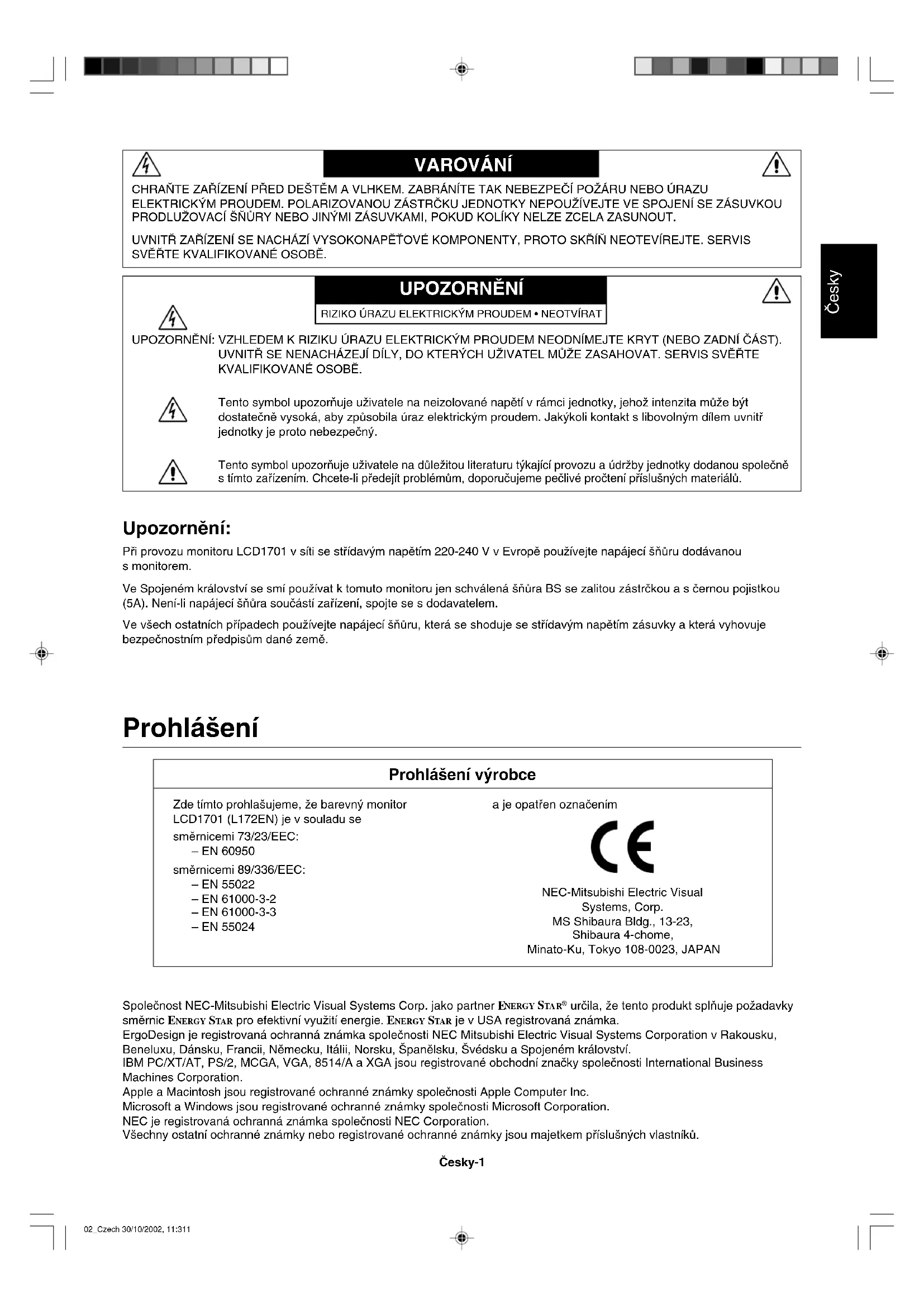 urãila, Ïe tento produkt splÀuje poÏadavky smûrnic ENERGY STAR pro efektivní vyuÏití energie. ENERGY STA R je v USA registrovaná známka. ErgoDesign je registrovaná ochranná známka spoleãnosti NEC Mitsubishi Electric Visual Systems Corporation v Rakousku, Beneluxu, Dánsku, Francii, Nûmecku, Itálii, Norsku, ·panûlsku, ·védsku a Spojeném království. IBM PC/XT/AT, PS/2, MCGA, VGA, 8514/A a XGA jsou registrované obchodní znaãky spoleãnosti International Business Machines Corporation. Apple a Macintosh jsou registrované ochranné známky spoleãnosti Apple Computer Inc. Microsoft a Windows jsou registrované ochranné známky spoleãnosti Microsoft Corporation. NEC je registrovaná ochranná známka spoleãnosti NEC Corporation. V‰echny ostatní ochranné známky nebo registrované ochranné známky jsou majetkem pfiíslu‰n˘ch vlastníkÛ. Upozornûní: Pfii provozu monitoru LCD1701 v síti se stfiídav˘m napûtím 220-240 V v Evropû pouÏívejte napájecí ‰ÀÛru dodávanou smonitorem. Ve Spojeném království se smí pouÏívat k tomuto monitoru jen schválená ‰ÀÛra BS se zalitou zástrãkou a s ãernou pojistkou (5A). Není-li napájecí ‰ÀÛra souãástí zafiízení, spojte se s dodavatelem. Ve v‰ech ostatních pfiípadech pouÏívejte napájecí ‰ÀÛru, která se shoduje se stfiídav˘m napûtím zásuvky a která vyhovuje bezpeãnostním pfiedpisÛm dané zemû. CHRA≈TE ZA¤ÍZENÍ P¤ED DE·TùM A VLHKEM. ZABRÁNÍTE TAK NEBEZPEâÍ POÎÁRU NEBO ÚRAZU ELEKTRICK¯M PROUDEM. POLARIZOVANOU ZÁSTRâKU JEDNOTKY NEPOUÎÍVEJTE VE SPOJENÍ SE ZÁSUVKOU PRODLUÎOVACÍ ·≈ÒRY NEBO JIN¯MI ZÁSUVKAMI, POKUD KOLÍKY NELZE ZCELA ZASUNOUT. UVNIT¤ ZA¤ÍZENÍ SE NACHÁZÍ VYSOKONAPùËOVÉ KOMPONENTY, PROTO SK¤Í≈ NEOTEVÍREJTE. SERVIS SVù¤TE KVALIFIKOVANÉ OSOBù. VAROVÁNÍ UPOZORNùNÍ: VZHLEDEM K RIZIKU ÚRAZU ELEKTRICK¯M PROUDEM NEODNÍMEJTE KRYT (NEBO ZADNÍ âÁST). UVNIT¤ SE NENACHÁZEJÍ DÍLY, DO KTER¯CH UÎIVATEL MÒÎE ZASAHOVAT. SERVIS SVù¤TE KVALIFIKOVANÉ OSOBù. Tento symbol upozorÀuje uÏivatele na neizolované napûtí v rámci jednotky, jehoÏ intenzita mÛÏe b˘t dostateãnû vysoká, aby zpÛsobila úraz elektrick˘m proudem. Jak˘koli kontakt s libovoln˘m dílem uvnitfi jednotky je proto nebezpeãn˘. Tento symbol upozorÀuje uÏivatele na dÛleÏitou literaturu t˘kající provozu a údrÏby jednotky dodanou spoleãnû s tímto zafiízením. Chcete-li pfiedejít problémÛm, doporuãujeme peãlivé proãtení pfiíslu‰n˘ch materiálÛ. RIZIKO ÚRAZU ELEKTRICK¯M PROUDEM • NEOTVÍRAT UPOZORNùNÍ Prohlá‰ení Prohlá‰ení v˘robce Zde tímto prohla‰ujeme, Ïe barevn˘ monitor LCD1701 (L172EN) je v souladu se smûrnicemi 73/23/EEC: – EN 60950 smûrnicemi 89/336/EEC: – EN 55022 – EN 61000-3-2 – EN 61000-3-3 – EN 55024 a je opatfien oznaãením NEC-Mitsubishi Electric Visual Systems, Corp. MS Shibaura Bldg., 13-23, Shibaura 4-chome, Minato-Ku, Tokyo 108-0023, JAPAN 02_Czech 30/10/2002, 11:311âesky-2 Obsah Dodávka nového monitoru LCD1701 NEC* by mûla obsahovat následující poloÏky: