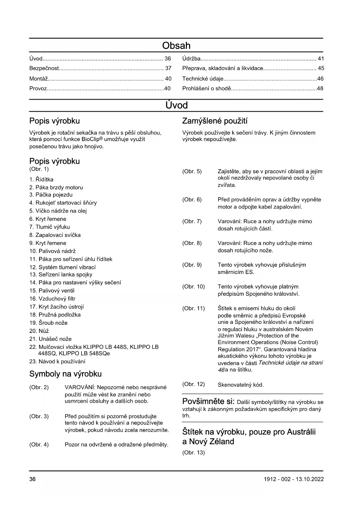 1912 - 002 - 13.10.2022Ruce anohy udržujte mimo dosah rotujícího nože. Emise EuroV VÝSTRAHA: Manipulace smotorem vede kzneplatnění typového schváleníEU tohoto výrobku. Odpovědnost za výrobek Jak uvádí zákon o odpovědnosti za výrobek, neneseme odpovědnost za žádnou škodu způsobenou našim výrobkem, pokud: