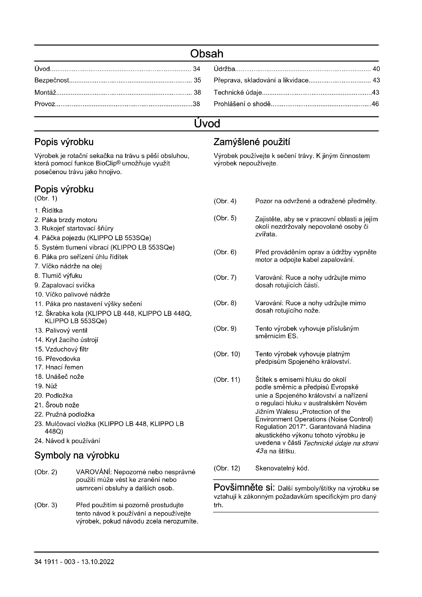 Symboly na výrobku (Obr. 2) VAROVÁNÍ: Nepozorné nebo nesprávné použití může vést ke zranění nebo usmrcení obsluhy adalších osob. (Obr. 3) Před použitím si pozorně prostudujte tento návod kpoužívání anepoužívejte výrobek, pokud návodu zcela nerozumíte. (Obr. 4) Pozor na odvržené aodražené předměty. (Obr. 5) Zajistěte, aby se vpracovní oblasti ajejím okolí nezdržovaly nepovolané osoby či zvířata. (Obr. 6) Před prováděním oprav aúdržby vypněte motor aodpojte kabel zapalování. (Obr. 7) Varování: Ruce anohy udržujte mimo dosah rotujících částí. (Obr. 8) Varování: Ruce anohy udržujte mimo dosah rotujícího nože. (Obr. 9) Tento výrobek vyhovuje příslušným směrnicím ES. (Obr. 10) Tento výrobek vyhovuje platným předpisům Spojeného království. (Obr. 11) Štítek semisemi hluku do okolí podle směrnic apředpisů Evropské unie aSpojeného království anařízení oregulaci hluku vaustralském Novém Jižním Walesu „Protection of the Environment Operations (Noise Control) Regulation 2017“. Garantovaná hladina akustického výkonu tohoto výrobku je uvedena včásti Technické údaje na strani