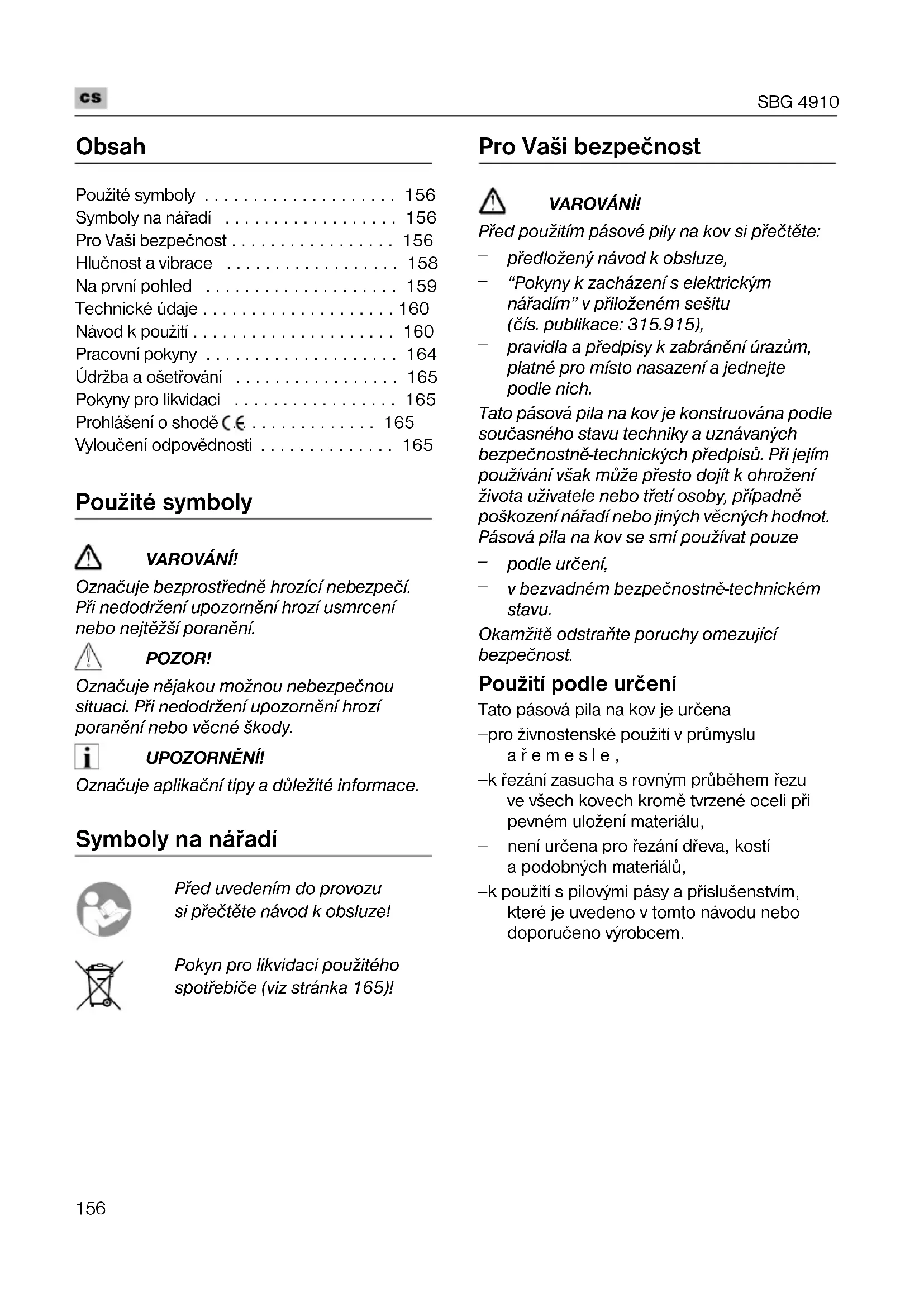 v bezvadném bezpečnostnì-technickém stavu. Okamžitì odstraòte poruchy omezující bezpečnost. Použití podle určení Tato pásová pila na kov je určena – pro živnostenské použití v prùmyslu aøemesle, – k øezání zasucha s rovným prùbìhem øezu ve všech kovech kromì tvrzené oceli pøi pevném uložení materiálu, – není určena pro øezání døeva, kostí a podobných materiálù, – k použití s pilovými pásy a pøíslušenstvím, které je uvedeno v tomto návodu nebo doporučeno výrobcem.SBG 4910