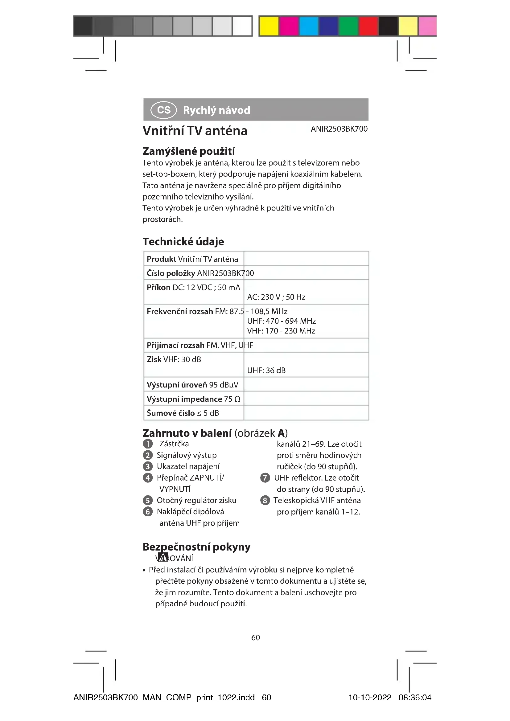 Rychlý návod Vnitřní TV anténa ANIR2503BK700 Zamýšlené použití Tento výrobek je anténa, kterou lze použít stelevizorem nebo set-top-boxem, který podporuje napájení koaxiálním kabelem.Tato anténa je navržena speciálně pro příjem digitálního pozemního televizního vysílání.Tento výrobek je určen výhradně k použití ve vnitřních prostorách. Technické údaje Produkt Vnitřní TV anténaČíslo položky ANIR2503BK700Příkon DC: 12 VDC ; 50 mAAC: 230 V ; 50 HzFrekvenční rozsah FM: 87.5 - 108,5 MHzUHF: 470 - 694 MHzVHF: 170 - 230 MHzPřijímací rozsah FM, VHF, UHFZisk VHF: 30 dBUHF: 36 dBVýstupní úroveň 95 dBµVVýstupní impedance 75ΩŠumové číslo ≤ 5 dB Zahrnuto vbalení (obrázek A) 1 Zástrčka 2 Signálový výstup 3 Ukazatel napájení 4 Přepínač ZAPNUTÍ/ VYPNUTÍ 5 Otočný regulátor zisku 6 Naklápěcí dipólová anténa UHF pro příjem kanálů 21–69. Lze otočit proti směru hodinových ručiček (do 90 stupňů). 7 UHF reektor. Lze otočit do strany (do 90 stupňů). 8 Teleskopická VHF anténa pro příjem kanálů 1–12. Bezpečnostní pokyny