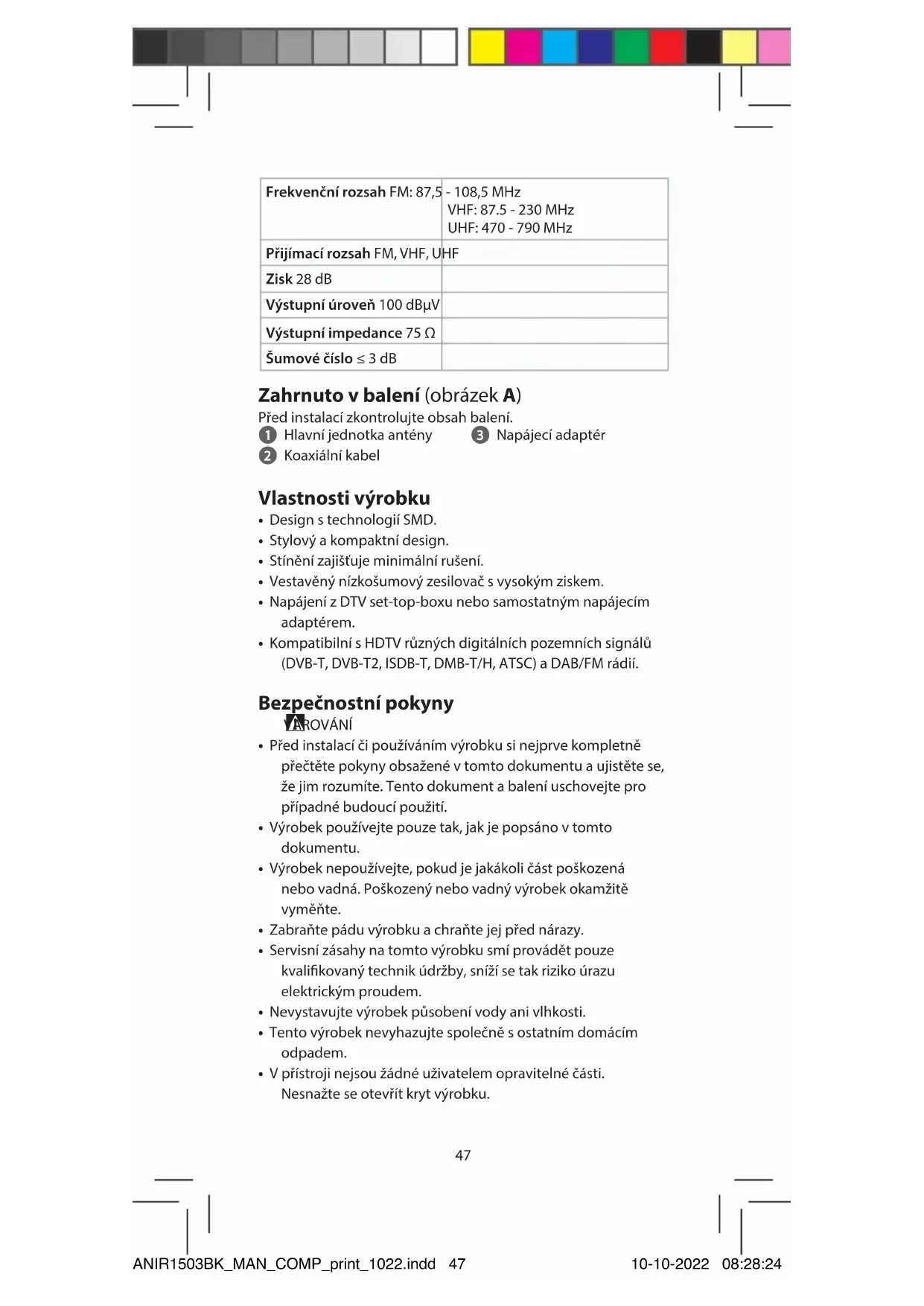 Rychlý návod Vnitřní TV anténa ANIR1503BK Zamýšlené použití Tento výrobek je anténa, kterou lze použít stelevizorem nebo set-top-boxem, který podporuje napájení koaxiálním kabelem. Tato anténa je navržena speciálně pro příjem digitálního pozemního televizního vysílání. Tento výrobek je určen výhradně k použití ve vnitřních prostorách. Technické údaje Produkt Vnitřní TV anténa Číslo položky ANIR1503BK Příkon Adaptér střídavého/ stejnosměrného proudu: 5.0VDC; 200mA DVB set-top-box: 5.0VDC; 40mA ANIR1503BK_MAN_COMP_print_1022.indd 46ANIR1503BK_MAN_COMP_print_1022.indd 46 10-10-2022 08:28:2410-10-2022 08:28:2447 Frekvenční rozsah FM: 87,5 - 108,5 MHz VHF: 87.5 - 230 MHz UHF: 470 - 790 MHz Přijímací rozsah FM, VHF, UHF Zisk 28 dB Výstupní úroveň 100 dBµV Výstupní impedance 75Ω Šumové číslo ≤ 3 dB Zahrnuto v balení (obrázek A) Před instalací zkontrolujte obsah balení. 1 Hlavní jednotka antény 2 Koaxiální kabel 3 Napájecí adaptér Vlastnosti výrobku