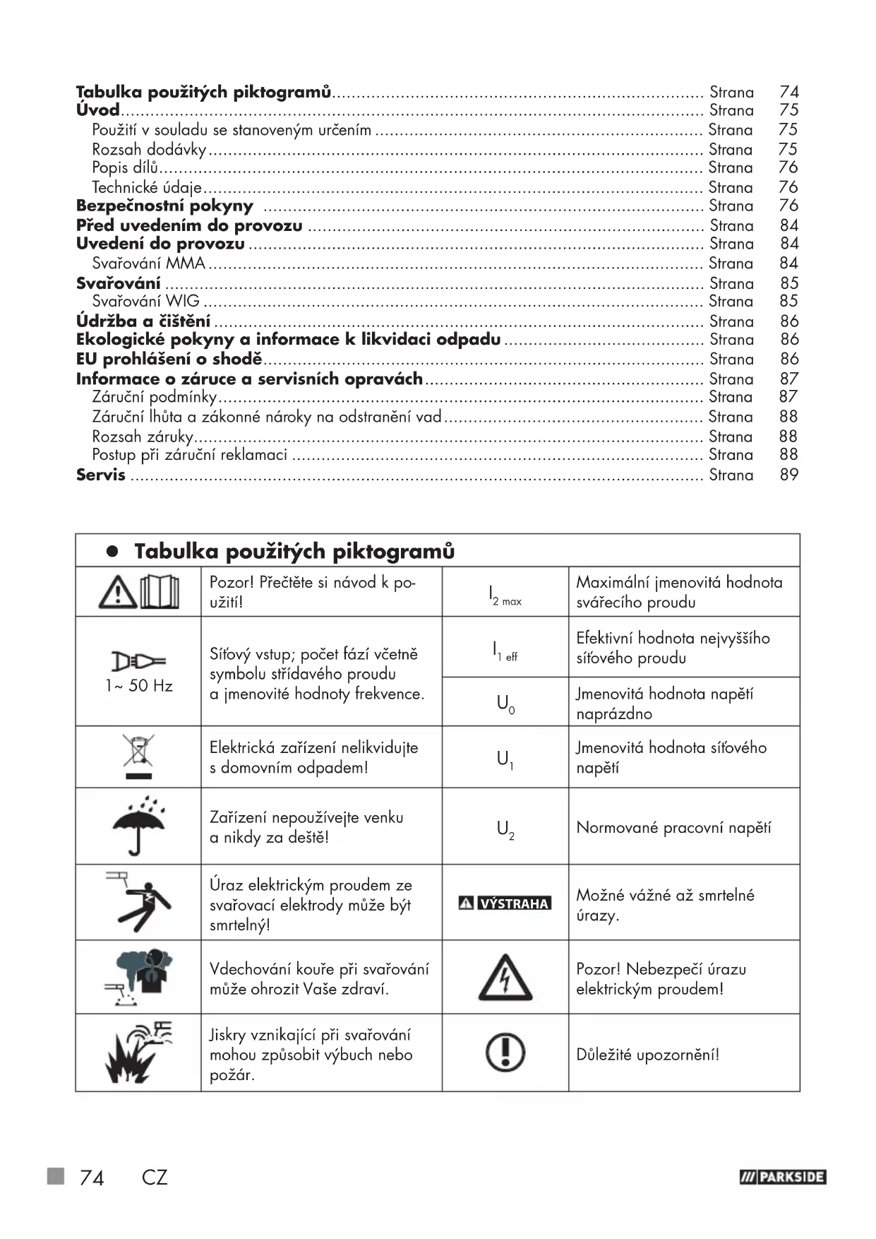prohlašujeme na vlastní odpovědnost, že výrobek Invertní svářečka PTMI 180 A1 IAN: 389213_2107 Č. výr.: 2423 Rok výroby: 2022/18 Model: PTMI 180 A1 splňuje základní požadavky na ochranu, které jsou stanoveny vevropských směrnicích Směrnice EU o elektromagnetická kompatibilitě: 2014/30/EU Směrnice o nízkém napětí: 2014/35/EU Směrnice RoHS: 2011/65/EU + 2015/863/EU a jejich změnách. Výše popsaný předmět a prohlášení splňuje předpisy směrnice Evropského parlamentu a Rady 2011/65/ES ze dne 8. června 2011 o omezení používání některých nebezpečných látek v elektrických a elektronických zařízeních. Posouzení shody bylo provedeno na základě následujících harmonizovaných norem: EN 60974-6:2016 EN 60974-10:2014/A1:2015 St. Ingbert, 23.12.2021 Dr. Christian Weyler - Zajištění kvality - z Informace ozáruce a servisních opravách Záruka společnosti Creative Marketing & Consulting GmbH Vážená zákaznice, vážený zákazníku, na tento výrobek dostáváte záruku 3roky ode dne zakoupení. V případě, že se na tomto výrobku projeví závady, můžete vůči prodejci uplatnit svá práva podle zákona. Tato zákonná práva nejsou omezena našimi záručními podmínkami, které jsou uvedeny dále. z Záruční podmínky Záruční lhůta začíná datem koupě. Uschovejte si dobře originál dokladu o koupi. Budete jej potřebovat jako doklad potvrzující koupi. Pokud se do 3let od data zakoupení tohoto výrobku vyskytne vada materiálu nebo výrobní vada, výrobek vám – podle našeho rozhodnutí – bezplatně opravíme nebo vyměníme. Předpokladem pro poskytnutí záruky během 3leté záruční lhůty je předložení vadného výrobku a dokladu okoupi (pokladní stvrzenka)88