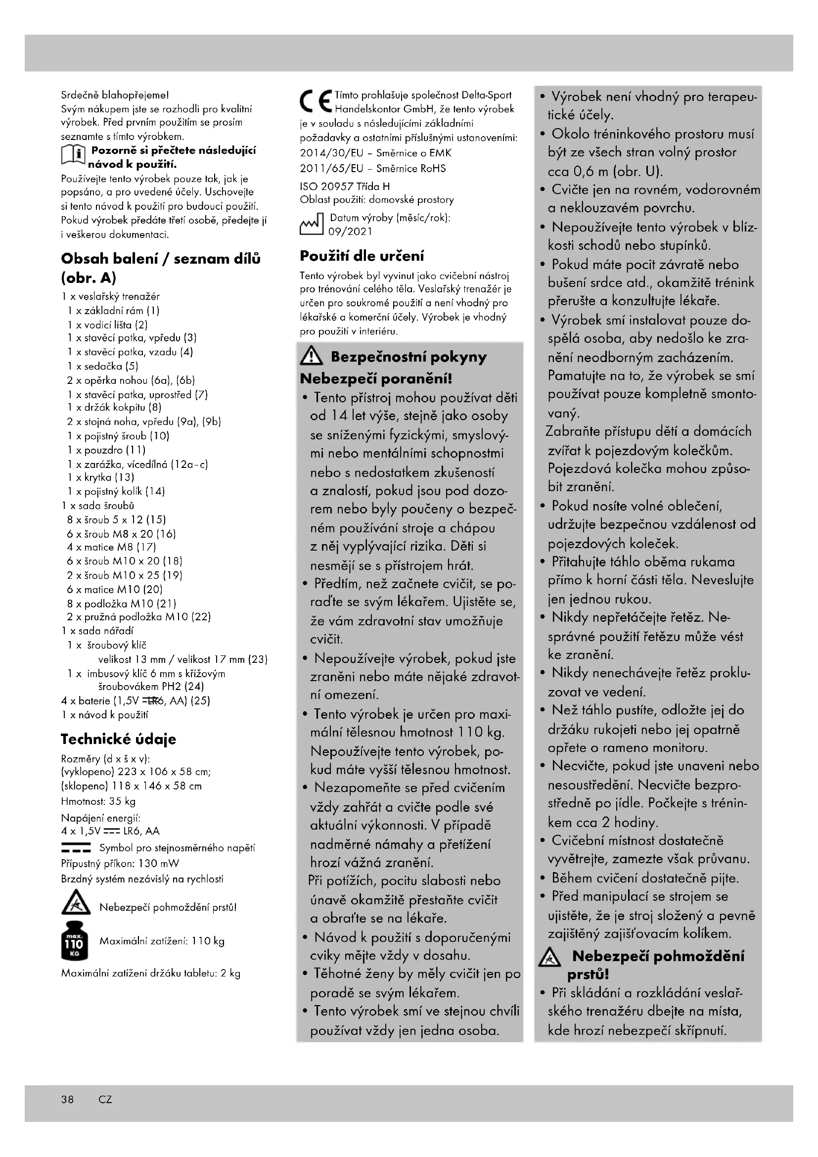 Maximální zatížení: 110 kg Maximální zatížení držáku tabletu: 2 kg Tímto prohlašuje společnost Delta-Sport Handelskontor GmbH, že tento výrobek je v souladu s následujícími základními požadavky a ostatními příslušnými ustanoveními: 2014/30/EU – Směrnice o EMK 2011/65/EU – Směrnice RoHS ISO 20957 Třída H Oblast použití: domovské prostory Datum výroby (měsíc/rok): 09/2021 Použití dle určení Tento výrobek byl vyvinut jako cvičební nástroj pro trénování celého těla. Veslařský trenažér je určen pro soukromé použití a není vhodný pro lékařské a komerční účely. Výrobek je vhodný pro použití v interiéru. Bezpečnostní pokyny Nebezpečí poranění!