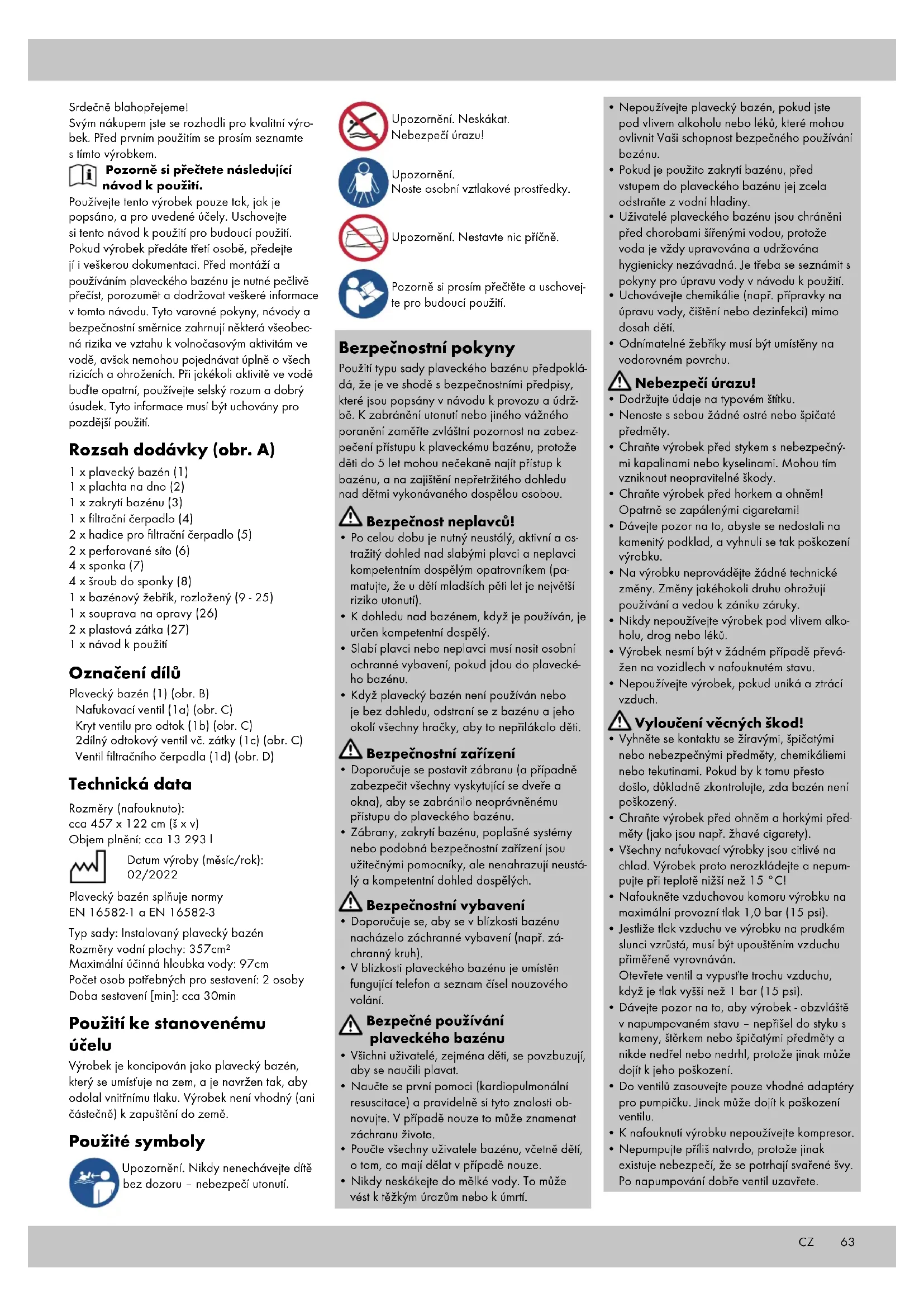 - Zwrócić się do specjalisty. Uwagi odnośnie recyklingu Jeśli produkt jest zużyty, nie należy go wyrzucać wraz z odpadami domowymi ze względu na ochronę środowiska, ale należy go odpowiednio zutylizować. Informacje o punktach zbiórki i godzinach otwarcia można uzyskać w lokalnej administra- cji. Produkt oraz opakowanie należy utylizować w sposób przyjazny dla środowiska. Przestrzegać oznakowania materiałów opakowaniowych podczas segregacji odpadów. Są one oznaczone skrótami (a) i liczbami (b) o następującym znaczeniu: 1–7: tworzywa sztuczne/20–22: papier i karton/80–98: materiały kompozytowe. Produkt i materiały opakowaniowe nadają się do recyklingu, należy je osobno zutylizować w celu lepszego przetwarzania odpadów. Logo Triman obowiązuje tylko we Francji. Informacje o sposobie utylizacji zużytego produktu są dostępne u władz lokalnych lub miejskich.63CZ Srdečně blahopřejeme! Svým nákupem jste se rozhodli pro kvalitní výro- bek. Před prvním použitím se prosím seznamte s tímto výrobkem. Pozorně si přečtete následující návod k použití. Používejte tento výrobek pouze tak, jak je popsáno, a pro uvedené účely. Uschovejte si tento návod k použití pro budoucí použití. Pokud výrobek předáte třetí osobě, předejte jí i veškerou dokumentaci. Před montáží a používáním plaveckého bazénu je nutné pečlivě přečíst, porozumět a dodržovat veškeré informace v tomto návodu. Tyto varovné pokyny, návody a bezpečnostní směrnice zahrnují některá všeobec- ná rizika ve vztahu k volnočasovým aktivitám ve vodě, avšak nemohou pojednávat úplně o všech rizicích a ohroženích. Při jakékoli aktivitě ve vodě buďte opatrní, používejte selský rozum a dobrý úsudek. Tyto informace musí být uchovány pro pozdější použití. Rozsah dodávky (obr. A) 1 x plavecký bazén (1) 1 x plachta na dno (2) 1 x zakrytí bazénu (3) 1 x filtrační čerpadlo (4) 2 x hadice pro filtrační čerpadlo (5) 2 x perforované síto (6) 4 x sponka (7) 4 x šroub do sponky (8) 1 x bazénový žebřík, rozložený (9 - 25) 1 x souprava na opravy (26) 2 x plastová zátka (27) 1 x návod k použití Označení dílů Plavecký bazén (1) (obr. B) Nafukovací ventil (1a) (obr. C) Kryt ventilu pro odtok (1b) (obr. C) 2dílný odtokový ventil vč. zátky (1c) (obr. C) Ventil filtračního čerpadla (1d) (obr. D) Technická data Rozměry (nafouknuto): cca 457 x 122 cm (š x v) Objem plnění: cca 13 293 l Datum výroby (měsíc/rok): 02/2022 Plavecký bazén splňuje normy EN 16582-1 a EN 16582-3 Typ sady: Instalovaný plavecký bazén Rozměry vodní plochy: 357cm² Maximální účinná hloubka vody: 97cm Počet osob potřebných pro sestavení: 2 osoby Doba sestavení [min]: cca 30min Použití ke stanovenému účelu Výrobek je koncipován jako plavecký bazén, který se umísťuje na zem, a je navržen tak, aby odolal vnitřnímu tlaku. Výrobek není vhodný (ani částečně) k zapuštění do země. Použité symboly Upozornění. Nikdy nenechávejte dítě bez dozoru – nebezpečí utonutí. Upozornění. Neskákat. Nebezpečí úrazu! Upozornění. Noste osobní vztlakové prostředky. Upozornění. Nestavte nic příčně. Pozorně si prosím přečtěte a uschovej- te pro budoucí použití. Bezpečnostní pokyny Použití typu sady plaveckého bazénu předpoklá- dá, že je ve shodě s bezpečnostními předpisy, které jsou popsány v návodu k provozu a údrž- bě. K zabránění utonutí nebo jiného vážného poranění zaměřte zvláštní pozornost na zabez- pečení přístupu k plaveckému bazénu, protože děti do 5 let mohou nečekaně najít přístup k bazénu, a na zajištění nepřetržitého dohledu nad dětmi vykonávaného dospělou osobou. Bezpečnost neplavců!