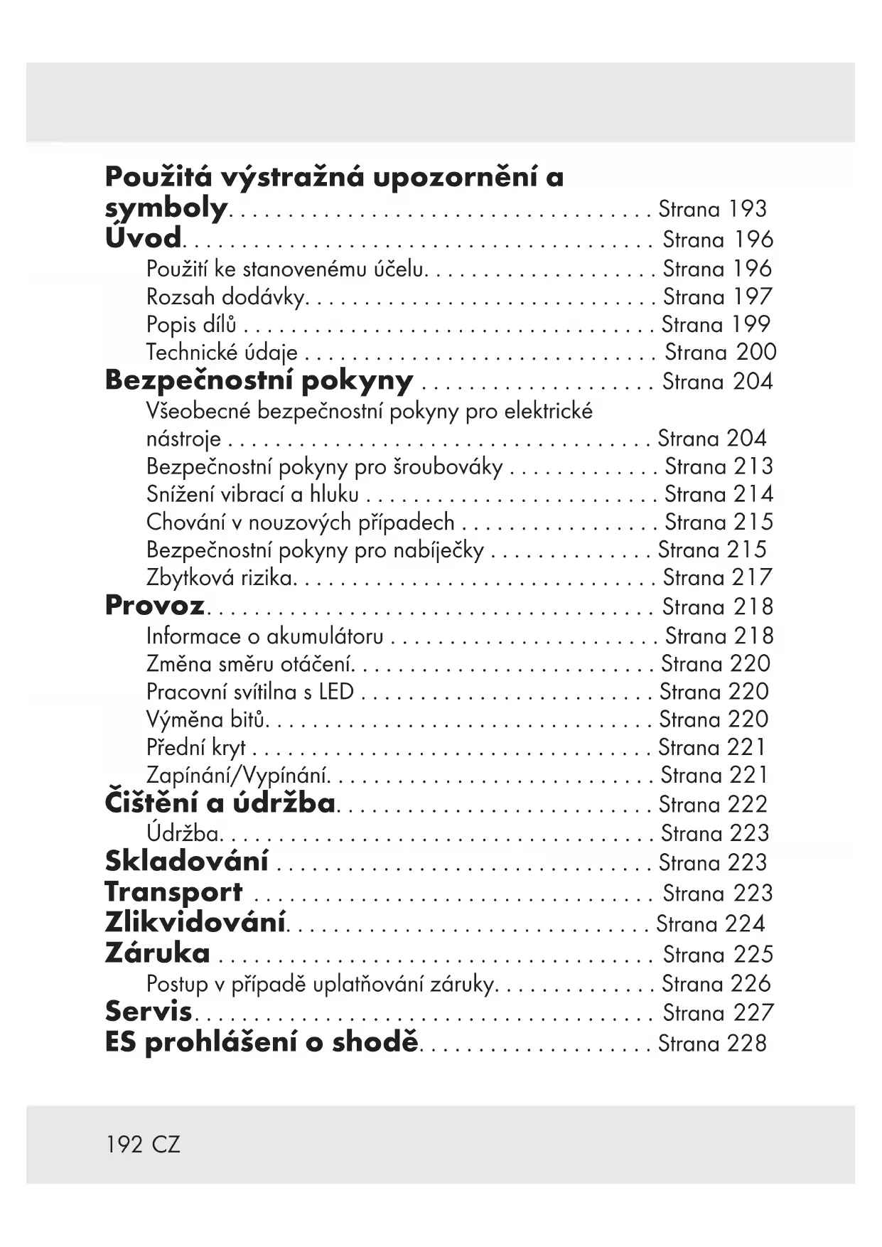 Použitá výstražná upozornění a symboly.................................... Strana 193 Úvod........................................ Strana 196 Použití ke stanovenému účelu.................... Strana 196 Rozsah dodávky.............................. Strana 197 Popis dílů ................................... Strana 199 Technické údaje . . . . . . . . . . . . . . . . . . . . . . . . . . . . . . Strana 200 Bezpečnostní pokyny .................... Strana 204 Všeobecné bezpečnostní pokyny proelektrické nástroje .................................... Strana 204 Bezpečnostní pokyny pro šroubováky ............. Strana 213 Snížení vibrací a hluku ......................... Strana 214 Chování vnouzových případech ................. Strana 215 Bezpečnostní pokyny pro nabíječky .............. Strana 215 Zbytková rizika............................... Strana 217 Provoz...................................... Strana 218 Informace o akumulátoru ....................... Strana 218 Změna směru otáčení.......................... Strana 220 Pracovní svítilna s LED ......................... Strana 220 Výměna bitů................................. Strana 220 Přední kryt .................................. Strana 221 Zapínání/Vypínání............................ Strana 221 Čištění a údržba........................... Strana 222 Údržba..................................... Strana 223 Skladování ................................ Strana 223 Transport .................................. Strana 223 Zlikvidování............................... Strana 224 Záruka ..................................... Strana 225 Postup v případě uplatňování záruky.............. Strana 226 Servis....................................... Strana 227 ES prohlášení o shodě.................... Strana 228193