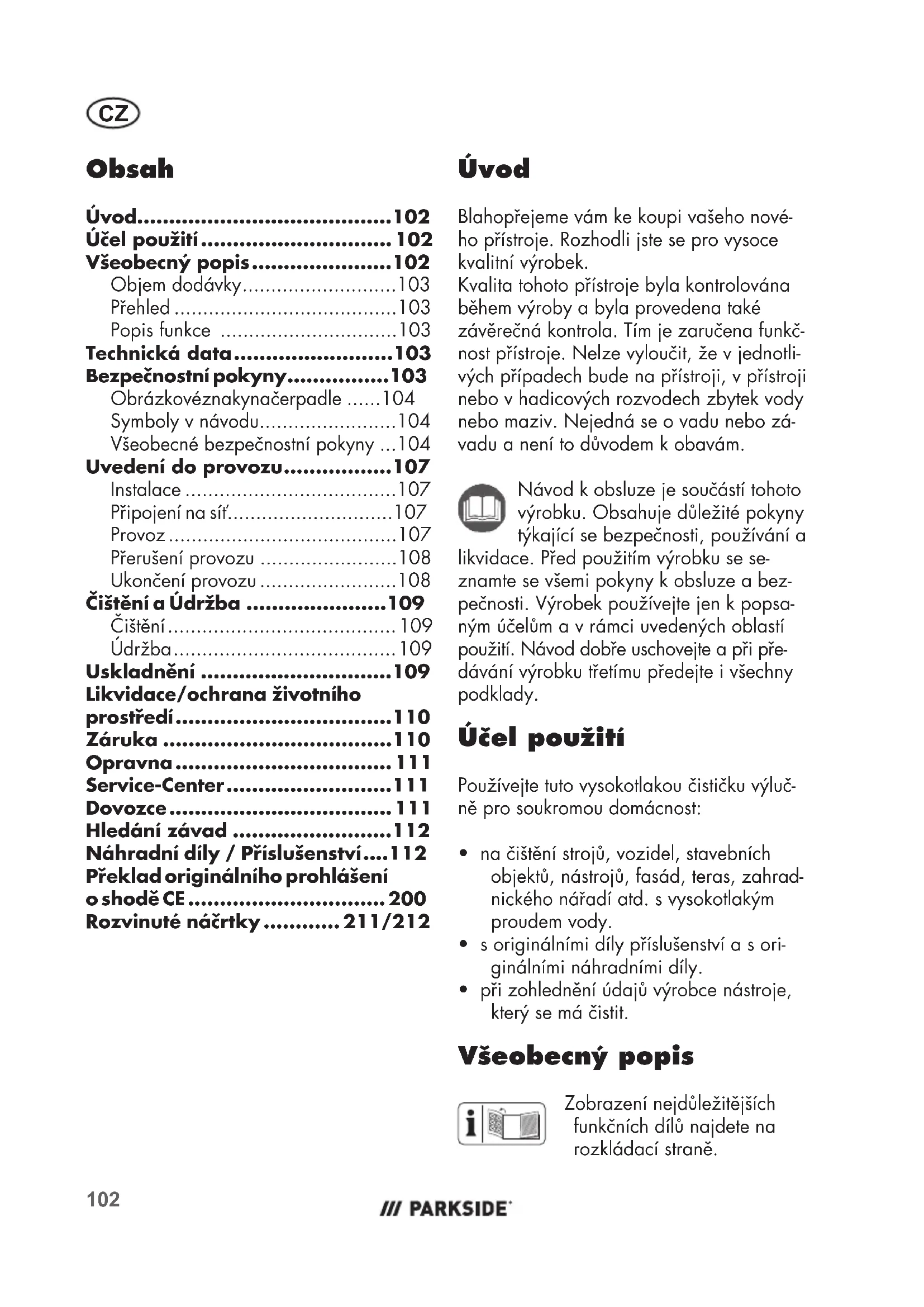 - při zohlednění údajů výrobce nástroje, který se má čistit. Všeobecný popis Zobrazení nejdůležitějších funkčních dílů najdete na rozkládací straně. Obsah Úvod........................................102 Účel použití .............................. 102 Všeobecný popis ......................102 Objem dodávky ...........................103 Přehled .......................................103 Popis funkce ...............................103 Technická data .........................103 Bezpečnostní pokyny ................103 Obrázkové znaky na čerpadle ......104 Symboly v návodu........................104 Všeobecné bezpečnostní pokyny ...104 Uvedení do provozu .................107 Instalace .....................................107 Připojení na síť .............................107 Provoz ........................................107 Přerušení provozu ........................108 Ukončení provozu ........................108 Čištění a Údržba ......................109 Čištění ........................................ 109 Údržba ....................................... 109 Uskladnění ..............................109 Likvidace/ochrana životního prostředí ..................................110 Záruka ....................................110 Opravna .................................. 111 Service-Center ..........................111 Dovozce ................................... 111 Hledání závad .........................112 Náhradní díly / Příslušenství ....112 Překlad originálního prohlášení o shodě CE ............................... 200 Rozvinuté náčrtky ............ 211/212CZ