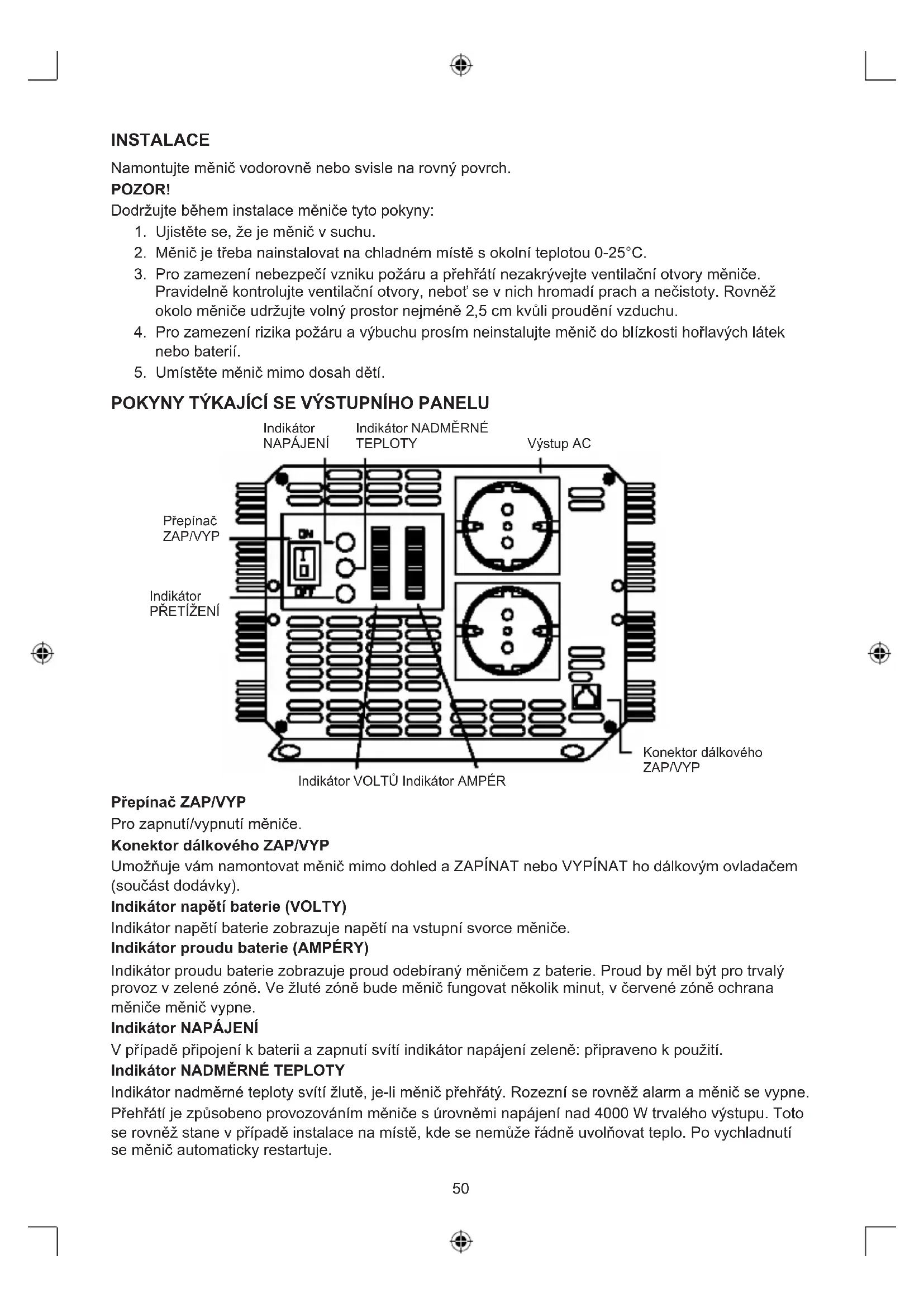 Indikátor VOLTŮ Indikátor AMPÉR Konektor dálkového ZAP/VYP Indikátor NADMĚRNÉ TEPLOTY Výstup AC Přepínač ZAP/VYP Pro zapnutí/vypnutí měniče. Konektor dálkového ZAP/VYP Umožňuje vám namontovat měnič mimo dohled a ZAPÍNAT nebo VYPÍNAT ho dálkovým ovladačem (součást dodávky). Indikátor napětí baterie (VOLTY) Indikátor napětí baterie zobrazuje napětí na vstupní svorce měniče. Indikátor proudu baterie (AMPÉRY) Indikátor proudu baterie zobrazuje proud odebíraný měničem z baterie. Proud by měl být pro trvalý provoz v zelené zóně. Ve žluté zóně bude měnič fungovat několik minut, v červené zóně ochrana měniče měnič vypne. Indikátor NAPÁJENÍ V případě připojení k baterii a zapnutí svítí indikátor napájení zeleně: připraveno k použití. Indikátor NADMĚRNÉ TEPLOTY Indikátor nadměrné teploty svítí žlutě, je-li měnič přehřátý. Rozezní se rovněž alarm a měnič se vypne. Přehřátí je způsobeno provozováním měniče s úrovněmi napájení nad 4000 W trvalého výstupu. Toto se rovněž stane v případě instalace na místě, kde se nemůže řádně uvolňovat teplo. Po vychladnutí se měnič automaticky restartuje.51 Indikátor PŘETÍŽENÍ Indikátor přetížení svítí červeně. Problém lze vyřešit vypnutím měniče a snížením zatížení před dalším zapnutím. AKUSTICKÝ ALARM Alarm se rozezní v případě: a. Nadměrné teploty b. Slabé baterie (<10,5 V pro měnič 12 V, < 21 V pro měnič 24 V) c. Vypnutí v případě slabé baterie (< 10 V pro měnič 12 V, < 20 V pro měnič 24 V)