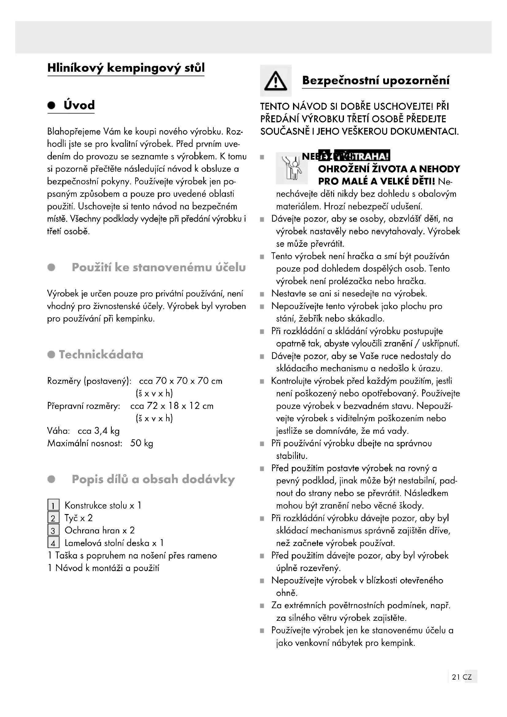 PRO MALÉ A VELKÉ DĚTI! Ne- nechávejte děti nikdy bez dohledu sobalovým materiálem. Hrozí nebezpečí udušení. Dávejte pozor, aby se osoby, obzvlášť děti, na výrobek nastavěly nebo nevytahovaly. Výrobek se může převrátit. Tento výrobek není hračka a smí být používán pouze pod dohledem dospělých osob. Tento výrobek není prolézačka nebo hračka. Nestavte se ani si nesedejte na výrobek. Nepoužívejte tento výrobek jako plochu pro stání, žebřík nebo skákadlo. Při rozkládání a skládání výrobku postupujte opatrně tak, abyste vyloučili zranění / uskřípnutí. Dávejte pozor, aby se Vaše ruce nedostaly do skládacího mechanismu a nedošlo kúrazu. Kontrolujte výrobek před každým použitím, jestli není poškozený nebo opotřebovaný. Používejte pouze výrobek vbezvadném stavu. Nepouží- vejte výrobek s viditelným poškozením nebo jestliže se domníváte, že má vady. Při používání výrobku dbejte na správnou stabilitu. Před použitím postavte výrobek na rovný a pevný podklad, jinak může být nestabilní, pad- nout do strany nebo se převrátit. Následkem mohou být zranění nebo věcné škody. Při rozkládání výrobku dávejte pozor, aby byl skládací mechanismus správně zajištěn dříve, než začnete výrobek používat. Před použitím dávejte pozor, aby byl výrobek úplně rozevřený. Nepoužívejte výrobek vblízkosti otevřeného ohně. Za extrémních povětrnostních podmínek, např. za silného větru výrobek zajistěte. Používejte výrobek jen ke stanovenému účelu a jako venkovní nábytek pro kempink.22 CZ Dbejte na maximální přípustné zatížení (viz „Technická data“). Při překročení této maximální hranice nosnosti může dojít ke zranění nebo kvěcným škodám. Provedením pro snadné a rychlé postavení není výrobek tak stabilní jako normální stůl. Nezatě- žujte stůl váhou přes 50 kg a zabraňte bočnímu namáhání, tento stůl je lehčí než běžné venkovní stoly a může se snadno převrátit. Nepřipevňujte na stůl žádný slunečník. Použí- vejte jen slunečník s vlastním podstavcem. NEBEZPEČÍ VĚCNÝCH ŠKOD! Neručíme za nehody způsobené nerespektováním bezpečno st- ních pokynů nebo nesprávným zacházením. Montáž výrobku Vyjměte výrobek z tašky. Táhněte pomalu a rovnoměrně za konstrukci stolu