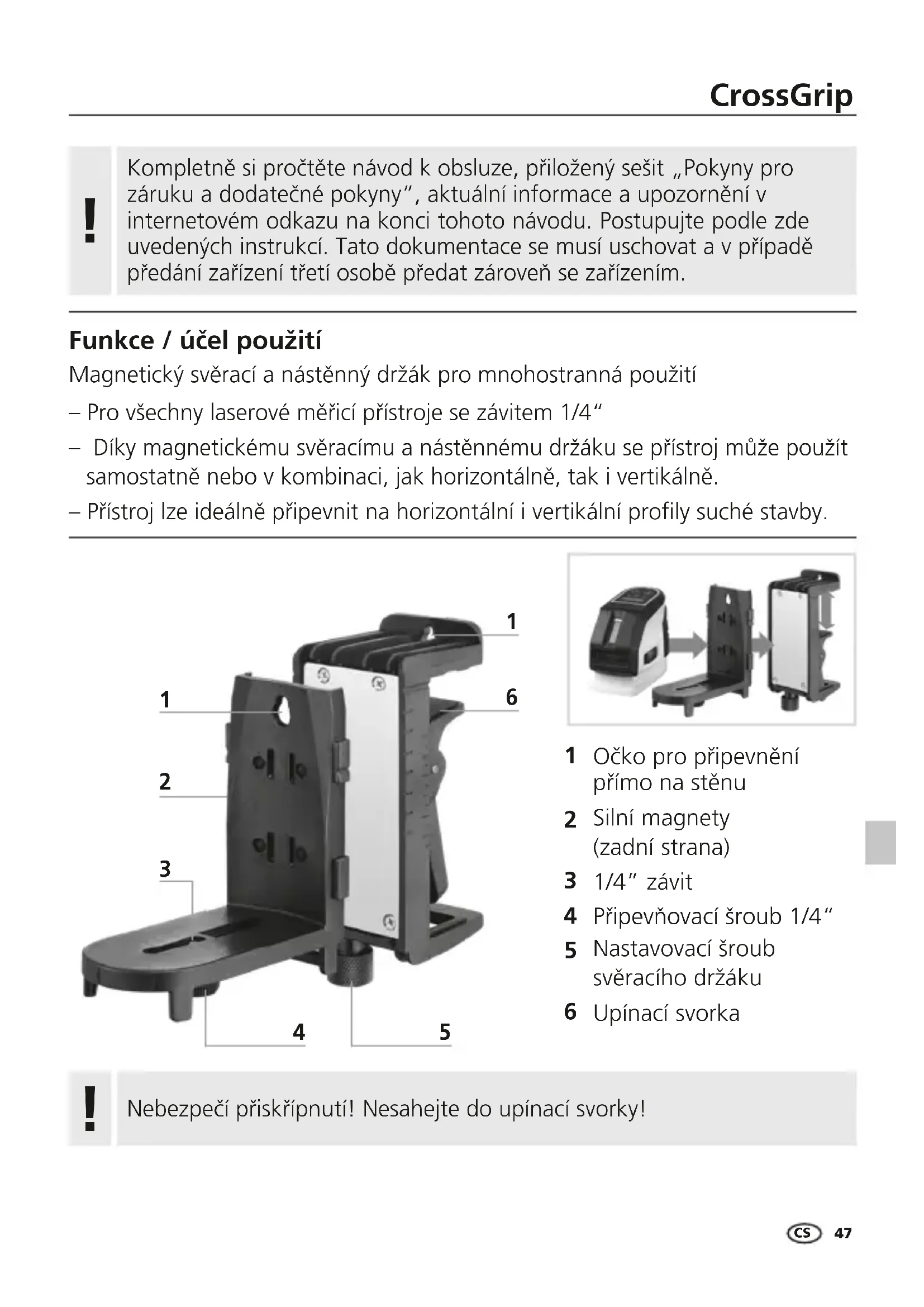 Funkce / účel použití Magnetický svěrací a nástěnný držák pro mnohostranná použití – Pro všechny laserové měřicí přístroje se závitem 1/4“ – Díky magnetickému svěracímu a nástěnnému držáku se přístroj může použít samostatně nebo v kombinaci, jak horizontálně, tak i vertikálně. – Přístroj lze ideálně připevnit na horizontální i vertikální proly suché stavby. Kompletně si pročtěte návod k obsluze, přiložený sešit „Pokyny pro záruku a dodatečné pokyny“, aktuální informace a upozornění v internetovém odkazu na konci tohoto návodu. Postupujte podle zde uvedených instrukcí. Tato dokumentace se musí uschovat a v případě předání zařízení třetí osobě předat zároveň se zařízením.