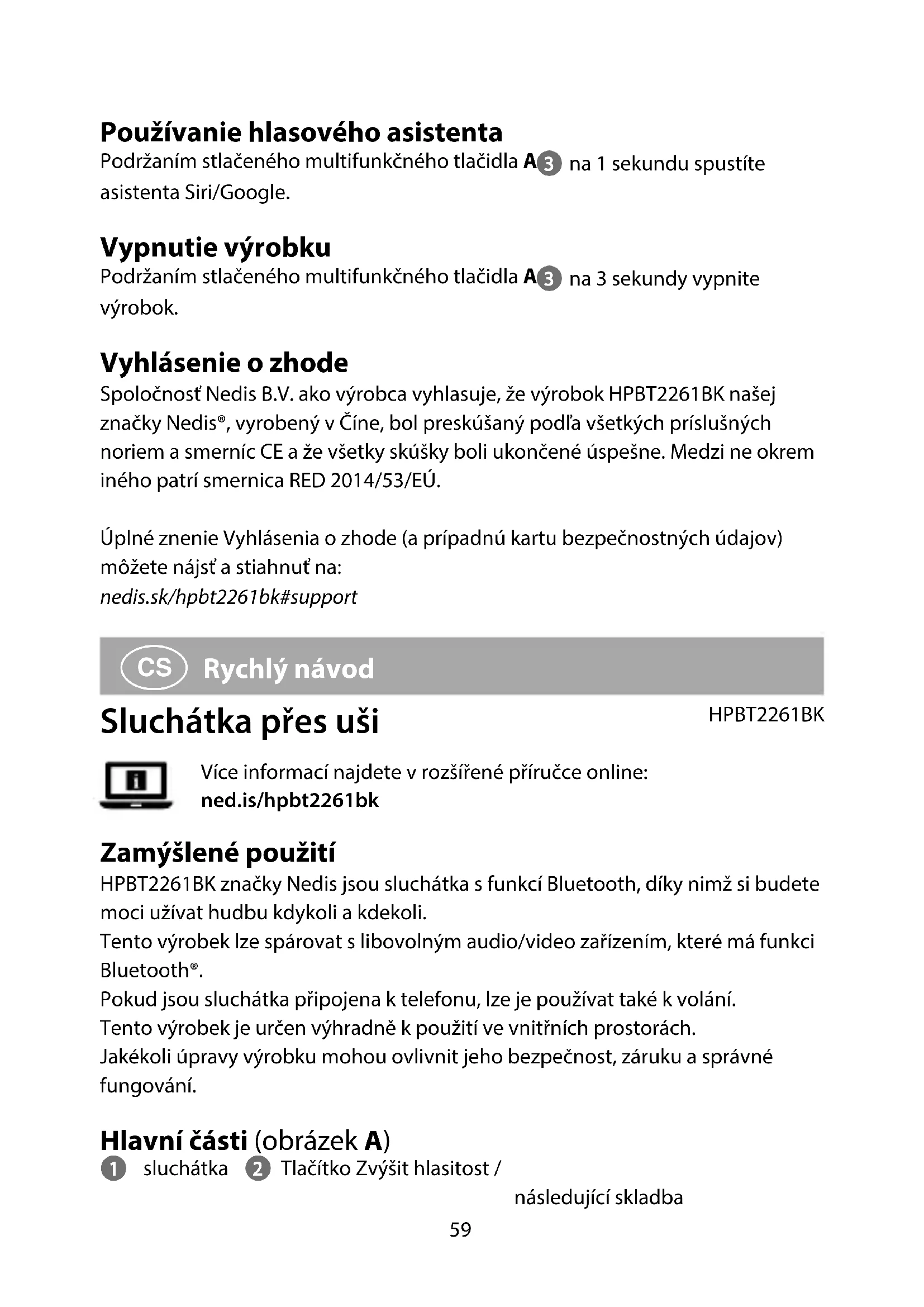 ajeho podržením na dobu 3sekund výrobek vypněte. Prohlášení o shodě Společnost Nedis B.V. coby výrobce prohlašuje, že výrobek HPBT2261BK značky Nedis®, vyrobený v Číně, byl přezkoušen v souladu se všemi relevantními normami a nařízeními EK a že všemi zkouškami úspěšně prošel. Patří sem mimo jiné také nařízení RED 2014/53/EU. Kompletní prohlášení o shodě (a případně bezpečnostní list) můžete najít a stáhnout na adrese: nedis.cz/hpbt2261bk#support63