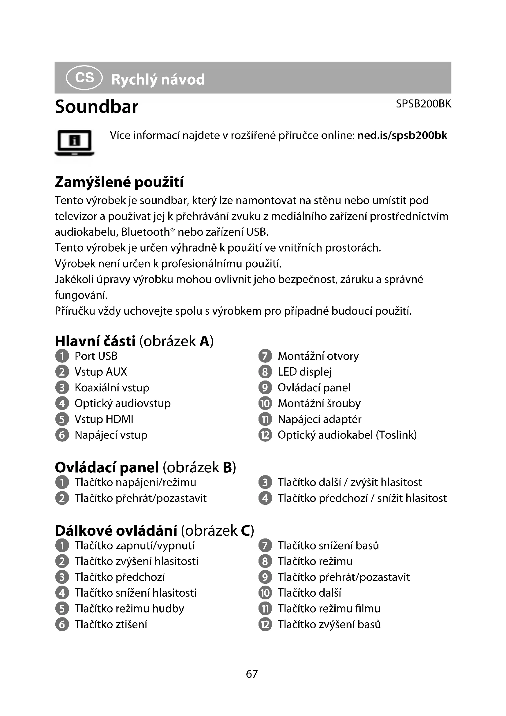 Rychlý návod Soundbar SPSB200BK Více informací najdete v rozšířené příručce online: ned.is/spsb200bk Zamýšlené použití Tento výrobek je soundbar, který lze namontovat na stěnu nebo umístit pod televizor apoužívat jej kpřehrávání zvuku zmediálního zařízení prostřednictvím audiokabelu, Bluetooth® nebo zařízení USB. Tento výrobek je určen výhradně k použití ve vnitřních prostorách. Výrobek není určen k profesionálnímu použití. Jakékoli úpravy výrobku mohou ovlivnit jeho bezpečnost, záruku a správné fungování. Příručku vždy uchovejte spolu s výrobkem pro případné budoucí použití. Hlavní části (obrázek A) 1 Port USB 2 Vstup AUX 3 Koaxiální vstup 4 Optický audiovstup 5 Vstup HDMI 6 Napájecí vstup 7 Montážní otvory 8 LED displej 9 Ovládací panel q Montážní šrouby w Napájecí adaptér e Optický audiokabel (Toslink) Ovládací panel (obrázek B) 1 Tlačítko napájení/režimu 2 Tlačítko přehrát/pozastavit 3 Tlačítko další / zvýšit hlasitost 4 Tlačítko předchozí / snížit hlasitost Dálkové ovládání (obrázek C) 1 Tlačítko zapnutí/vypnutí 2 Tlačítko zvýšení hlasitosti 3 Tlačítko předchozí 4 Tlačítko snížení hlasitosti 5 Tlačítko režimu hudby 6 Tlačítko ztišení 7 Tlačítko snížení basů 8 Tlačítko režimu 9 Tlačítko přehrát/pozastavit q Tlačítko další w Tlačítko režimu lmu e Tlačítko zvýšení basů68 Bezpečnostní pokyny