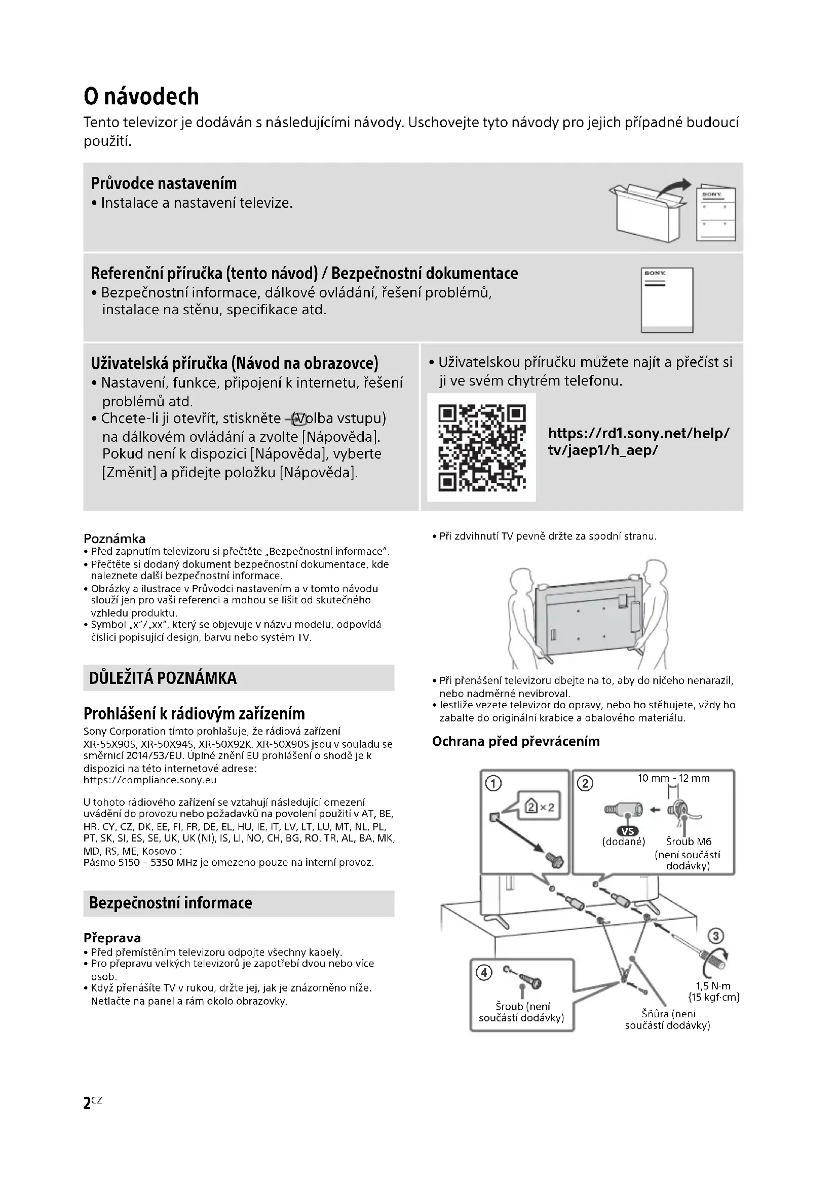 - Před zapnutím televizoru si přečtěte „Bezpečnostní informace“.• Přečtěte si dodaný dokument bezpečnostní dokumentace, kde naleznete další bezpečnostní informace. • Obrázky a ilustrace v Průvodci nastavením a v tomto návodu slouží jen pro vaši referenci a mohou se lišit od skutečného vzhledu produktu.• Symbol „x“/„xx“, který se objevuje v názvu modelu, odpovídá číslici popisující design, barvu nebo systém TV. Prohlášení k rádiovým zařízením Sony Corporation tímto prohlašuje, že rádiová zařízení XR-55X90S, XR-50X94S, XR-50X92K, XR-50X90S jsou v souladu se směrnicí 2014/53/EU. Úplné znění EU prohlášení o shodě je k dispozici na této internetové adrese: https://compliance.sony.euU tohoto rádiového zařízení se vztahují následující omezení uvádění do provozu nebo požadavků na povolení použití v AT, BE, HR, CY, CZ, DK, EE, FI, FR, DE, EL, HU, IE, IT, LV, LT, LU, MT, NL, PL, PT, SK, SI, ES, SE, UK, UK (NI), IS, LI, NO, CH, BG, RO, TR, AL, BA, MK, MD, RS, ME, Kosovo :Pásmo 5150 – 5350 MHz je omezeno pouze na interní provoz. Přeprava
