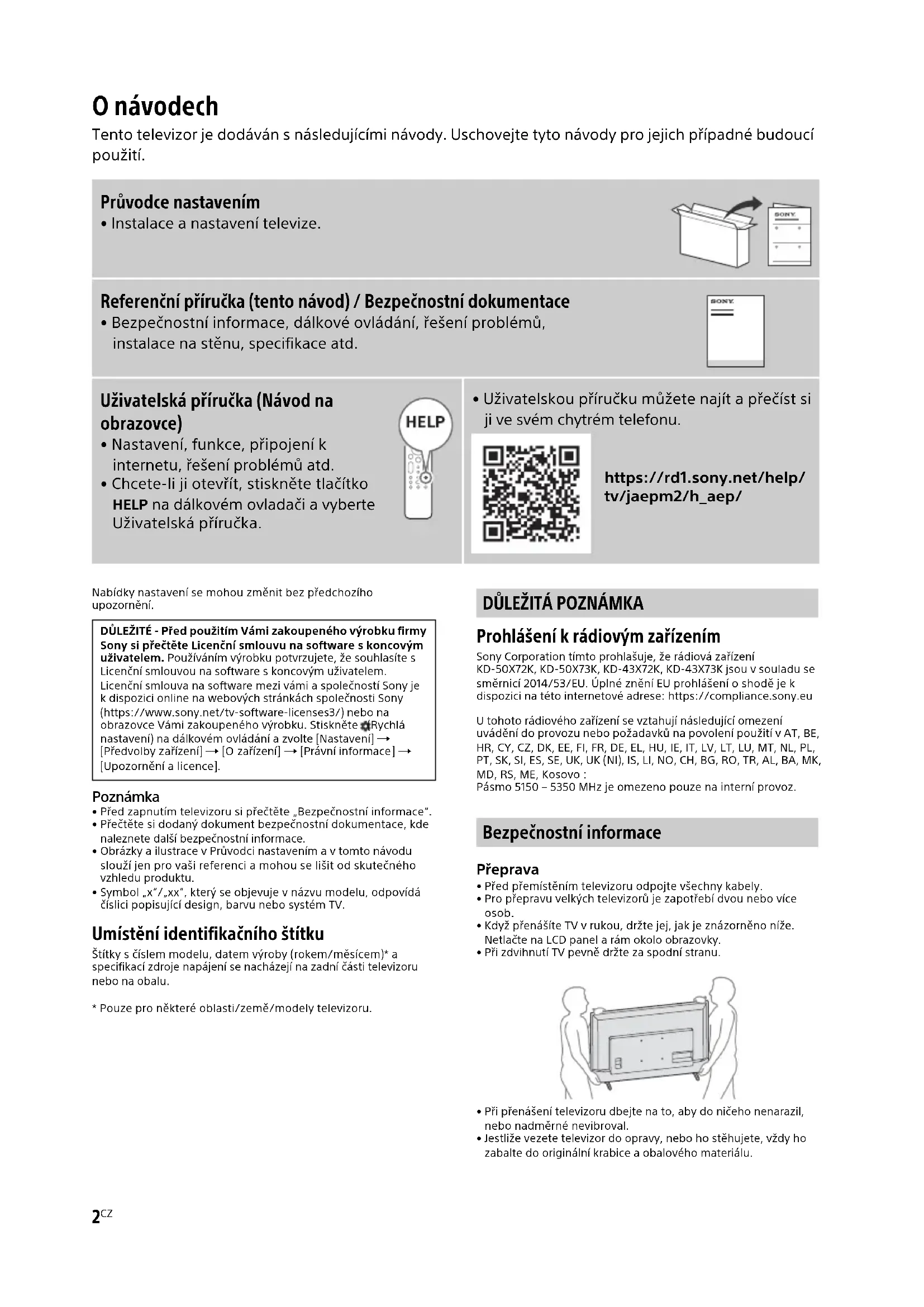 - Uživatelskou příručku můžete najít a přečíst si ji ve svém chytrém telefonu. https://rd1.sony.net/help/ tv/jaepm2/h_aep/ DŮLEŽITÉ - Před použitím Vámi zakoupeného výrobku firmy Sony si přečtěte Licenční smlouvu na software s koncovým uživatelem. Používáním výrobku potvrzujete, že souhlasíte s Licenční smlouvou na software s koncovým uživatelem. Licenční smlouva na software mezi vámi a společností Sony je k dispozici online na webových stránkách společnosti Sony (https://www.sony.net/tv-software-licenses3/) nebo na obrazovce Vámi zakoupeného výrobku. Stiskněte (Rychlá nastavení) na dálkovém ovládání a zvolte [Nastavení] [Předvolby zařízení] [O zařízení] [Právní informace] [Upozornění a licence].