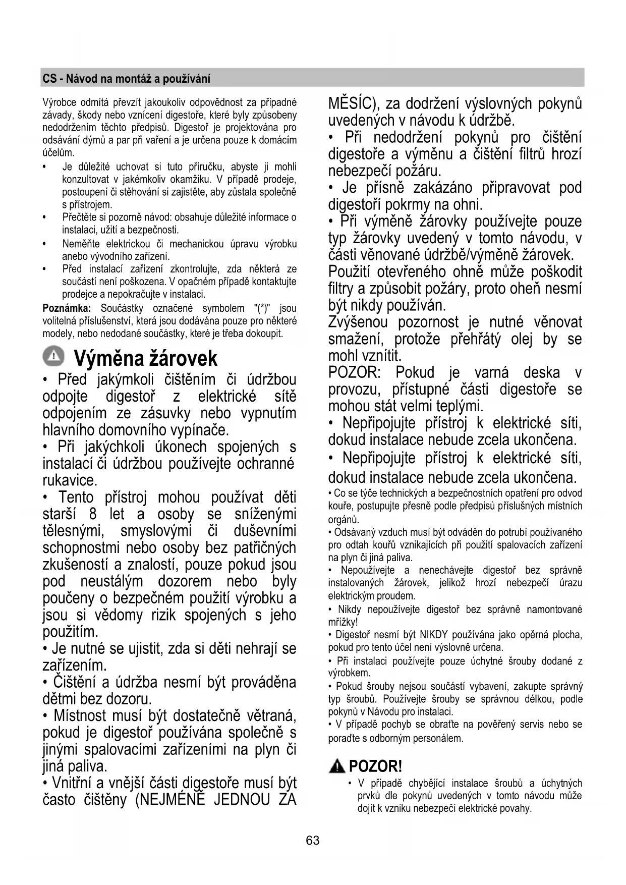- Při výměně žárovky používejte pouze typ žárovky uvedený v tomto návodu, v části věnované údržbě/výměně žárovek. Použití otevřeného ohně může poškodit filtry a způsobit požáry, proto oheň nesmí být nikdy používán. Zvýšenou pozornost je nutné věnovat smažení, protože přehřátý olej by se mohl vznítit. POZOR: Pokud je varná deska v provozu, přístupné části digestoře se mohou stát velmi teplými.
