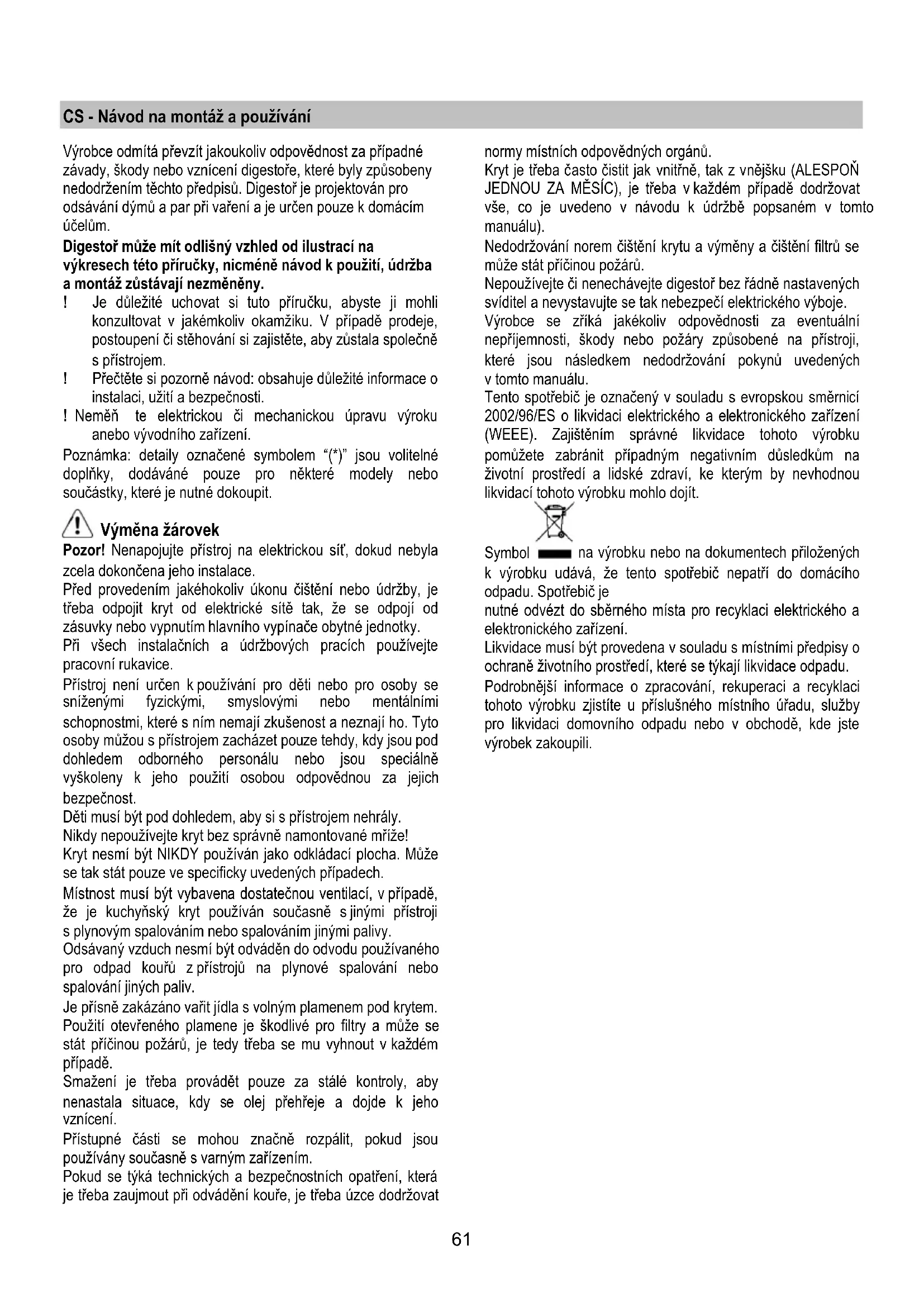 W przypadku, gdy oś wietlenie nie działa należy najpierw sprawdzić, czy lampki zostały prawidłowo zamontowane. Jeżeli po przeprowadzeniu takiej kontroli oświetlenie nadal nie działa, należy zwrócić się do serwisu.61 CS - Návod na montáž a používání Výrobce odmítá převzít jakoukoliv odpovědnost za případné závady, škody nebo vznícení digestoře, které byly způsobeny nedodržením těchto předpisů. Digestoř je projektován pro odsávání dýmů a par při vaření a je určen pouze k domácím účelům. Digestoř může mít odlišný vzhled od ilustrací na výkresech této příručky, nicméně návod k použití, údržba a montáž zůstávají nezměněny. ! Je důležité uchovat si tuto příručku, abyste ji mohli konzultovat v jakémkoliv okamžiku. V případě prodeje, postoupení či stěhování si zajistěte, aby zůstala společně s přístrojem. ! Přečtěte si pozorně návod: obsahuje důležité informace o instalaci, užití a bezpečnosti. ! Neměň te elektrickou či mechanickou úpravu výroku anebo vývodního zařízení. Poznámka: detaily označené symbolem “(*)” jsou volitelné doplňky, dodáváné pouze pro některé modely nebo součástky, které je nutné dokoupit. Výměna žárovek Pozor! Nenapojujte přístroj na elektrickou síť, dokud nebyla zcela dokončena jeho instalace. Před provedením jakéhokoliv úkonu čištění nebo údržby, je třeba odpojit kryt od elektrické sítě tak, že se odpojí od zásuvky nebo vypnutím hlavního vypínače obytné jednotky. Při všech instalačních a údržbových pracích používejte pracovní rukavice. Přístroj není určen k používání pro děti nebo pro osoby se sníženými fyzickými, smyslovými nebo mentálními schopnostmi, které s ním nemají zkušenost a neznají ho. Tyto osoby můžou s přístrojem zacházet pouze tehdy, kdy jsou pod dohledem odborného personálu nebo jsou speciálně vyškoleny k jeho použití osobou odpovědnou za jejich bezpečnost. Děti musí být pod dohledem, aby si s přístrojem nehrály. Nikdy nepoužívejte kryt bez správně namontované mříže! Kryt nesmí být NIKDY používán jako odkládací plocha. Může se tak stát pouze ve specificky uvedených případech. Místnost musí být vybavena dostatečnou ventilací, v případě, že je kuchyňský kryt používán současně s jinými přístroji s plynovým spalováním nebo spalováním jinými palivy. Odsávaný vzduch nesmí být odváděn do odvodu používaného pro odpad kouřů z přístrojů na plynové spalování nebo spalování jiných paliv. Je přísně zakázáno vařit jídla s volným plamenem pod krytem. Použití otevř eného plamene je škodlivé pro filtry a může se stát příčinou požárů, je tedy třeba se mu vyhnout v každém případě. Smažení je třeba provádět pouze za stálé kontroly, aby nenastala situace, kdy se olej přehřeje a dojde k jeho vznícení. Přístupné části se mohou značně rozpálit, pokud jsou používány současně s varným zařízením. Pokud se týká technických a bezpečnostních opatření, která je třeba zaujmout při odvádění kouře, je třeba úzce dodržovat normy místních odpovědných orgánů. Kryt je třeba často čistit jak vnitřně, tak z vnějšku (ALESPOŇ JEDNOU ZA MĚSÍC), je třeba v každém případě dodržovat vše, co je uvedeno v návodu k údržbě popsaném v tomto manuálu). Nedodržování norem čištění krytu a výměny a čiště ní filtrů se může stát příčinou požárů. Nepoužívejte či nenechávejte digestoř bez řádně nastavených svíditel a nevystavujte se tak nebezpečí elektrického výboje. Výrobce se zříká jakékoliv odpovědnosti za eventuální nepříjemnosti, škody nebo požáry způsobené na přístroji, které jsou následkem nedodržování pokynů uvedených v tomto manuálu. Tento spotřebič je označený v souladu s evropskou směrnicí 2002/96/ES o likvidaci elektrického a elektronického zařízení (WEEE). Zajištěním správné likvidace tohoto výrobku pomůžete zabránit případným negativním důsledkům na životní prostředí a lidské zdraví, ke kterým by nevhodnou likvidací tohoto výrobku mohlo dojít. Symbol na výrobku nebo na dokumentech přiložených k výrobku udává, že tento spotřebič nepatří do domácího odpadu. Spotřebič je nutné odvézt do sběrného místa pro recyklaci elektrického a elektronického zařízení. Likvidace musí být provedena v souladu s místními předpisy o ochraně životního prostředí, které se týkají likvidace odpadu. Podrobnější informace o zpracování, rekuperaci a recyklaci tohoto výrobku zjistíte u příslušného místního úřadu, služby pro likvidaci domovního odpadu nebo v obchodě, kde jste výrobek zakoupili.62 Použití Digestoř je možné použít s odsáváním mimo místnost, nebo s recirkulačním filtrem pro čištěním vzduchu v místnosti. Odsávání mimo místnost Páry jsou vyváděny mimo místnost odtahovím potrubím upevněného na spojovací přírubě. Průměr odtahového potrubí se musí rovnat průměru spojovacího prstence. Pozor! Odtahové potrubí není součástí vybavení a je třeba ho zakoupit. Horizontální část odtahového potrubí musí mít lehký sklon směrem nahoru (přibližně 10°), tak aby vzduch mohl být odváněn směrem ven snadněji. Jestliže je digestoř vybavena filtry s uhlíkem, musejí být vyňaty. Napojte digestoř na odtahového potrubí se stejným průměrem jako vývod vzduchu (spojovací příruba). Použití odtahového potrubí s menším průměrem způsobí snížení výkonu a zvýšení hluku. Za to výrobce odmítá jakoukoliv zodpovědnost. ! Používejte co nejkratší odtahové potrubí. ! Používejte odtahové potrubí s co nejmenším počtem záhybů (maximální úhel záhybu: 90°). ! Vyhněte se zásadním změnám sekce veden