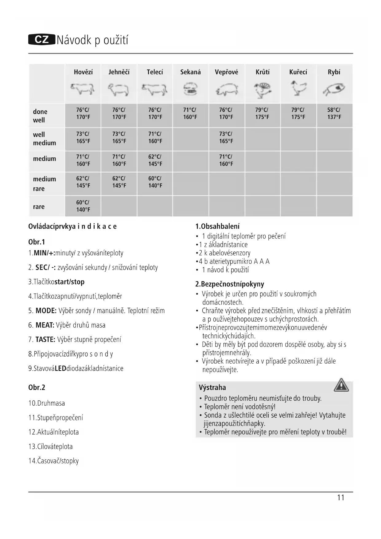 - Teploměrnepoužívejte proměření teploty vtroubě!12 Upozornění –baterie