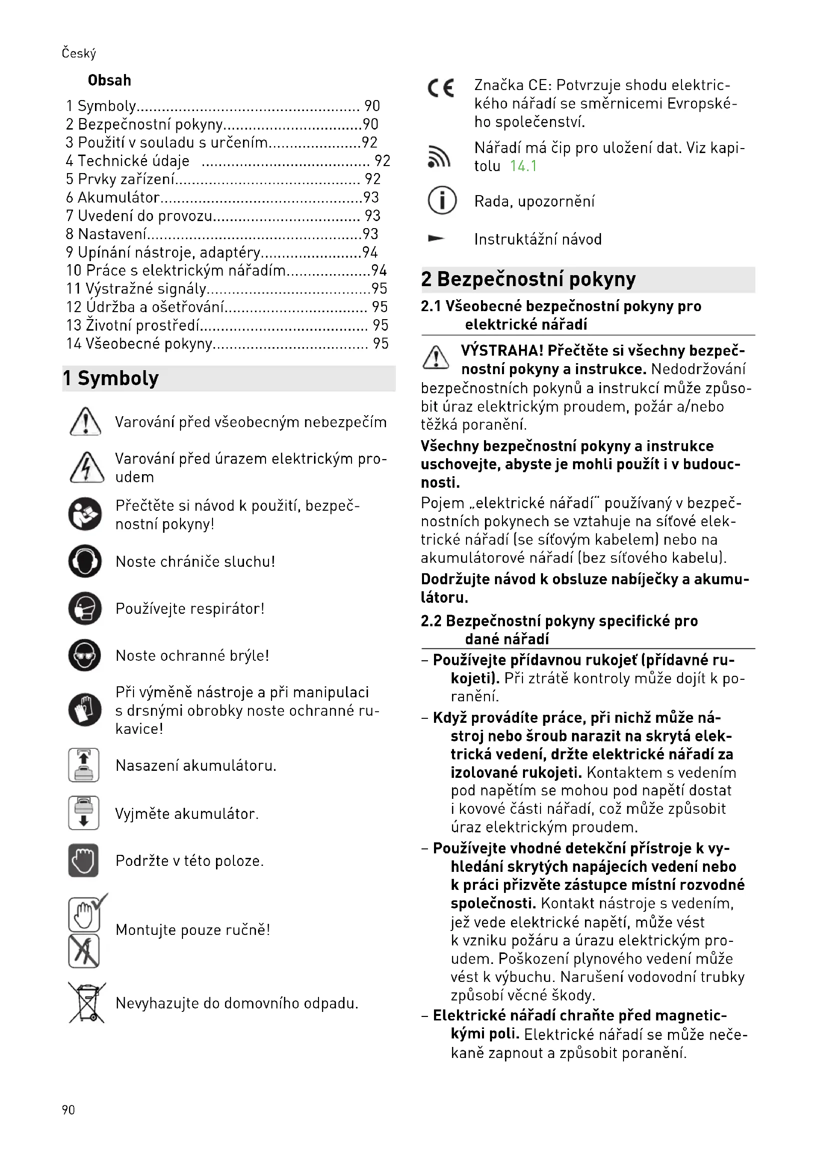 - 14 Všeobecné pokyny 1 Symboly Varování před všeobecným nebezpečím Varování před úrazem elektrickým pro udem Přečtěte si návod k použití, bezpeč nostní pokyny! Noste chrániče sluchu! Používejte respirátor! Noste ochranné brýle! Při výměně nástroje a při manipulaci s drsnými obrobky noste ochranné ru kavice! Nasazení akumulátoru. Vyjměte akumulátor. Podržte v této poloze. Montujte pouze ručně! Nevyhazujte do domovního odpadu. Značka CE: Potvrzuje shodu elektric kého nářadí se směrnicemi Evropské ho společenství. Nářadí má čip pro uložení dat. Viz kapi tolu p. 95