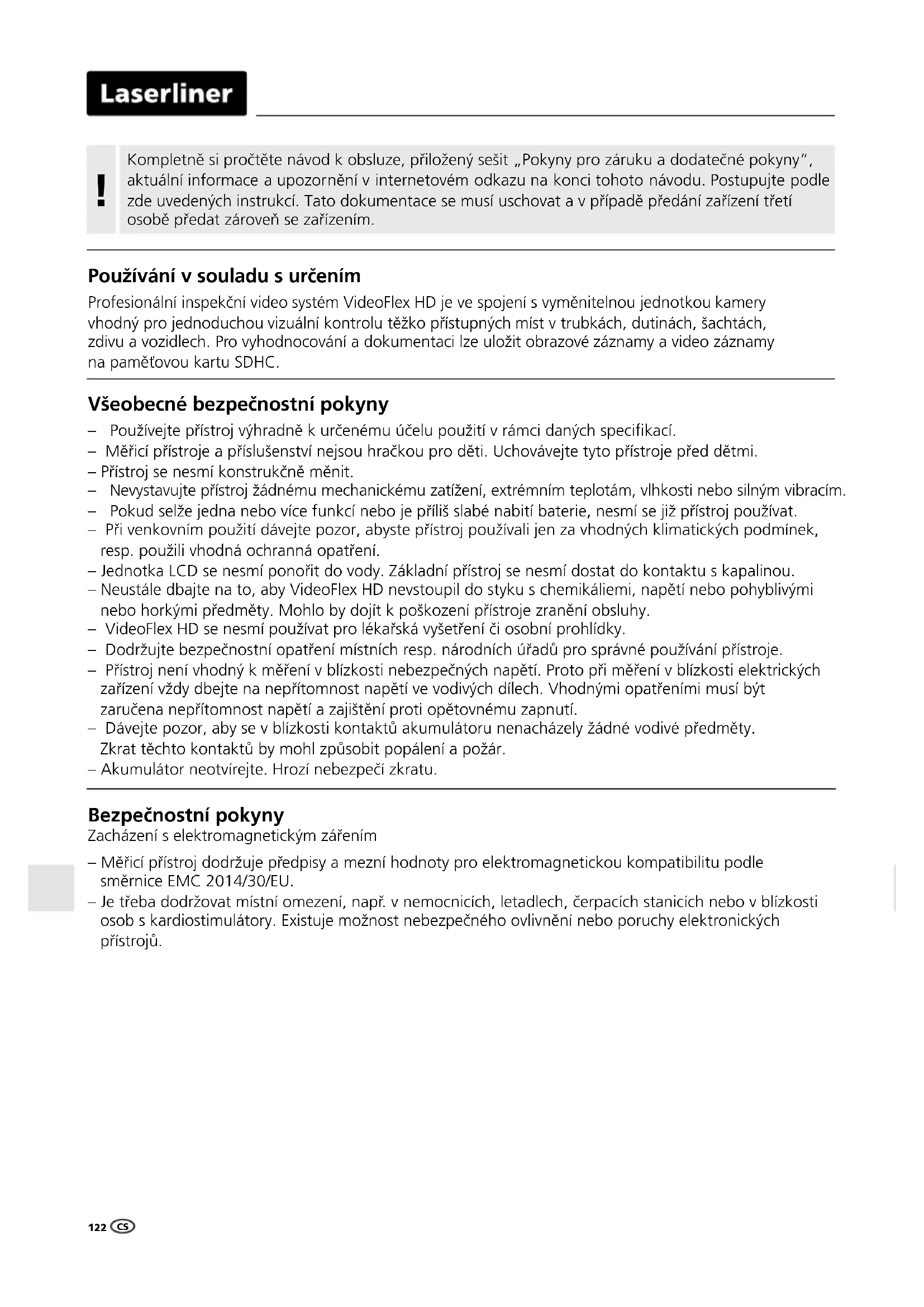 UK– Měřicí přístroj dodržuje předpisy a mezní hodnoty pro elektromagnetickou kompatibilitu podle směrnice EMC 2014/30/EU. – Je třeba dodržovat místní omezení, např. v nemocnicích, letadlech, čerpacích stanicích nebo v blízkosti osob s kardiostimulátory. Existuje možnost nebezpečného ovlivnění nebo poruchy elektronických přístrojů. Bezpečnostní pokyny Zacházení s elektromagnetickým zářením Používání v souladu s určením Profesionální inspekční video systém VideoFlex HD je ve spojení s vyměnitelnou jednotkou kamery vhodný pro jednoduchou vizuální kontrolu těžko přístupných míst v trubkách, dutinách, šachtách, zdivu a vozidlech. Pro vyhodnocování a dokumentaci lze uložit obrazové záznamy a video záznamy na paměťovou kartu SDHC. Všeobecné bezpečnostní pokyny – Používejte přístroj výhradně k určenému účelu použití v rámci daných specikací. – Měřicí přístroje a příslušenství nejsou hračkou pro děti. Uchovávejte tyto přístroje před dětmi. – Přístroj se nesmí konstrukčně měnit. – Nevystavujte přístroj žádnému mechanickému zatížení, extrémním teplotám, vlhkosti nebo silným vibracím. – Pokud selže jedna nebo více funkcí nebo je příliš slabé nabití baterie, nesmí se již přístroj používat. – Při venkovním použití dávejte pozor, abyste přístroj používali jen za vhodných klimatických podmínek, resp. použili vhodná ochranná opatření. – Jednotka LCD se nesmí ponořit do vody. Základní přístroj se nesmí dostat do kontaktu s kapalinou. – Neustále dbajte na to, aby VideoFlex HD nevstoupil do styku s chemikáliemi, napětí nebo pohyblivými nebo horkými předměty. Mohlo by dojít k poškození přístroje zranění obsluhy. – VideoFlex HD se nesmí používat pro lékařská vyšetření či osobní prohlídky. – Dodržujte bezpečnostní opatření místních resp. národních úřadů pro správné používání přístroje. – Přístroj není vhodný k měření v blízkosti nebezpečných napětí. Proto při měření v blízkosti elektrických zařízení vždy dbejte na nepřítomnost napětí ve vodivých dílech. Vhodnými opatřeními musí být zaručena nepřítomnost napětí a zajištění proti opětovnému zapnutí. – Dávejte pozor, aby se v blízkosti kontaktů akumulátoru nenacházely žádné vodivé předměty. Zkrat těchto kontaktů by mohl způsobit popálení a požár. – Akumulátor neotvírejte. Hrozí nebezpečí zkratu. Kompletně si pročtěte návod k obsluze, přiložený sešit „Pokyny pro záruku a dodatečné pokyny“, aktuální informace a upozornění v internetovém odkazu na konci tohoto návodu. Postupujte podle zde uvedených instrukcí. Tato dokumentace se musí uschovat a v případě předání zařízení třetí osobě předat zároveň se zařízením.