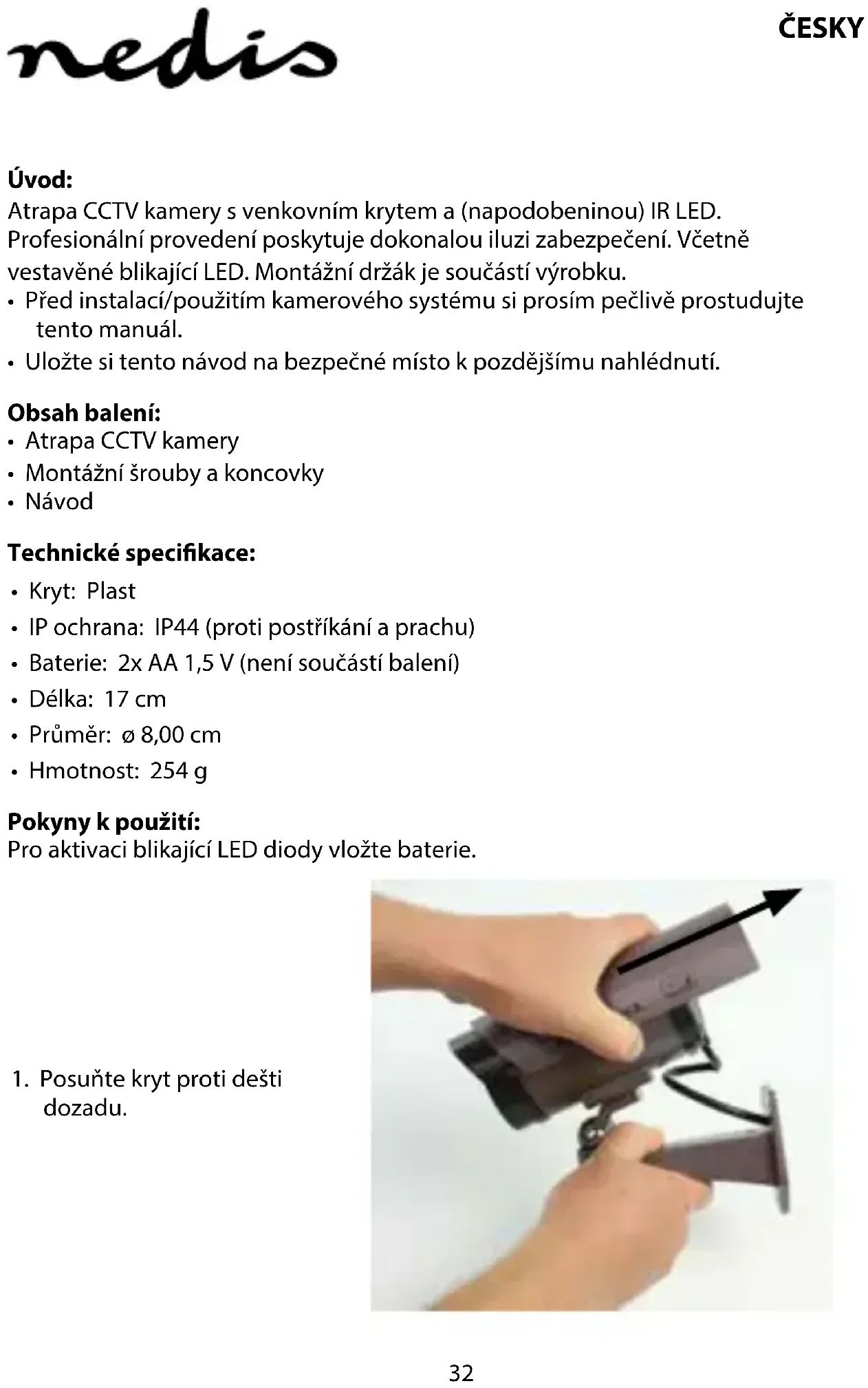 Úvod: Atrapa CCTV kamery s venkovním krytem a (napodobeninou) IR LED. Profesionální provedení poskytuje dokonalou iluzi zabezpečení. Včetně vestavěné blikající LED. Montážní držák je součástí výrobku.