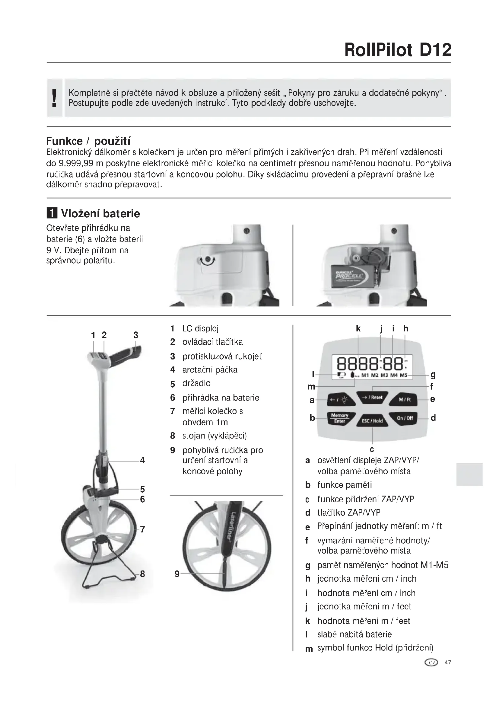 Funkce / použití Elektronický dálkomŌr s koleňkem je urňen pro mŌŪení pŪímých i zakŪivených drah. PŪi mŌŪení vzdálenosti do 9.999,99 m poskytne elektronické mŌŪicí koleňko na centimetr pŪesnou namŌŪenou hodnotu. Pohyblivá ruňiňka udává pŪesnou startovní a koncovou polohu. Díky skládacímu provedení a pŪepravní brašnŌ lze dálkomŌr snadno pŪepravovat. OtevŪete pŪihrádku na baterie (6) a vložte baterii 9 V. Dbejte pŪitom na správnou polaritu. Vložení baterie LC displej ovládací tlaňítka protiskluzová rukojeů aretaňní páňka držadlo pŪihrádka na baterie mŌŪicí koleňko s obvdem 1m stojan (vyklápŌcí) pohyblivá ruňiňka pro urňení startovní a koncové polohy