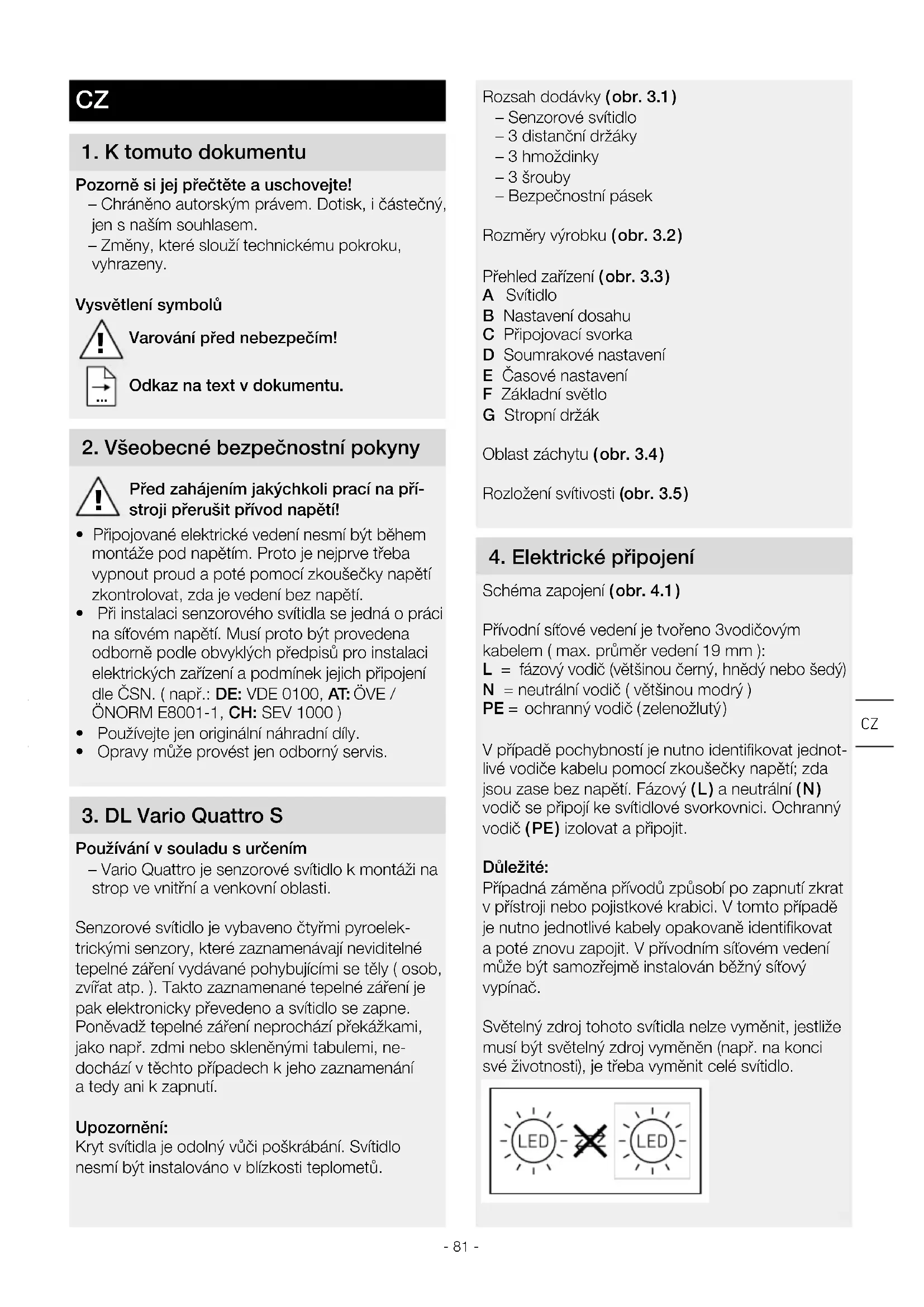 Používání vsouladu surčením – Vario Quattro je senzorové svítidlo k montáži na strop ve vnitřní avenkovní oblasti. Senzorové svítidlo je vybaveno čtyřmi pyroelek- trickými senzory, které zaznamenávají neviditelné tepelné záření vydávané pohybujícími se těly ( osob, zvířat atp. ). Takto zaznamenané tepelné záření je pak elektronicky převedeno a svítidlo se zapne. Poněvadž tepelné záření neprochází překážkami, jako např. zdmi nebo skleněnými tabulemi, ne- dochází vtěchto případech kjeho zaznamenání atedy ani kzapnutí. Upozornění: Kryt svítidla je odolný vůči poškrábání. Svítidlo nesmí být instalováno v blízkosti teplometů.