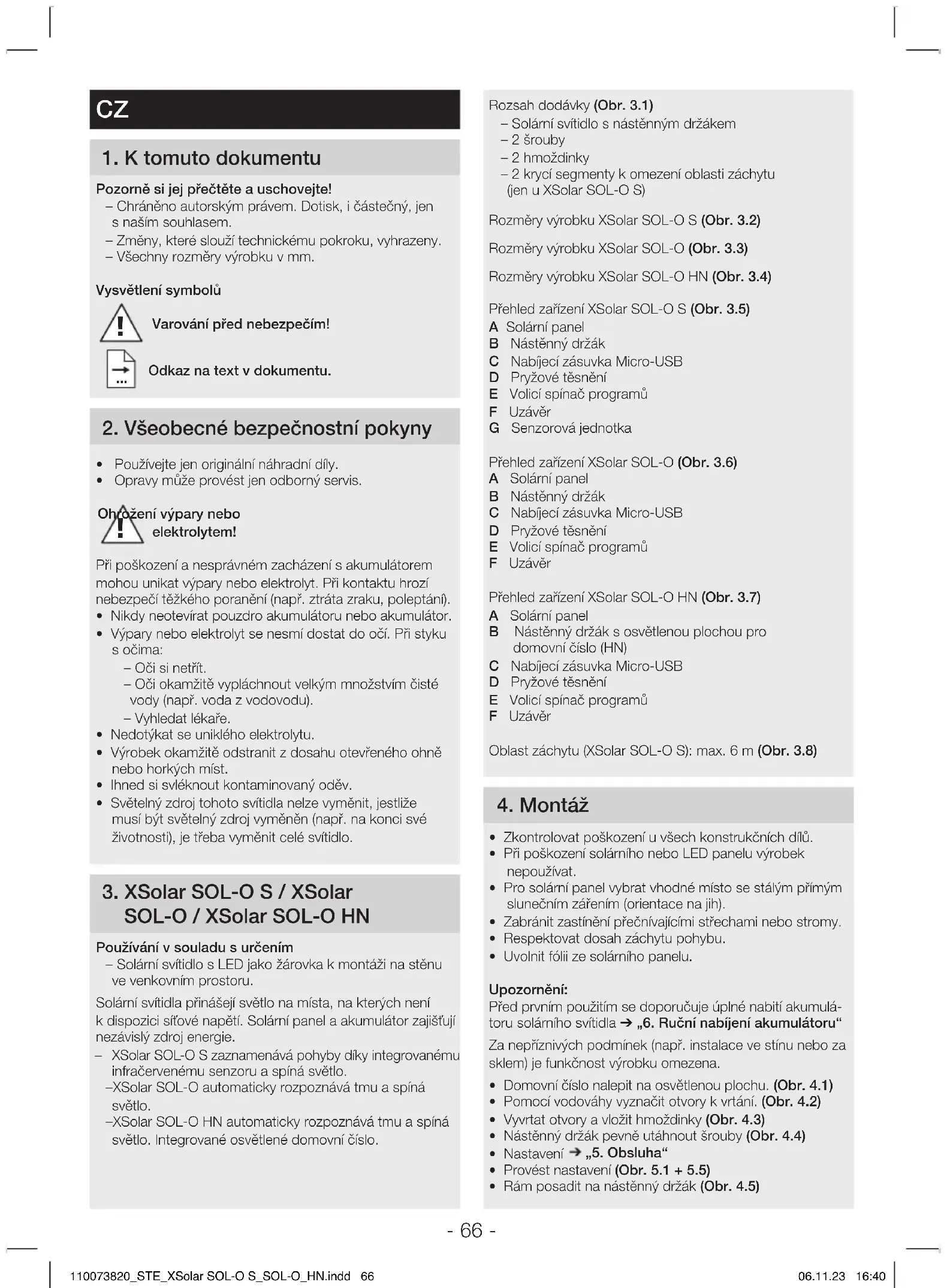 110073820_STE_XSolar SOL-O S_SOL-O_HN.indd 65110073820_STE_XSolar SOL-O S_SOL-O_HN.indd 65 06.11.23 16:4006.11.23 16:40- 66 - Rozsahdodávky (Obr 31) – Solární svítidlo s nástěnným držákem – 2 šrouby – 2 hmoždinky – 2 krycí segmenty k omezení oblasti záchytu (jen u XSolarSOL-OS) Rozměry výrobku XSolarSOL-OS (Obr 32) Rozměry výrobku XSolarSOL-O (Obr 33) Rozměry výrobku XSolarSOL-OHN (Obr 34) Přehled zařízení XSolarSOL-OS (Obr 35) A Solární panel B Nástěnný držák C Nabíjecí zásuvka Micro-USB D Pryžové těsnění E Volicí spínač programů F Uzávěr G Senzorová jednotka Přehled zařízení XSolarSOL-O (Obr 36) A Solární panel B Nástěnný držák C Nabíjecí zásuvka Micro-USB D Pryžové těsnění E Volicí spínač programů F Uzávěr Přehled zařízení XSolarSOL-OHN (Obr 37) A Solární panel B Nástěnný držák s osvětlenou plochou pro domovní číslo (HN) C Nabíjecí zásuvka Micro-USB D Pryžové těsnění E Volicí spínač programů F Uzávěr Oblast záchytu (XSolarSOL-OS): max. 6m (Obr 38) 4 Montáž