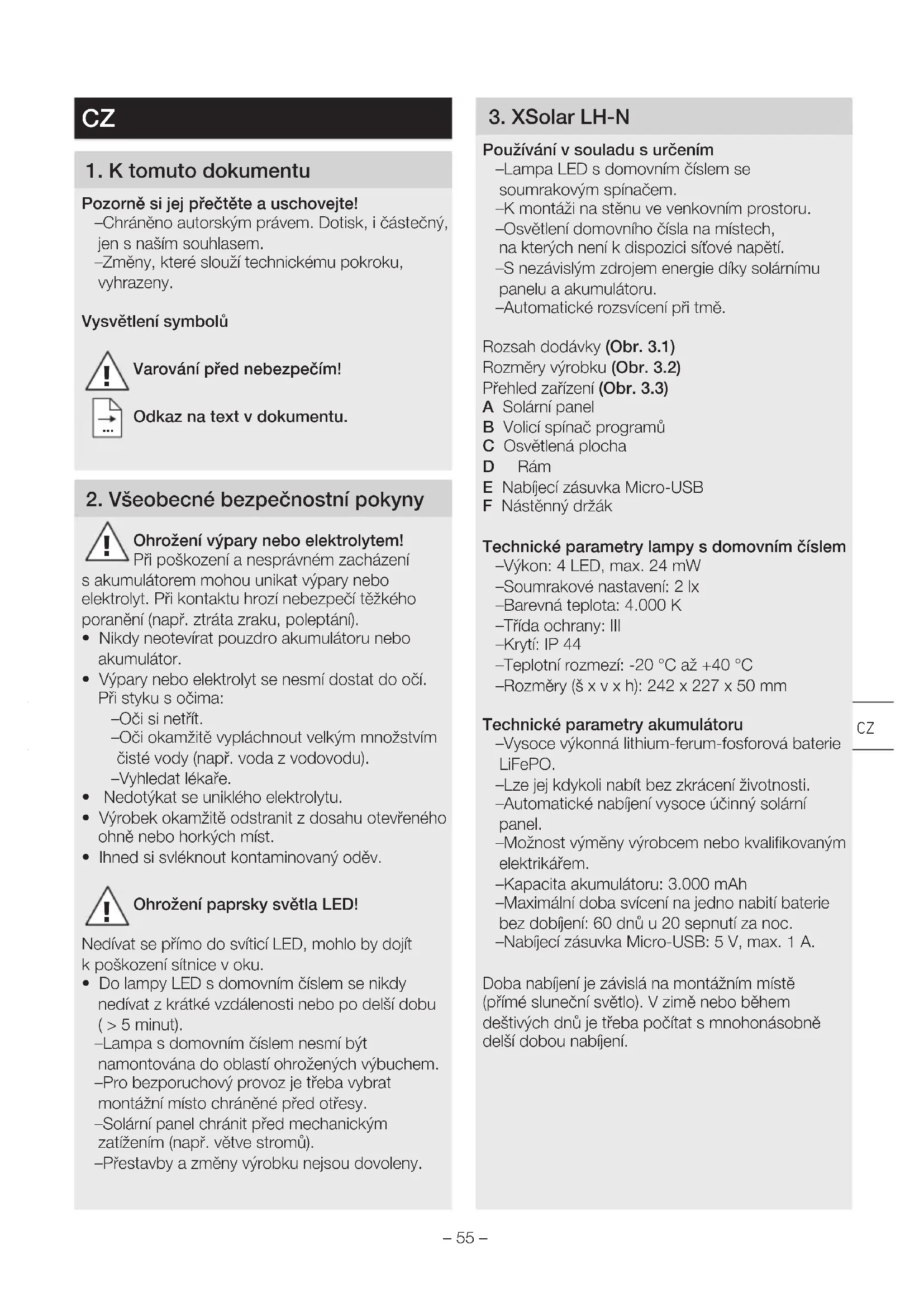 - Do lampy LED s domovním číslem se nikdy nedívat z krátké vzdálenosti nebo po delší dobu (>5 minut). – Lampa s domovním číslem nesmí být namontována do oblastí ohrožených výbuchem. – Pro bezporuchový provoz je třeba vybrat montážní místo chráněné před otřesy. – Solární panel chránit před mechanickým zatížením (např. větve stromů). – Přestavby a změny výrobku nejsou dovoleny. 3 XSolar LH-N Používání v souladu s určením – Lampa LED s domovním číslem se soumrakovým spínačem. – K montáži na stěnu ve venkovním prostoru. – Osvětlení domovního čísla na místech, na kterých není k dispozici síťové napětí. – S nezávislým zdrojem energie díky solárnímu panelu a akumulátoru. – Automatické rozsvícení při tmě. Rozsah dodávky (Obr 31) Rozměry výrobku (Obr 32) Přehled zařízení (Obr 33) A Solární panel B Volicí spínač programů C Osvětlená plocha D Rám E Nabíjecí zásuvka Micro-USB F Nástěnný držák Technické parametry lampy s domovním číslem – Výkon: 4 LED, max. 24 mW – Soumrakové nastavení: 2 lx – Barevná teplota: 4.000 K – Třída ochrany: III – Krytí: IP 44 – Teplotní rozmezí: -20 °C až +40 °C – Rozměry (šxvxh): 242 x 227 x 50 mm Technické parametry akumulátoru – Vysoce výkonná lithium-ferum-fosforová baterie LiFePO. – Lze jej kdykoli nabít bez zkrácení životnosti. – Automatické nabíjení vysoce účinný solární panel. – Možnost výměny výrobcem nebo kvalifikovaným elektrikářem. – Kapacita akumulátoru: 3.000mAh – Maximální doba svícení na jedno nabití baterie bez dobíjení: 60 dnů u 20 sepnutí za noc. – Nabíjecí zásuvka Micro-USB: 5 V, max. 1 A. Doba nabíjení je závislá na montážním místě (přímé sluneční světlo). V zimě nebo během deštivých dnů je třeba počítat s mnohonásobně delší dobou nabíjení. CZ– 56 – 4 Montáž