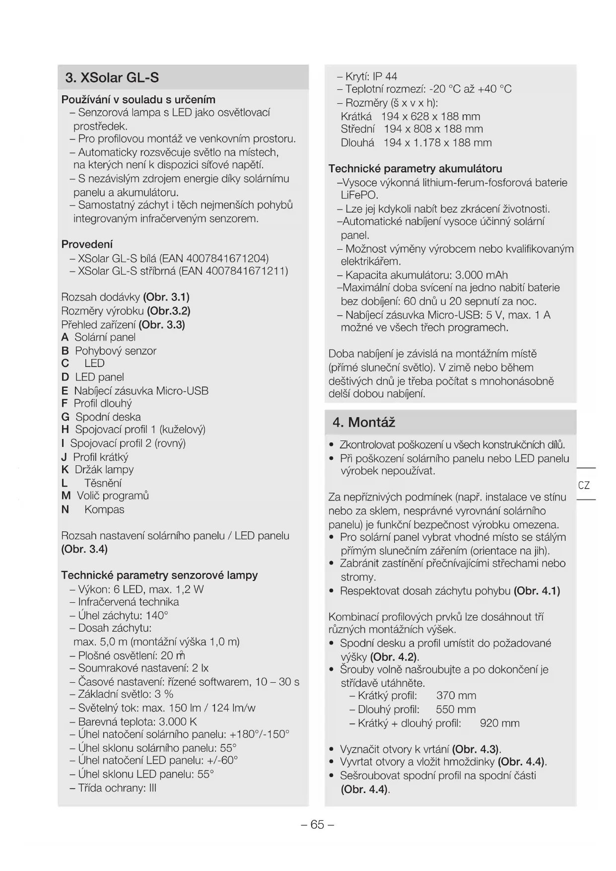 Používání v souladu s určením – Senzorová lampa s LED jako osvětlovací prostředek. – Pro profilovou montáž ve venkovním prostoru. – Automaticky rozsvěcuje světlo na místech, na kterých není k dispozici síťové napětí. – S nezávislým zdrojem energie díky solárnímu panelu a akumulátoru. – Samostatný záchyt i těch nejmenších pohybů integrovaným infračerveným senzorem. Provedení – XSolar GL-S bílá (EAN4007841671204) – XSolar GL-S stříbrná (EAN4007841671211) Rozsah dodávky (Obr. 3.1) Rozměry výrobku (Obr.3.2) Přehled zařízení (Obr. 3.3) A Solární panel B Pohybový senzor C LED D LED panel E Nabíjecí zásuvka Micro-USB F Profil dlouhý G Spodní deska H Spojovací profil 1 (kuželový) I Spojovací profil 2 (rovný) J Profil krátký K Držák lampy L Těsnění M Volič programů N Kompas Rozsah nastavení solárního panelu/LED panelu (Obr. 3.4) Technické parametry senzorové lampy – Výkon: 6 LED, max. 1,2 W – Infračervená technika – Úhel záchytu: 140° – Dosah záchytu: max. 5,0 m (montážní výška 1,0 m) – Plošné osvětlení: 20 m