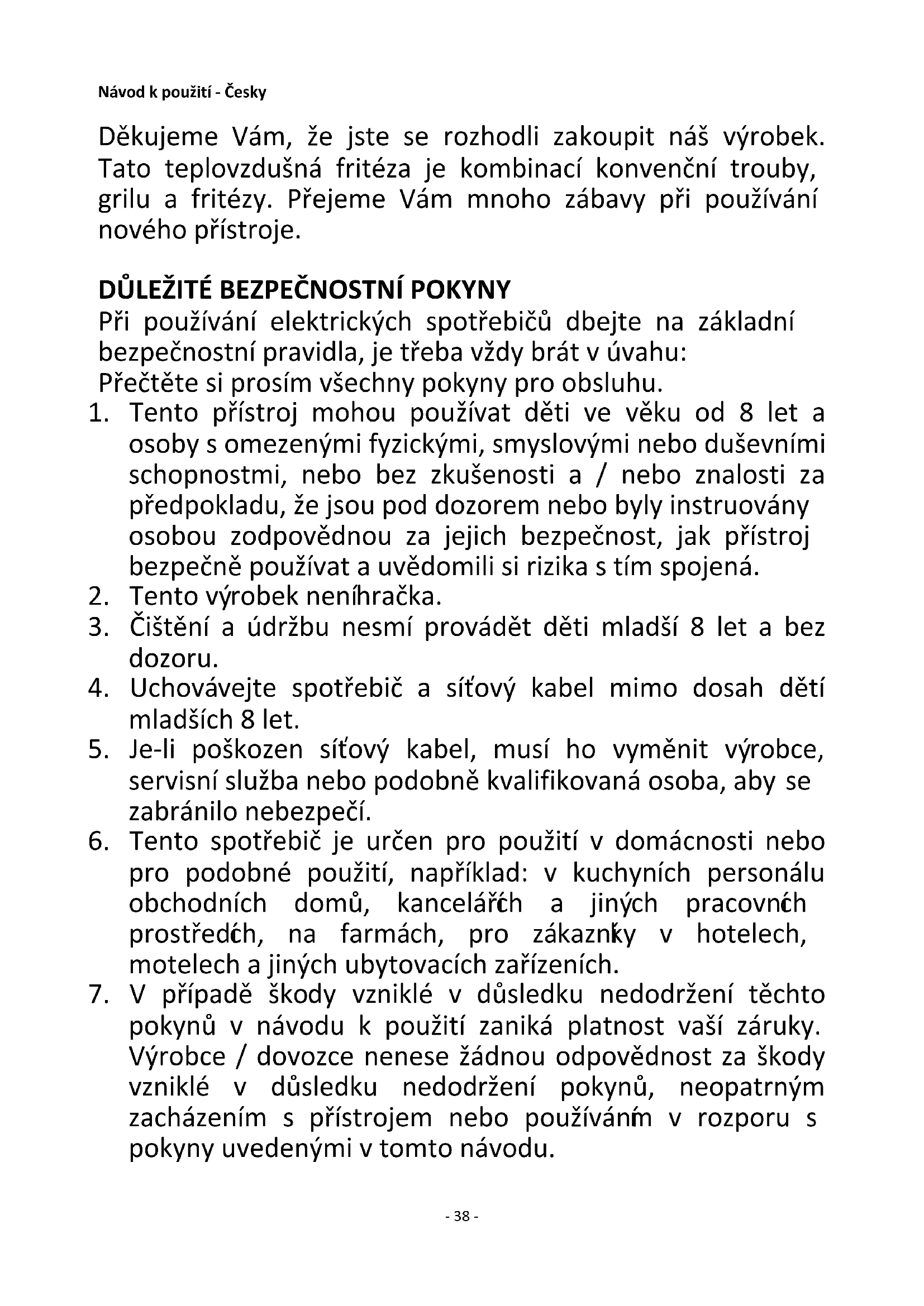 pokynů v návodu k použití zaniká platnost vaší záruky. Výrobce / dovozce nenese žádnou odpovědnost za škody vzniklé v důsledku nedodržení pokynů, neopatrným zacházením s přístrojem nebo používáním v rozporu s pokyny uvedenými v tomto návodu.- 39 -