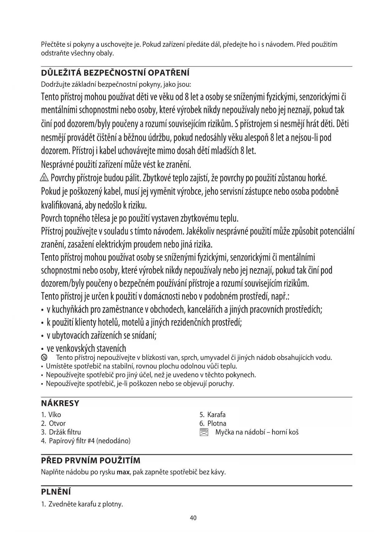 AE40 Přečtěte si pokyny a uschovejte je. Pokud zařízení předáte dál, předejte ho i s návodem. Před použitím odstraňte všechny obaly. DŮLEŽITÁ BEZPEČNOSTNÍ OPATŘENÍ Dodržujte základní bezpečnostní pokyny, jako jsou: Tento přístroj mohou používat děti ve věku od 8 let a osoby se sníženými fyzickými, senzorickými či mentálními schopnostmi nebo osoby, které výrobek nikdy nepoužívaly nebo jej neznají, pokud tak činí pod dozorem/byly poučeny a rozumí souvisejícím rizikům. S přístrojem si nesmějí hrát děti. Děti nesmějí provádět čištění a běžnou údržbu, pokud nedosáhly věku alespoň 8 let a nejsou-li pod dozorem. Přístroj i kabel uchovávejte mimo dosah dětí mladších 8 let. Nesprávné použití zařízení může vést ke zranění. h Povrchy přístroje budou pálit. Zbytkové teplo zajistí, že povrchy po použití zůstanou horké. Pokud je poškozený kabel, musí jej vyměnit výrobce, jeho servisní zástupce nebo osoba podobně kvalikovaná, aby nedošlo k riziku. Povrch topného tělesa je po použití vystaven zbytkovému teplu. Přístroj používejte v souladu s tímto návodem. Jakékoliv nesprávné použití může způsobit potenciální zranění, zasažení elektrickým proudem nebo jiná rizika. Tento přístroj mohou používat osoby se sníženými fyzickými, senzorickými či mentálními schopnostmi nebo osoby, které výrobek nikdy nepoužívaly nebo jej neznají, pokud tak činí pod dozorem/byly poučeny o bezpečném používání přístroje a rozumí souvisejícím rizikům. Tento přístroj je určen k použití v domácnosti nebo v podobném prostředí, např.: