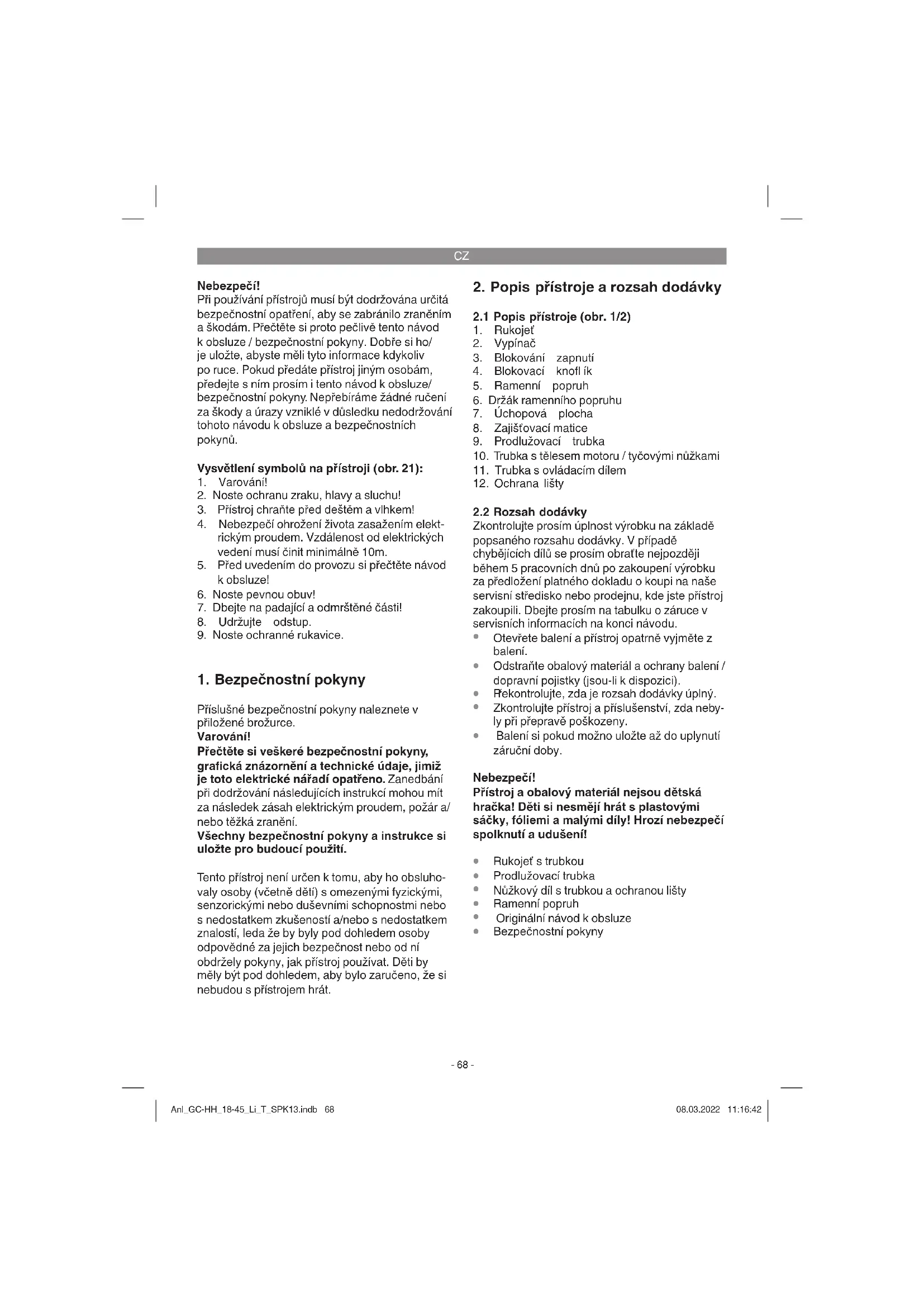 Přístroj se dodává bez akumulátorů a bez nabíječky a smí se používat pouze s Li-Ion aku- mulátory série Power-X-Change! Pozor! Akumulátor namontujte teprve po kompletním smontování přístroje a provedení veškerých nastavení. Pokud provádíte práce na Anl_GC-HH_18-45_Li_T_SPK13.indb 69Anl_GC-HH_18-45_Li_T_SPK13.indb 69 08.03.2022 11:16:4208.03.2022 11:16:42CZ