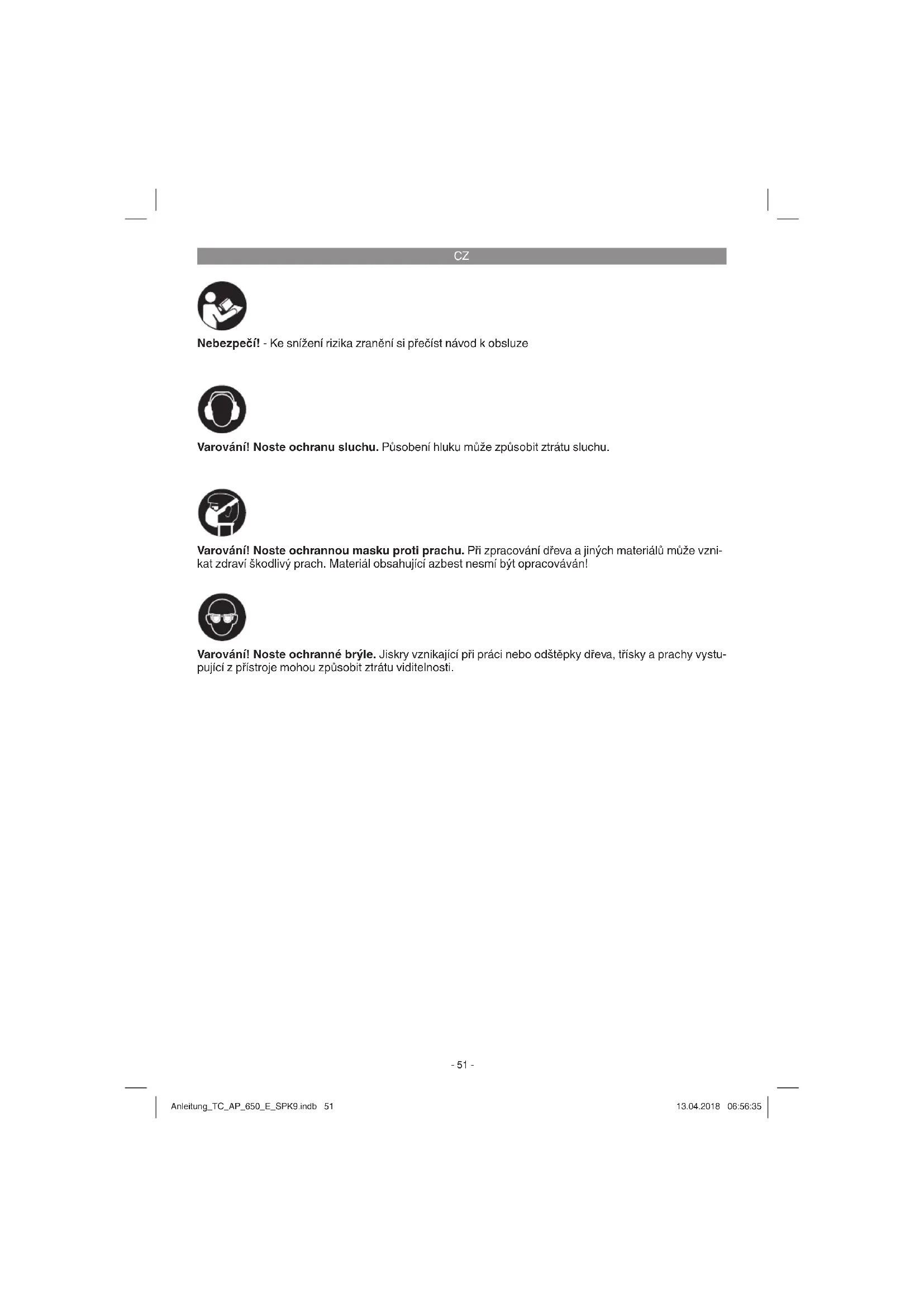 Nebezpečí! - Ke snížení rizika zranění si přečíst návod k obsluze Varování! Noste ochranu sluchu. Působení hluku může způsobit ztrátu sluchu. Varování! Noste ochranné brýle. Jiskry vznikající při práci nebo odštěpky dřeva, třísky a prachy vystu- pující z přístroje mohou způsobit ztrátu viditelnosti. Varování! Noste ochrannou masku proti prachu. Při zpracování dřeva a jiných materiálů může vzni- kat zdraví škodlivý prach. Materiál obsahující azbest nesmí být opracováván! Anleitung_TC_AP_650_E_SPK9.indb 51Anleitung_TC_AP_650_E_SPK9.indb 51 13.04.2018 06:56:3513.04.2018 06:56:35CZ