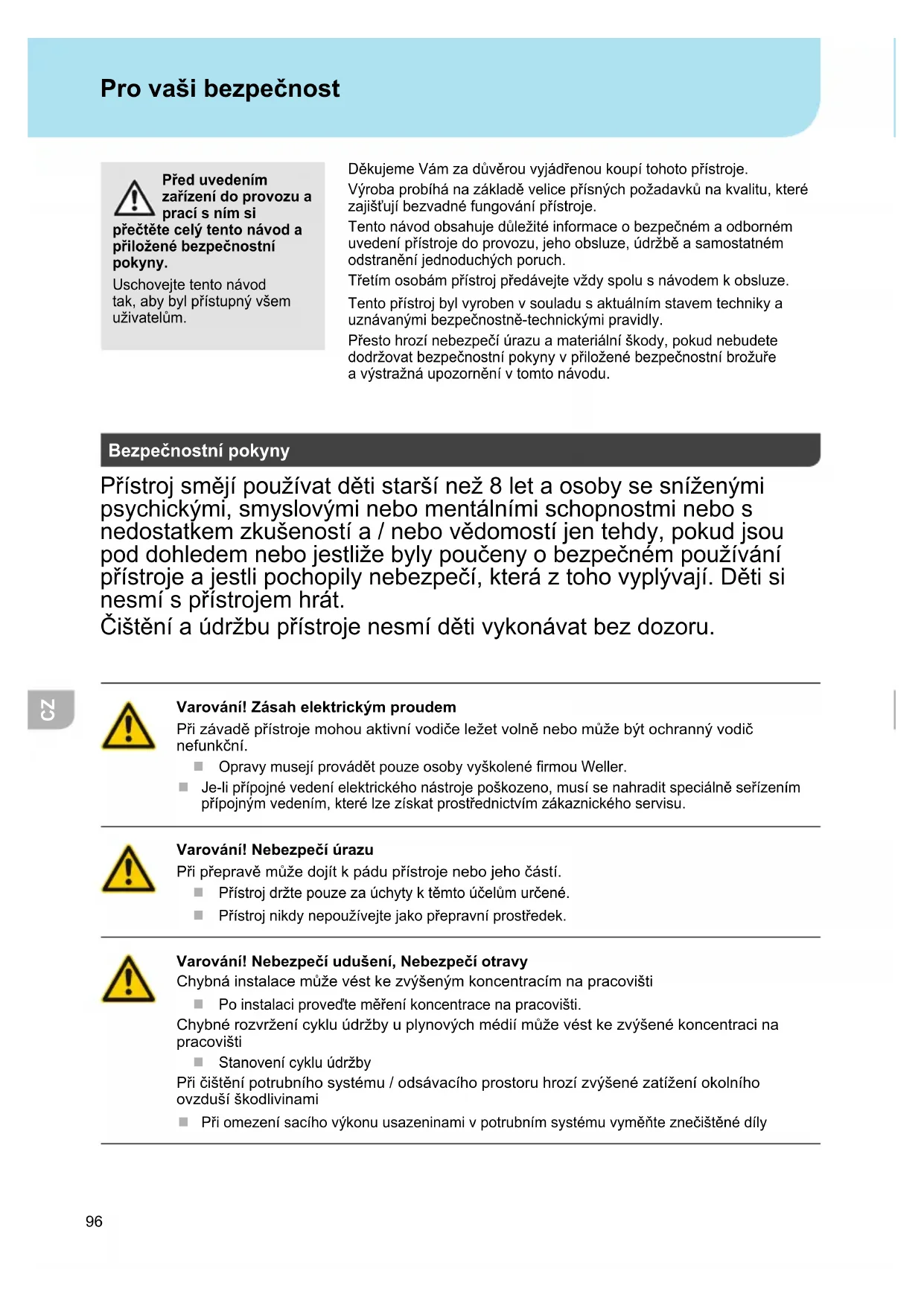 kujemeámzadůvrouvyjádřenoukoupítohotopřístroje roaproíhánazákladvelicepřísnchpožadavkůnakvalitukteré zajiujíezvadnéfungovánípřístroje Tentonávodosahujedůležitéinformaceoezpenémaodorném uvedenípřístrojedoprovozujehoosluzedržasamostatném odstranníjednoduchchporuch Třetímosoámpřístrojpředávejtevždyspolusnávodemkosluze Tentopřístrojylvyroenvsouladusaktuálnímstavemtechnikya uznávanmiezpenostntechnickmipravidly Přestohrozíneezpeírazuamateriálníkodypokudneudete dodržovatezpenostnípokynyvpřiloženéezpenostnírožuře avstražnáupozornnívtomtonávodu Pro vaši bezpečnost Před uvedením zařízení do provozu a prací s ním si přečtěte celý tento návod a přiložené bezpečnostní pokyny. schovejtetentonávod takayylpřístupnvem uživatelům Bezpečnostní pokyny Přístrojsmjípoužívatdtistarínežletaosoysesníženmi psychickmismyslovmineomentálnímischopnostmineos nedostatkemzkuenostíaneovdomostíjentehdypokudjsou poddohledemneojestližeylypouenyoezpenémpoužívání přístrojeajestlipochopilyneezpeíkteráztohovyplvajítisi nesmíspřístrojemhrát itníadržupřístrojenesmídtivykonávatezdozoru Varování! Zásah elektrickým proudem Přizávadpřístrojemohouaktivnívodieležetvolnneomůžetochrannvodi nefunkní Opravymusejíprovádtpouzeosoyvykolenérmoueller elipřípojnévedeníelektrickéhonástrojepokozenomusísenahraditspeciálnseřízením přípojnmvedenímkterélzezískatprostřednictvímzákaznickéhoservisu Varování! Nebezpečí úrazu Připřepravmůžedojítkpádupřístrojeneojehoástí Přístrojdržtepouzezachytyktmtoelůmurené Přístrojnikdynepoužívejtejakopřepravníprostředek Varování! Nebezpečí udušení, Nebezpečí otravy hynáinstalacemůževéstkezvenmkoncentracímnapracoviti Poinstalaciprovetemřeníkoncentracenapracoviti hynérozvrženícykludržyuplynovchmédiímůževéstkezvenékoncentracina pracovišti tanovenícykludržy Přiitnípotruníhosystémuodsávacíhoprostoruhrozízvenézatíženíokolního ovzduíkodlivinami Přiomezenísacíhovkonuusazeninamivpotrunímsystémuvymtezneitnédíly97