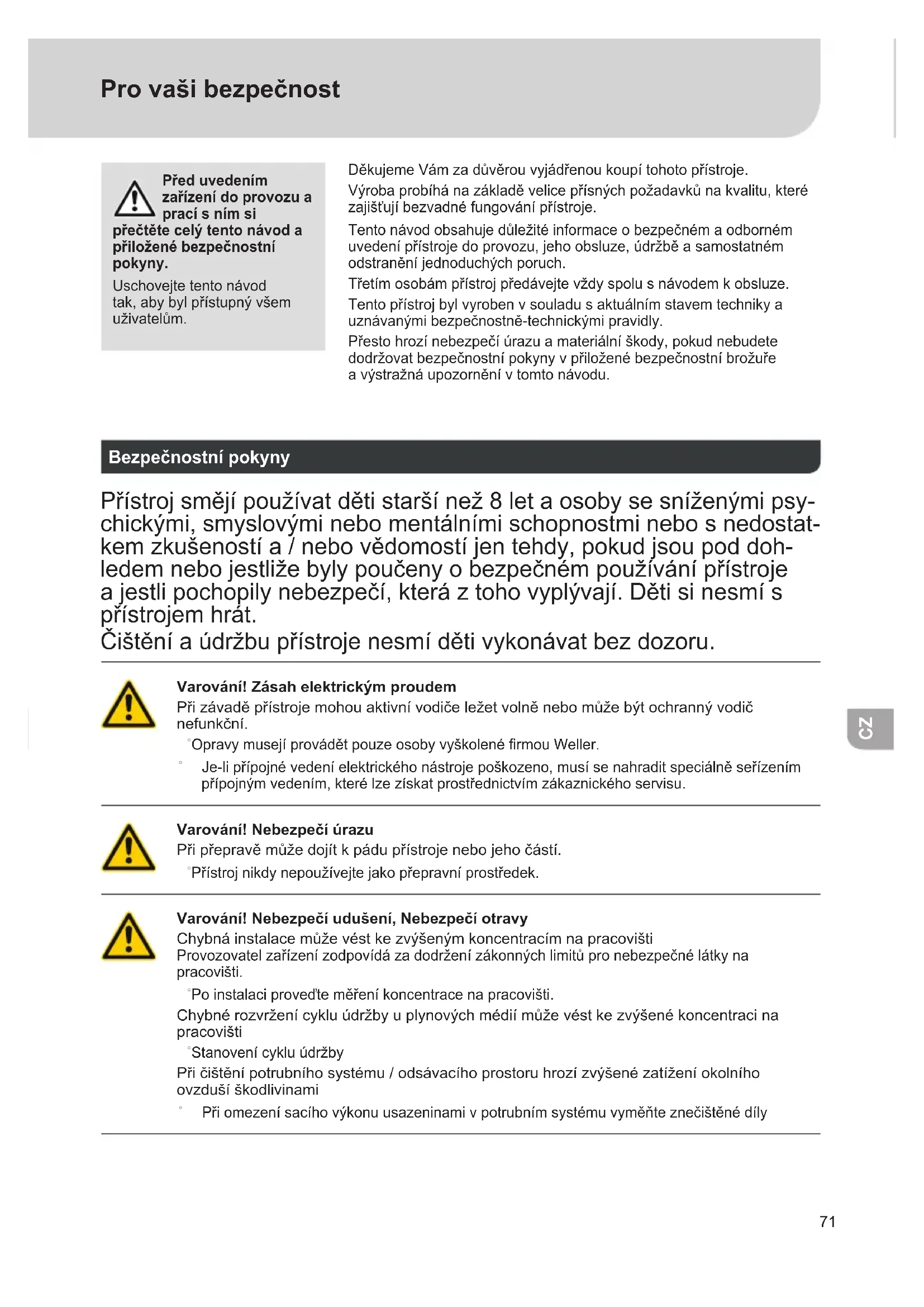 Pro vaši bezpečnost Před uvedením zařízení do provozu a prací s ním si přečtěte celý tento návod a přiložené bezpečnostní pokyny. Uschovejtetentonávod tak,abybylpřístupnývšem uživatelům. DěkujemeVámzadůvěrouvyjádřenoukoupítohotopřístroje. Výrobaprobíhánazákladěvelicepřísnýchpožadavkůnakvalitu,které zajišťujíbezvadnéfungovánípřístroje. Tentonávodobsahujedůležitéinformaceobezpečnémaodborném uvedenípřístrojedoprovozu,jehoobsluze,údržběasamostatném odstraněníjednoduchýchporuch. Třetímosobámpřístrojpředávejtevždyspolusnávodemkobsluze. Tentopřístrojbylvyrobenvsouladusaktuálnímstavemtechnikya uznávanýmibezpečnostně-technickýmipravidly. Přestohrozínebezpečíúrazuamateriálníškody,pokudnebudete dodržovatbezpečnostnípokynyvpřiloženébezpečnostníbrožuře avýstražnáupozorněnívtomtonávodu. Bezpečnostní pokyny Přístrojsmějípoužívatdětistaršínež8letaosobysesníženýmipsy- chickými,smyslovýminebomentálnímischopnostminebosnedostat- kemzkušenostía/nebovědomostíjentehdy,pokudjsoupoddoh- ledemnebojestližebylypoučenyobezpečnémpoužívánípřístroje ajestlipochopilynebezpečí,kteráztohovyplývají.Dětisinesmís přístrojemhrát. Čištěníaúdržbupřístrojenesmídětivykonávatbezdozoru. Varování! Zásah elektrickým proudem Přizávaděpřístrojemohouaktivnívodičeležetvolněnebomůžebýtochrannývodič nefunkční. ˚ OpravymusejíprovádětpouzeosobyvyškolenérmouWeller. ˚ Je-lipřípojnévedeníelektrickéhonástrojepoškozeno,musísenahraditspeciálněseřízením přípojnýmvedením,kterélzezískatprostřednictvímzákaznickéhoservisu. Varování! Nebezpečí úrazu Připřepravěmůžedojítkpádupřístrojenebojehočástí. ˚ Přístrojnikdynepoužívejtejakopřepravníprostředek. Varování! Nebezpečí udušení, Nebezpečí otravy Chybnáinstalacemůževéstkezvýšenýmkoncentracímnapracovišti Provozovatelzařízenízodpovídázadodrženízákonnýchlimitůpronebezpečnélátkyna pracovišti. ˚ Poinstalaciproveďteměřeníkoncentracenapracovišti. Chybnérozvrženícykluúdržbyuplynovýchmédiímůževéstkezvýšenékoncentracina pracovišti ˚ Stanovenícykluúdržby Přičištěnípotrubníhosystému/odsávacíhoprostoruhrozízvýšenézatíženíokolního ovzdušíškodlivinami ˚ Přiomezenísacíhovýkonuusazeninamivpotrubnímsystémuvyměňteznečištěnédíly72