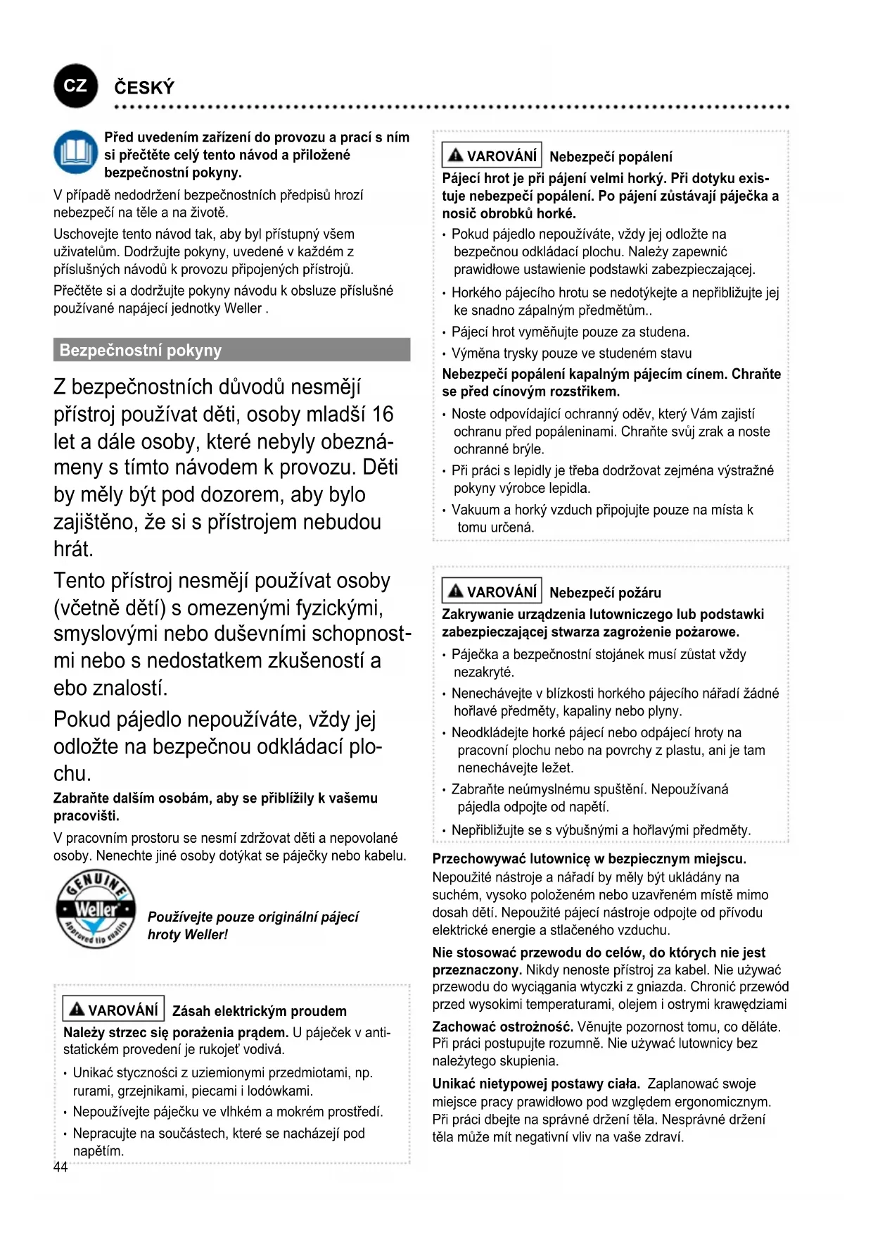 Před uvedenm zařzen do provozu a prac s nm si přečtěte celý tento návod a přiložené bezpečnostn pokyny. V případě nedodržení bezpečnostních předpisů hrozí nebezpečí na těle a na životě. Uschovejte tento návod tak, aby byl přístupný všem uživatelům. Dodržujte pokyny, uvedené v každém z příslušných návodů k provozu připojených přístrojů. Přečtěte si a dodržujte pokyny návodu k obsluze příslušné používané napájecí jednotky Weller . Bezpečnostn pokyny Z bezpečnostních důvodů nesmějí přístroj používat děti, osoby mladší 16 let a dále osoby, které nebyly obezná- meny s tímto návodem k provozu. Děti by měly být pod dozorem, aby bylo zajištěno, že si s přístrojem nebudou hrát. Tento přístroj nesmějí používat osoby (včetně dětí) s omezenými fyzickými, smyslovými nebo duševními schopnost