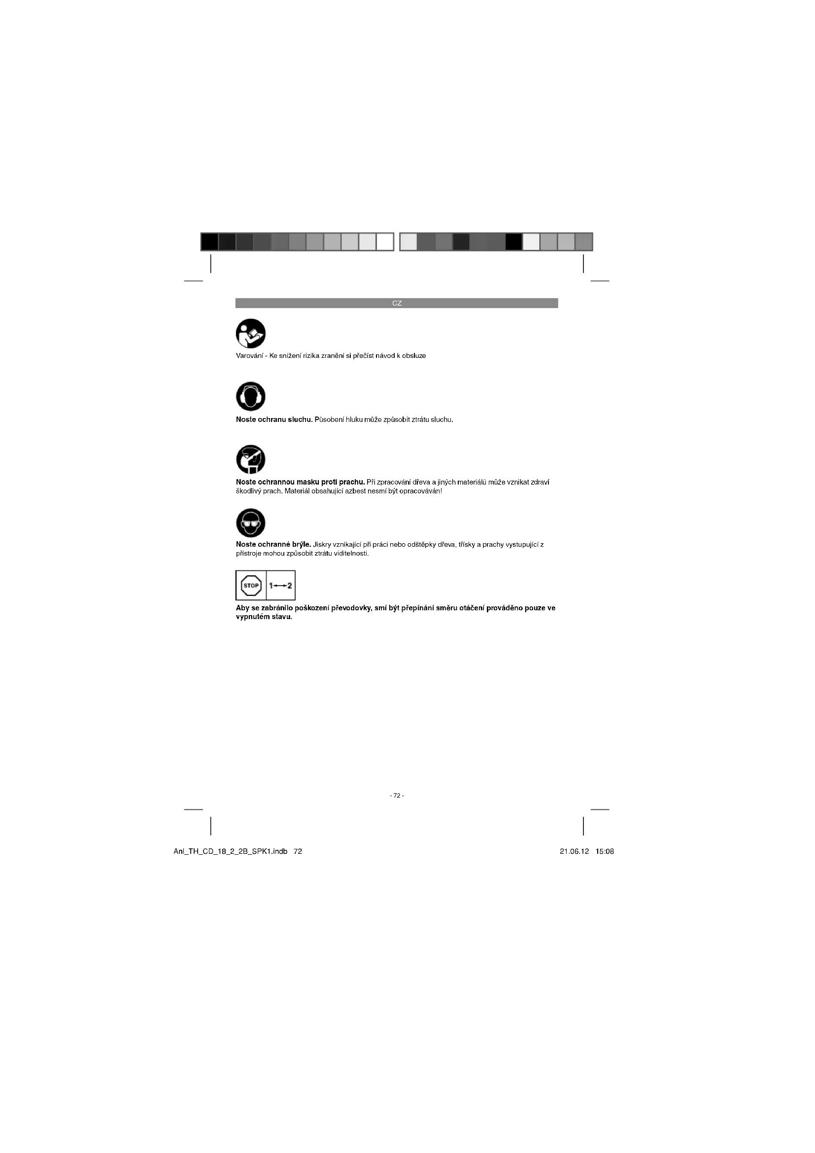 Varování - Ke snížení rizika zranění si přečíst návod k obsluze Noste ochranu sluchu. Působení hluku může způsobit ztrátu sluchu. Noste ochranné brýle. Jiskry vznikající při práci nebo odštěpky dřeva, třísky a prachy vystupující z přístroje mohou způsobit ztrátu viditelnosti. Noste ochrannou masku proti prachu. Při zpracování dřeva a jiných materiálů může vznikat zdraví škodlivý prach. Materiál obsahující azbest nesmí být opracováván! Aby se zabránilo poškození převodovky, smí být přepínání směru otáčení prováděno pouze ve vypnutém stavu. Anl_TH_CD_18_2_2B_SPK1.indb 72Anl_TH_CD_18_2_2B_SPK1.indb 72 21.06.12 15:0821.06.12 15:08CZ
