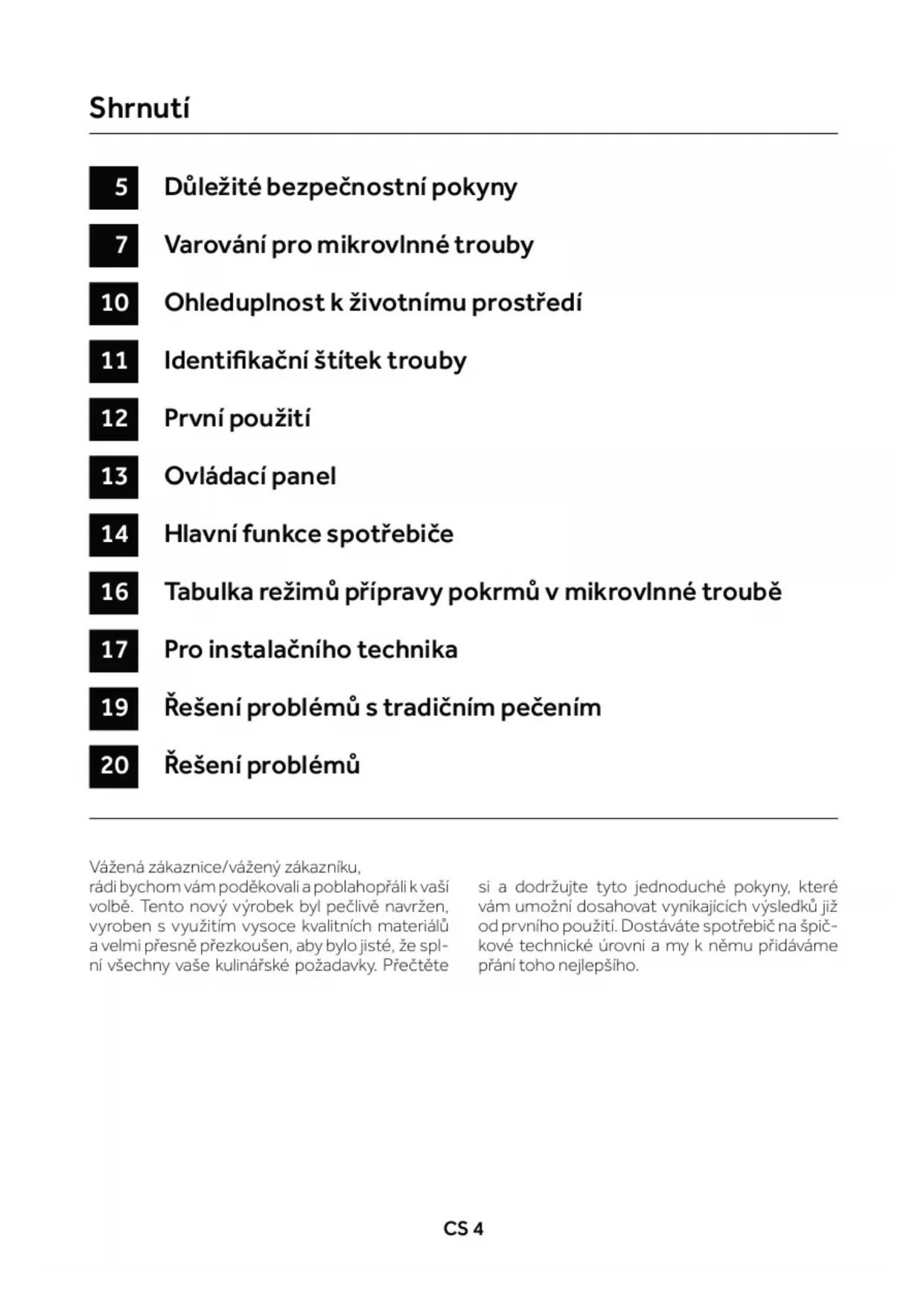 - Jestliže z trouby vychází kouř, vypněte spotřebič nebo jej odpojte od napájení a nechte dvířka zavřená, aby všechny plameny zhasly.CS 4 CS 5 Vážená zákaznice/vážený zákazníku, rádi bychom vám poděkovali a poblahopřáli k vaší volbě. Tento nový výrobek byl pečlivě navržen, vyroben s využitím vysoce kvalitních materiálů avelmi přesně přezkoušen, aby bylo jisté, že spl- ní všechny vaše kulinářské požadavky. Přečtěte si a dodržujte tyto jednoduché pokyny, které vám umožní dosahovat vynikajících výsledků již od prvního použití. Dostáváte spotřebič na špič- kové technické úrovni a my k němu přidáváme přání toho nejlepšího. Důležité bezpečnostní pokyny Varování pro mikrovlnné trouby Ohleduplnost k životnímu prostředí Identikační štítek trouby První použití Ovládací panel Hlavní funkce spotřebiče Tabulka režimů přípravy pokrmů v mikrovlnné troubě Pro instalačního technika Řešení problémů s tradičním pečením Řešení problémů